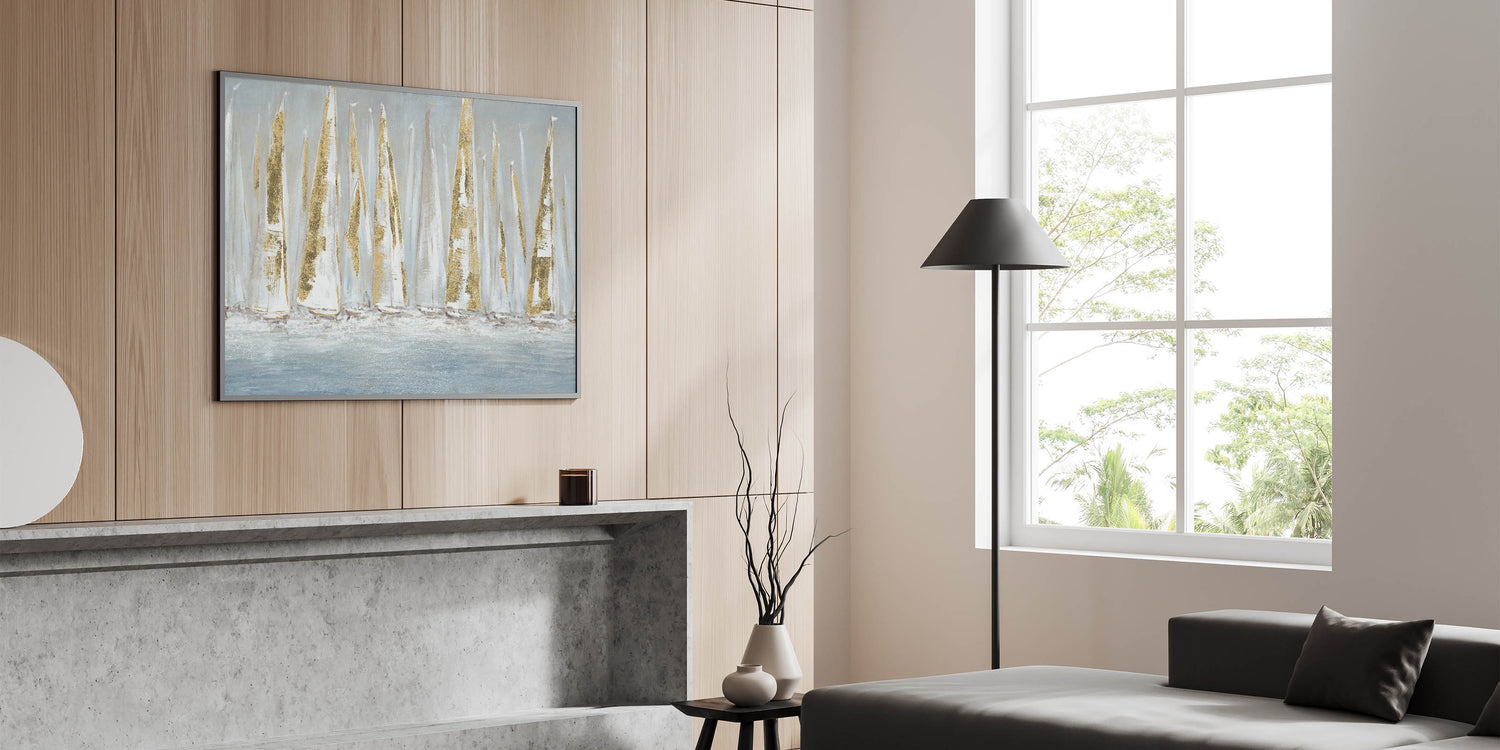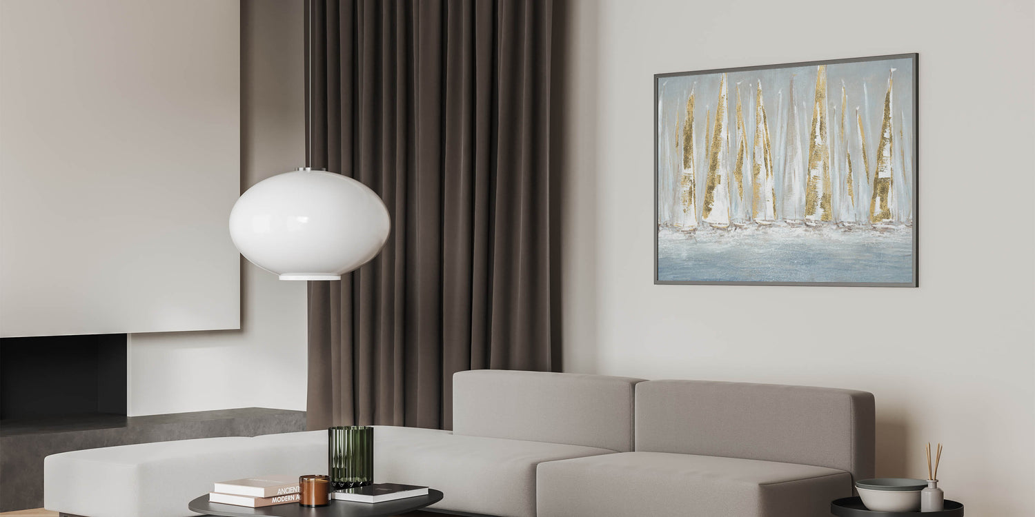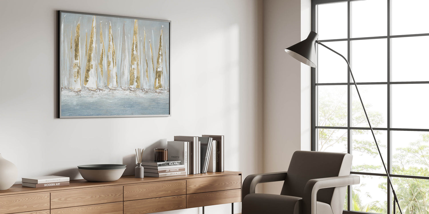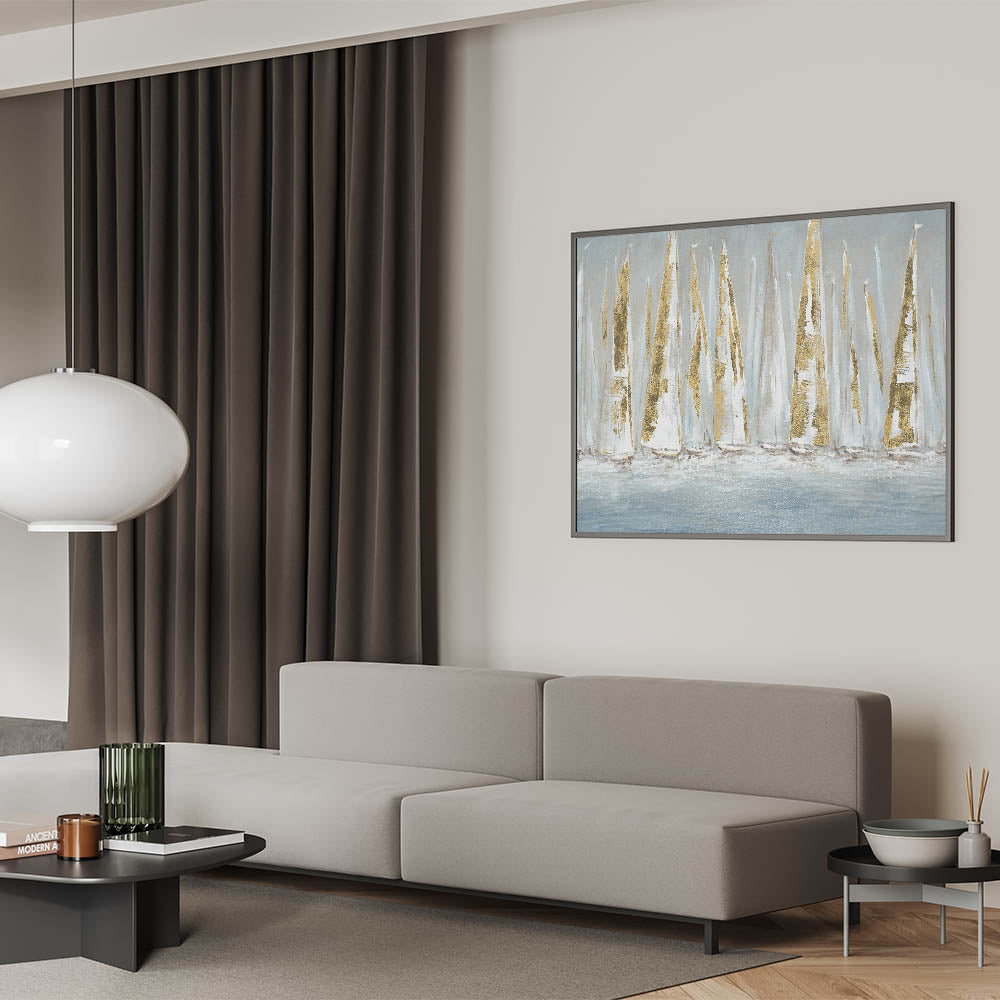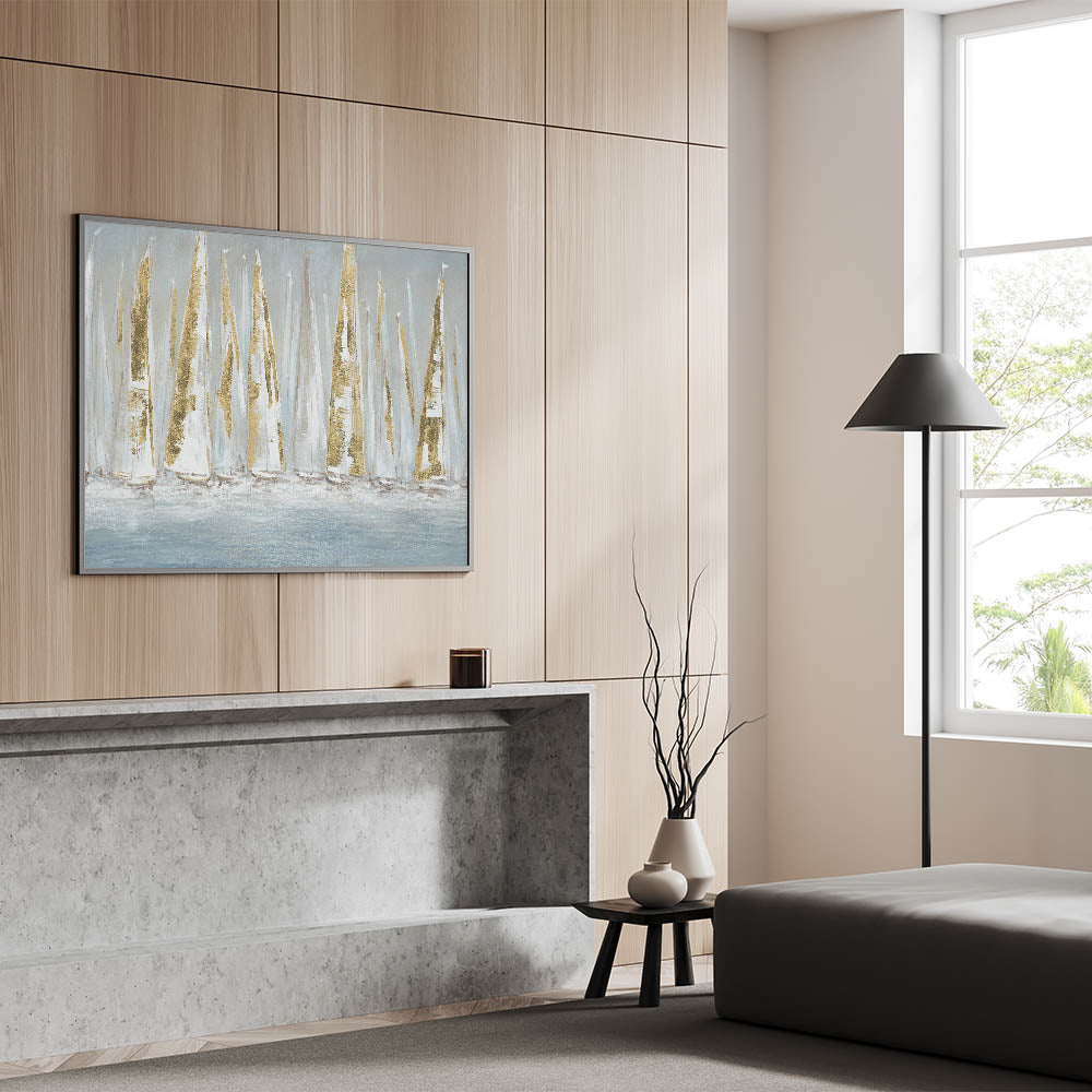 This calming landscape acrylic print adds sophistication and tranquility to any space. The gentle waves and golden sails create a serene and inviting atmosphere. Elevate your home with this peaceful scenery framed art, designed to bring the beauty of the sea indoors.