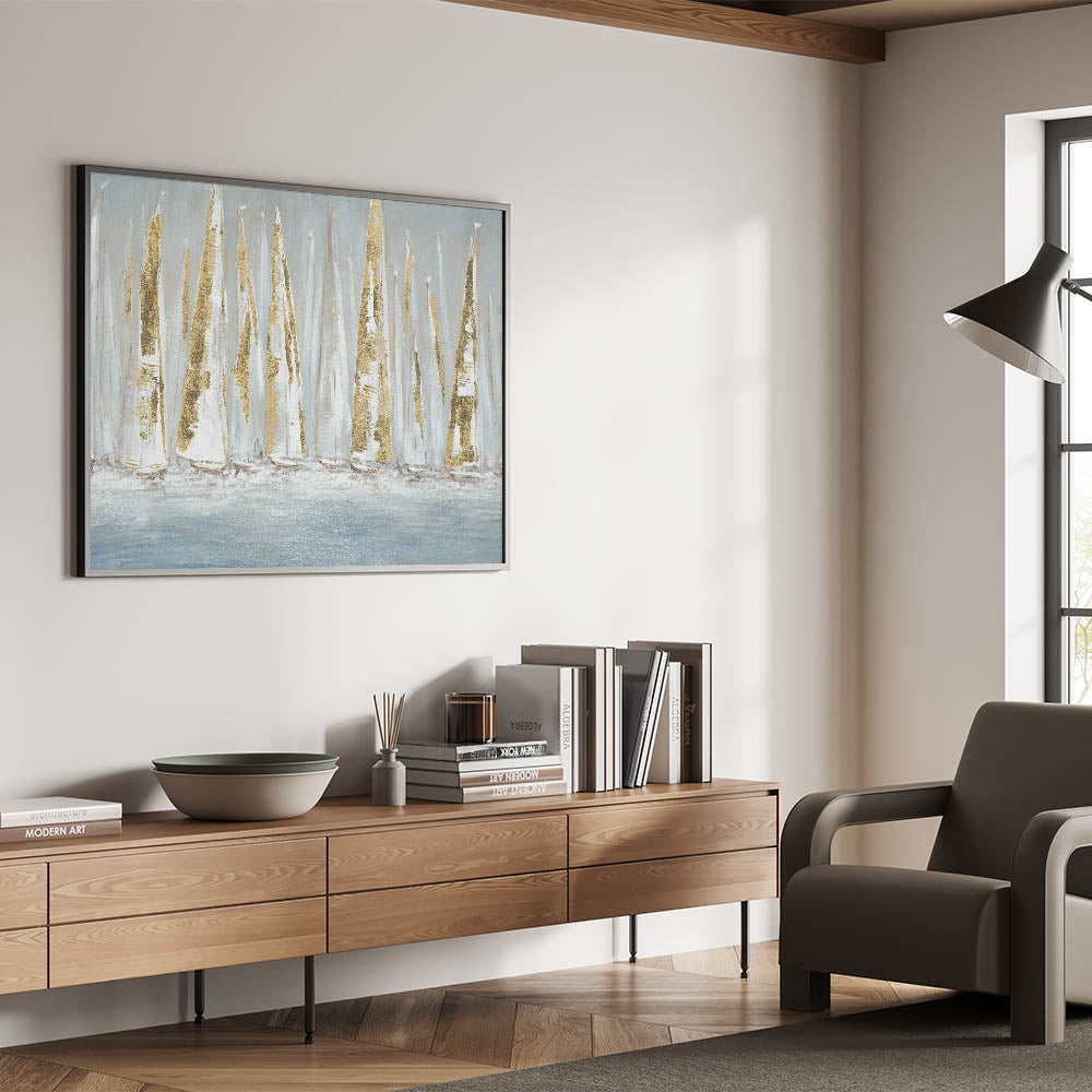 Bring a touch of coastal elegance to your space with this relaxing nature wall decor, featuring a stunning sailboat scene in soft blue, white, and gold. The delicate brushstrokes and shimmering accents create a tranquil nature scene, evoking the beauty of sailboats drifting on calm waters. This serene landscape photography print blends modern luxury with a peaceful maritime aesthetic.