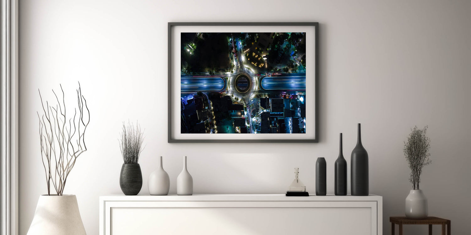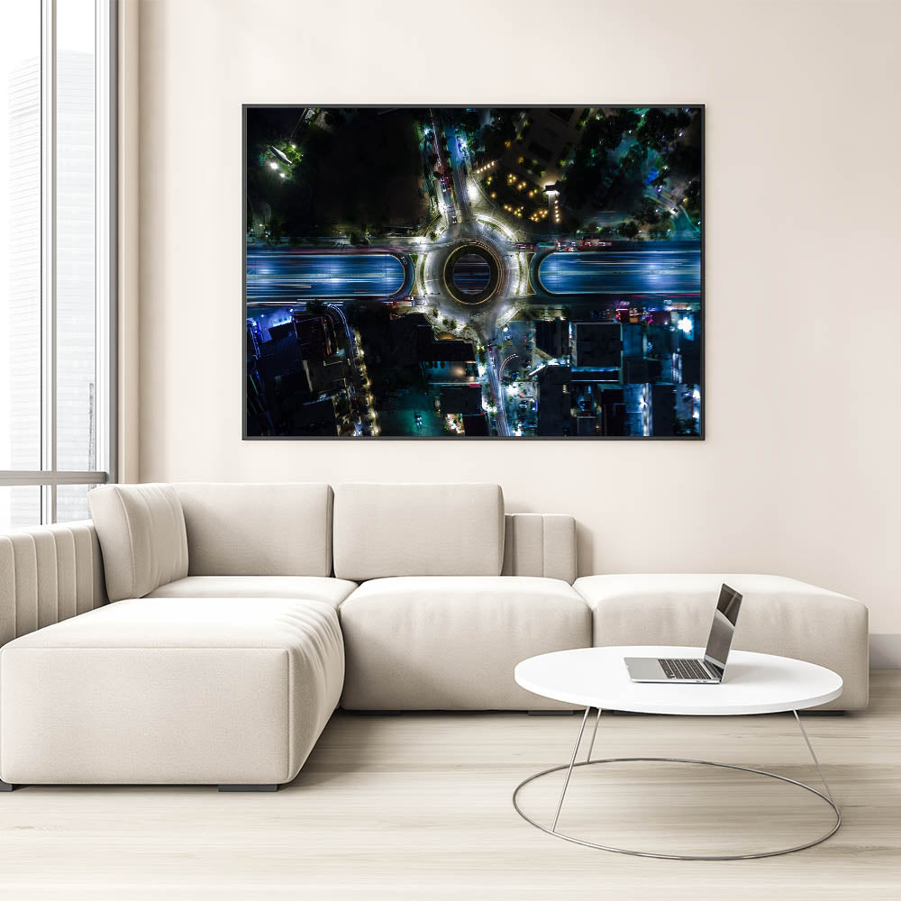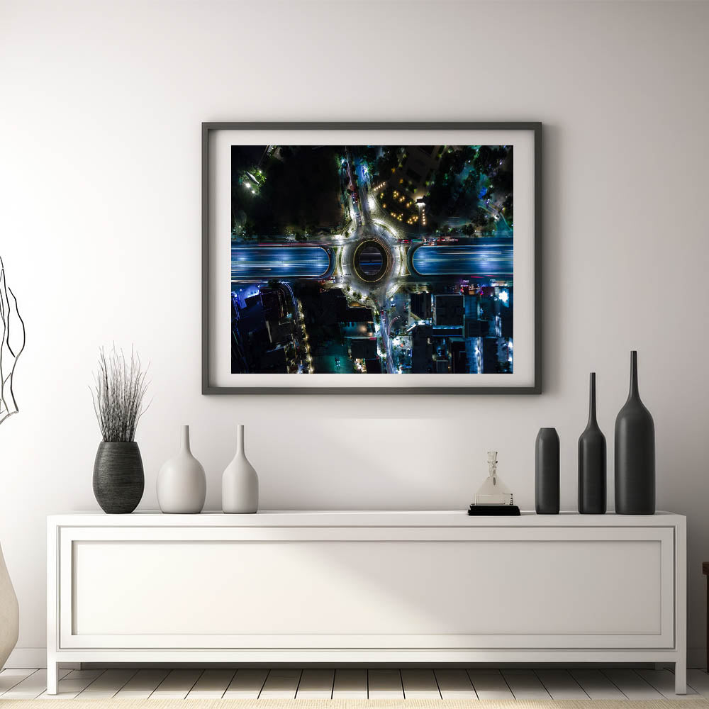 This stunning aerial view of Mexico City at night offers a unique perspective of the bustling city streets, illuminated with vibrant lights. The roundabout at the center of this image glows with energy as streaks of light from passing cars create a mesmerizing, dynamic effect. This artwork beautifully captures the movement and vitality of Mexico City, making it an ideal addition to any modern or urban-inspired decor.