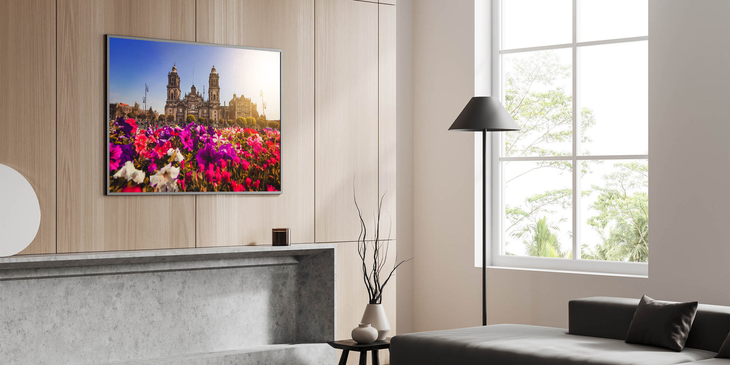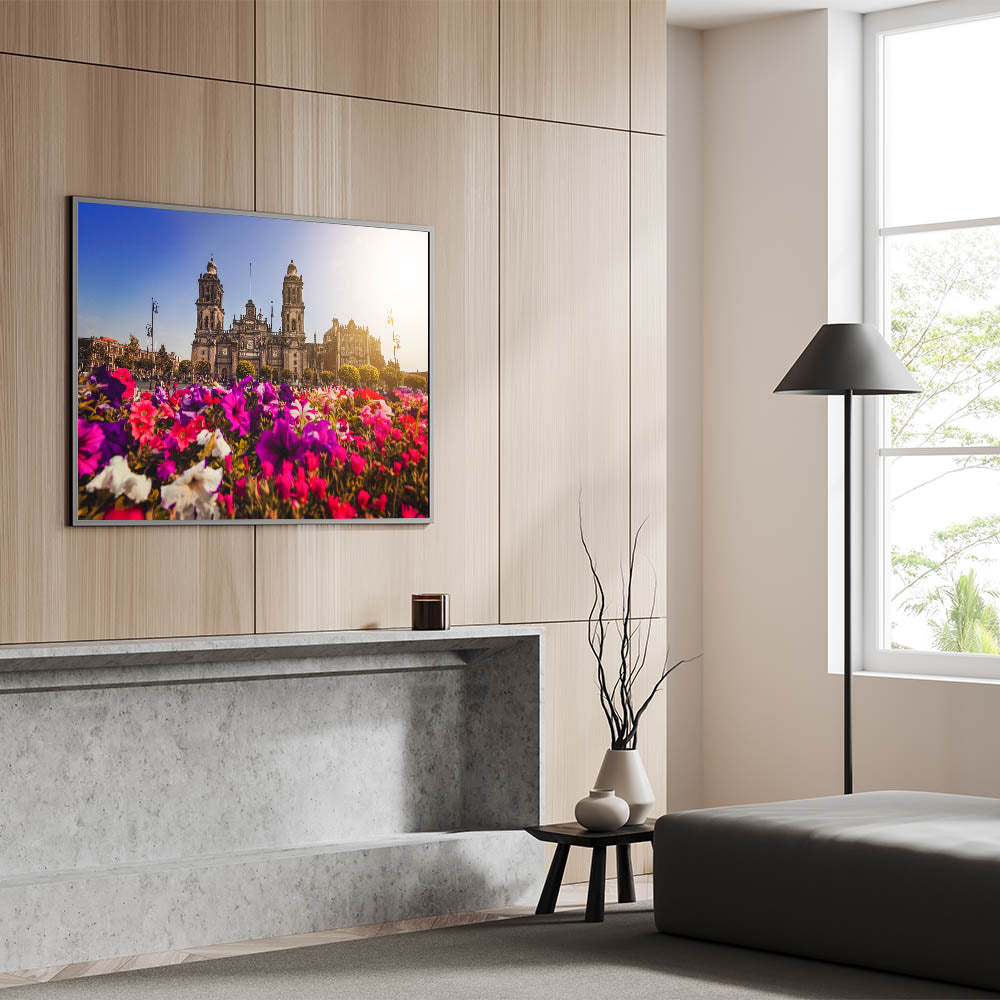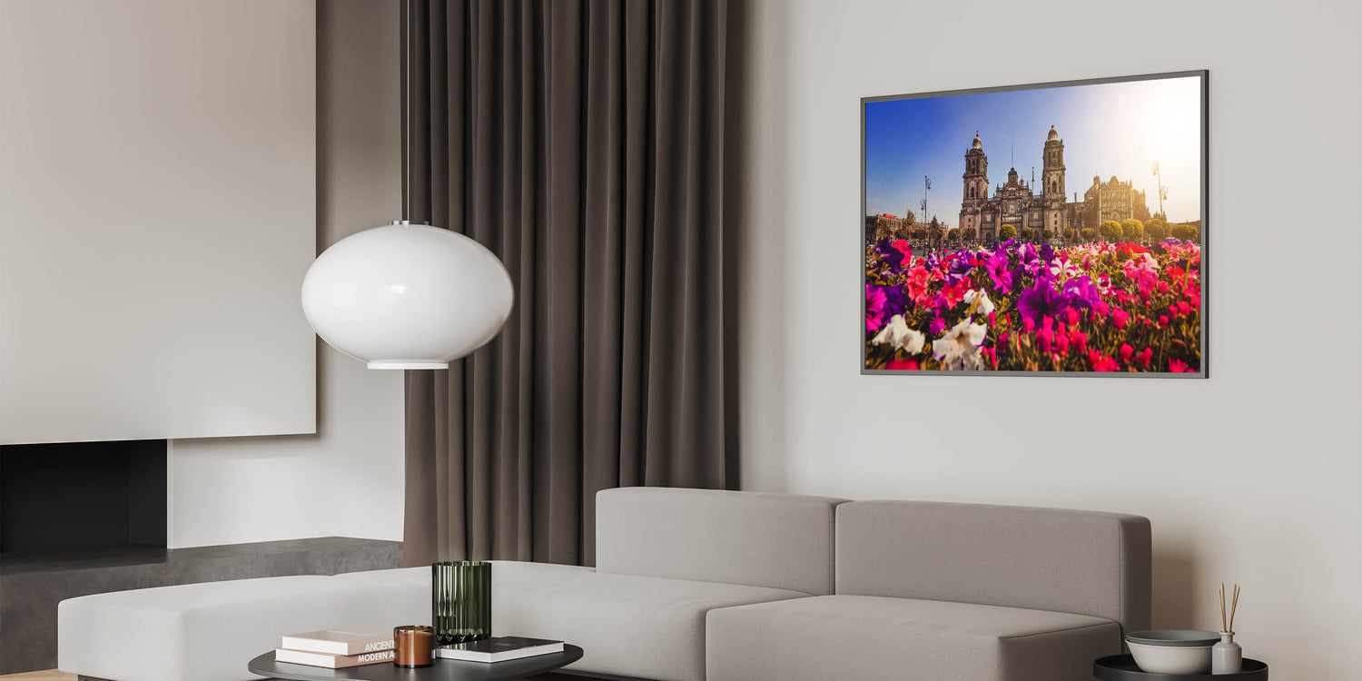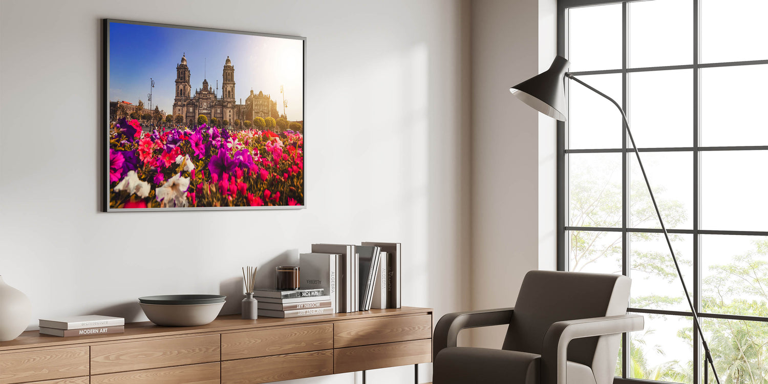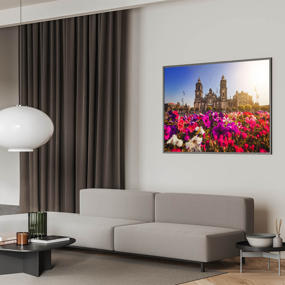 Add a touch of vibrancy and history to your decor with this stunning Mexico City landscape print. Featuring a beautiful view of the Metropolitan Cathedral framed by vibrant, colorful flowers, this artwork captures the essence of Mexico's rich culture and architectural heritage. The blend of nature and historic architecture creates a perfect harmony, making this print ideal for both art lovers and those passionate about Mexican culture.