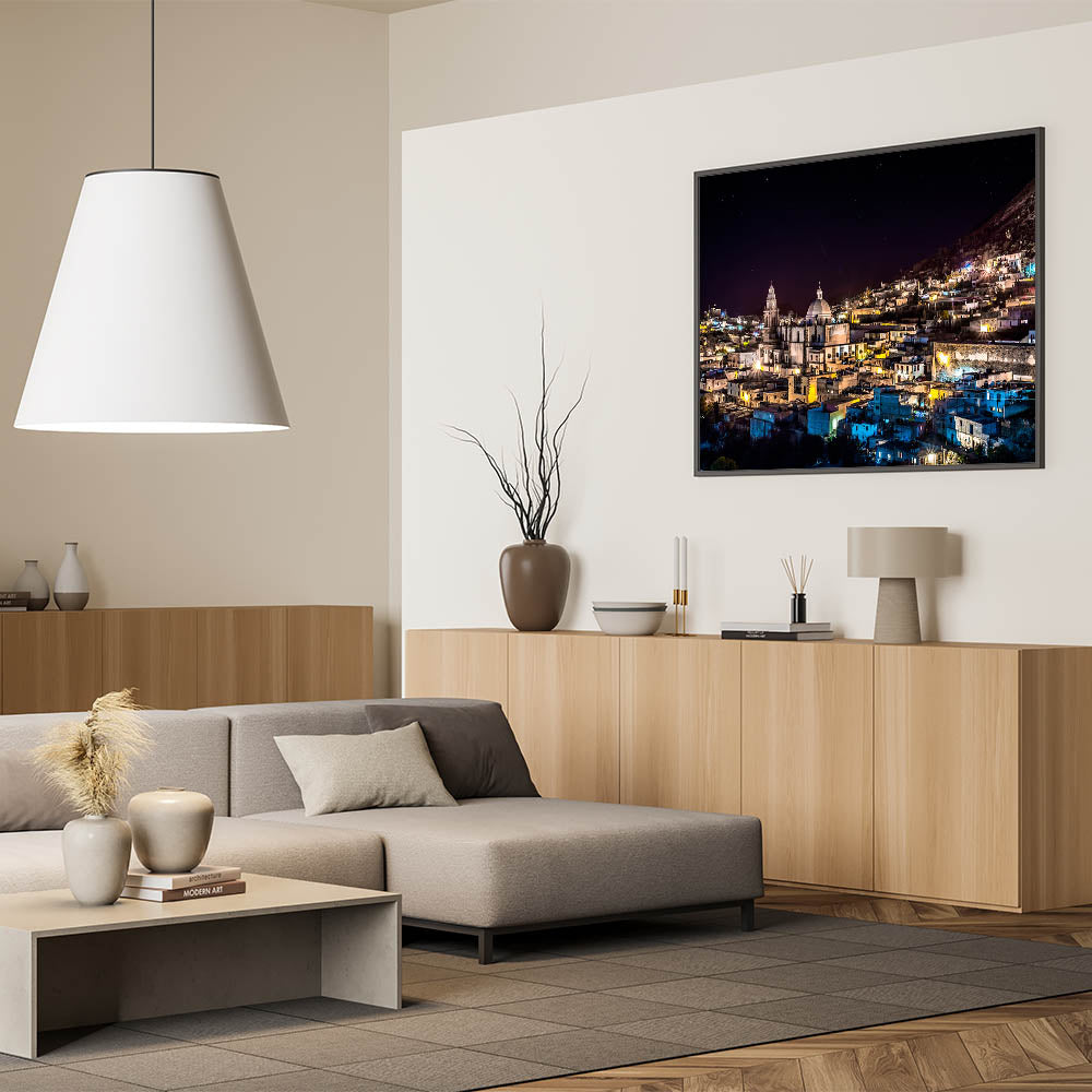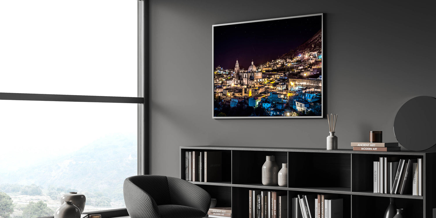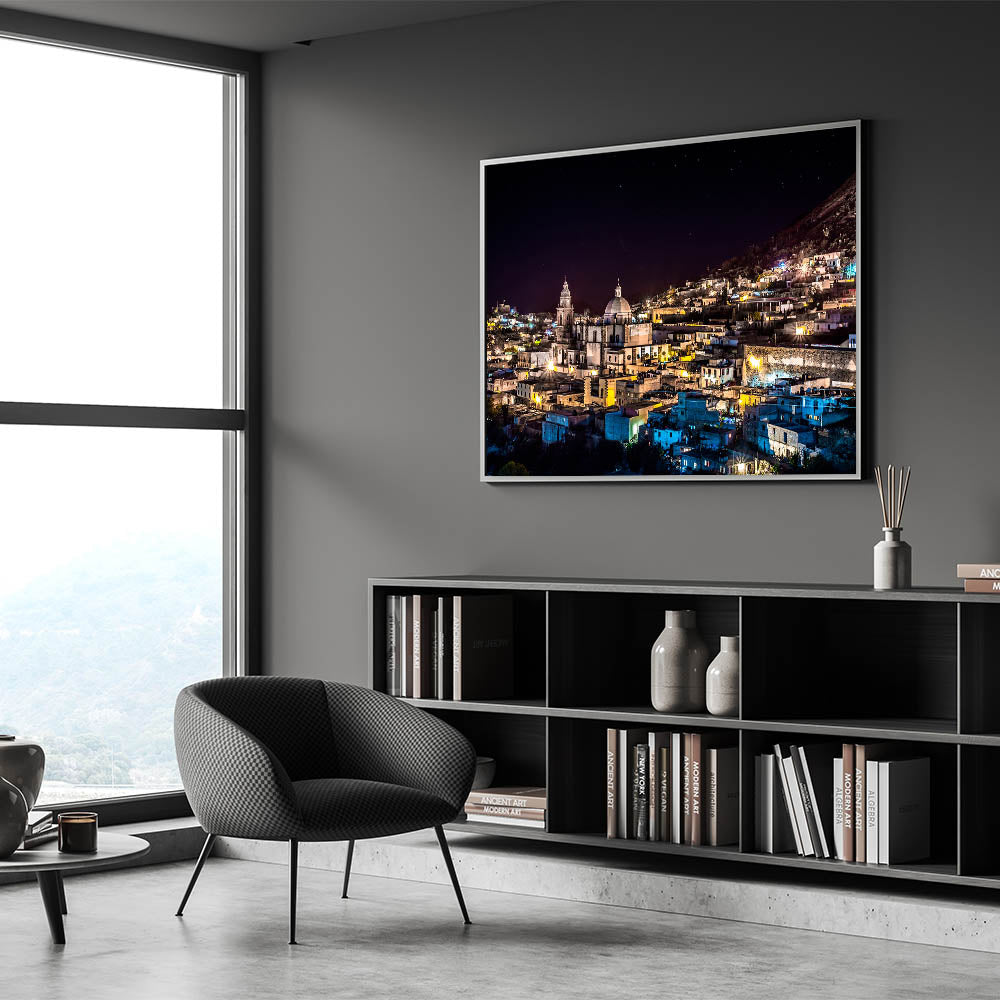 Experience the breathtaking beauty of Mexico City's historic hillside at night with this stunning wall art. Illuminated buildings scattered across the hill create a mesmerizing scene, while the starry night sky adds an element of tranquility. This piece captures the architectural charm of Mexico's heritage, combined with the peacefulness of a quiet night, making it perfect for those who appreciate both culture and serenity in their decor.