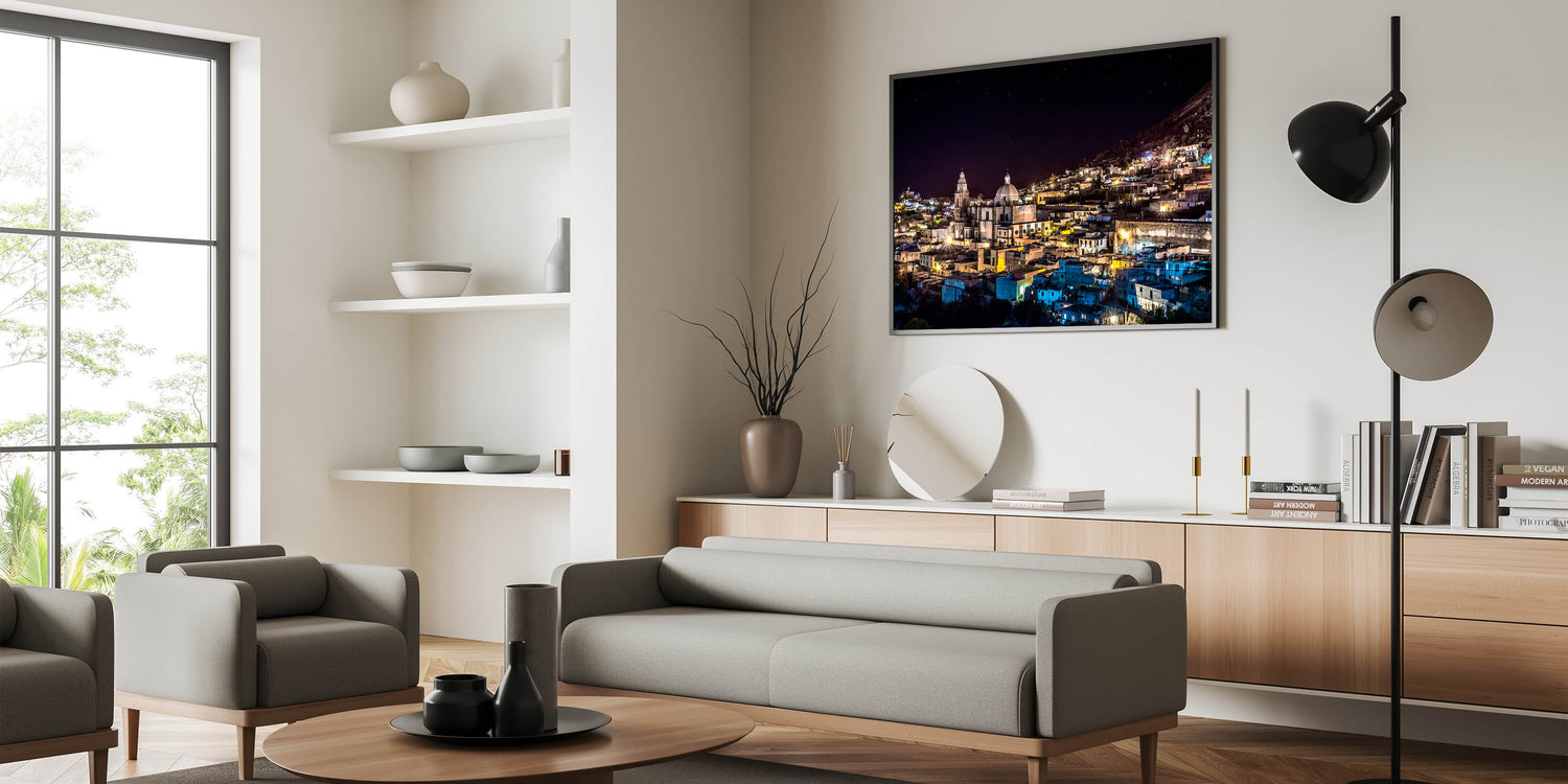 • High-quality Mexico City night skyline art available in Stretched Canvas, Framed Canvas, Acrylic Glass, Framed Acrylic Glass, Framed Print, Rolled Canvas, and Rolled Print.