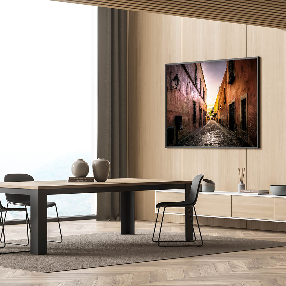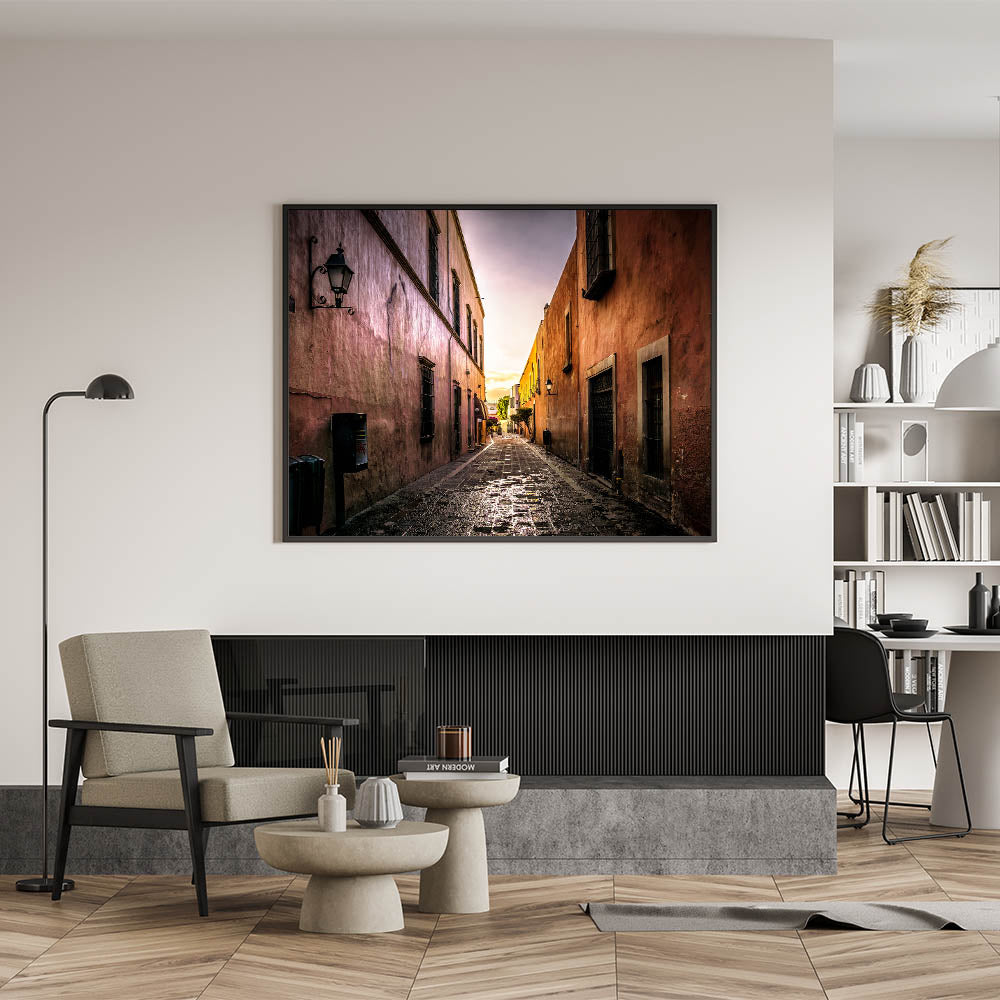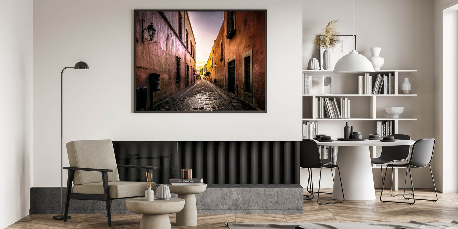 Capture the tranquil beauty of a quiet Mexico City alleyway with this stunning wall art. Bathed in the golden hues of the setting sun, this art piece highlights the rustic charm of the city’s historic architecture. The soft light enhances the textures of the old buildings, creating a nostalgic and peaceful atmosphere that transports you to the heart of Mexico City’s streets.