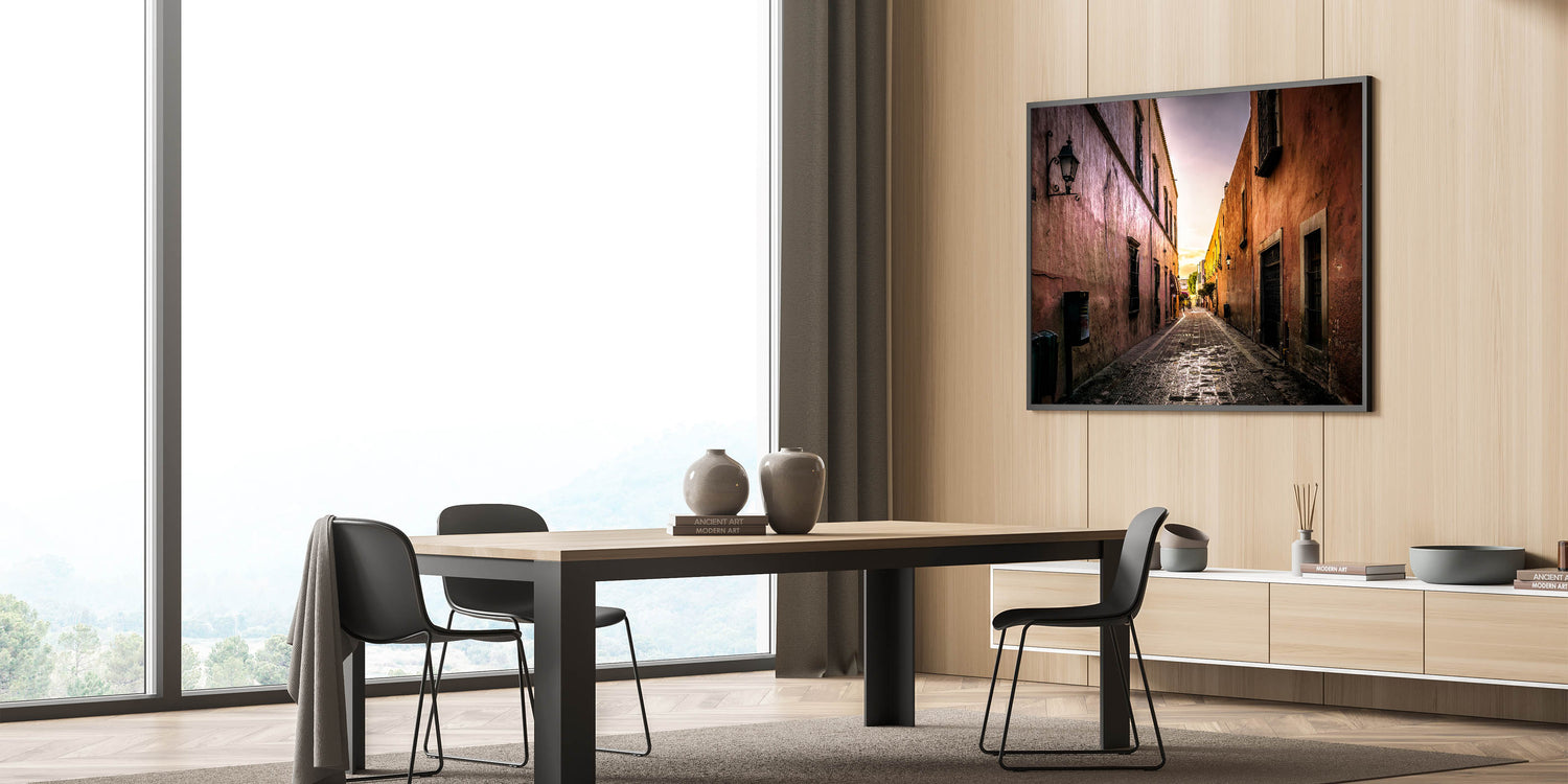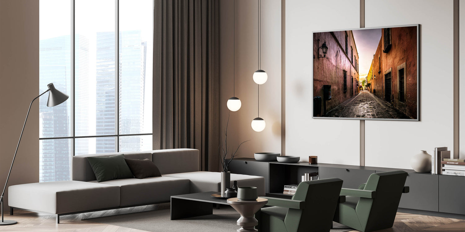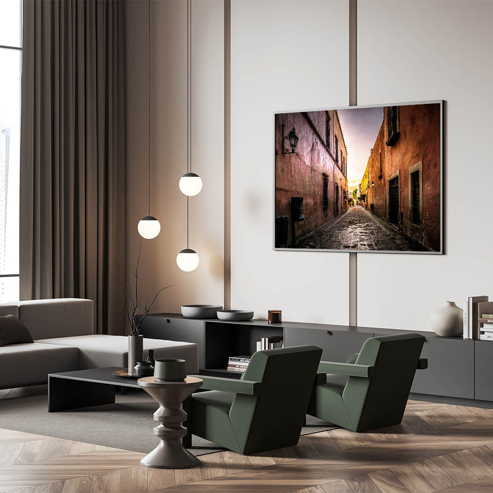 Capture the tranquil beauty of a quiet Mexico City alleyway with this stunning wall art. Bathed in the golden hues of the setting sun, this art piece highlights the rustic charm of the city’s historic architecture. The soft light enhances the textures of the old buildings, creating a nostalgic and peaceful atmosphere that transports you to the heart of Mexico City’s streets.
