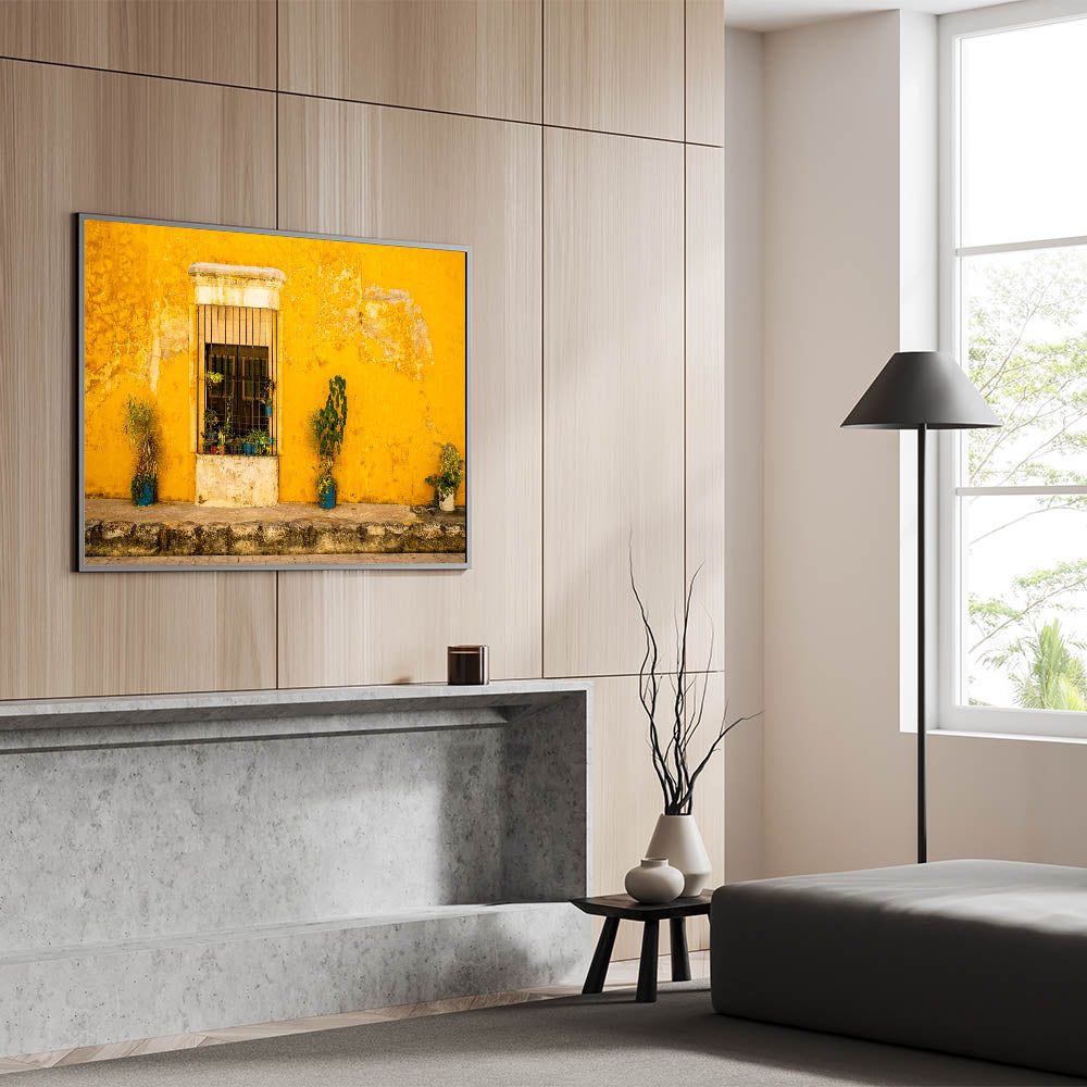 • Depicts a vivid yellow building façade adorned with charming green potted plants, perfect for adding a touch of warmth and cultural elegance to any space.