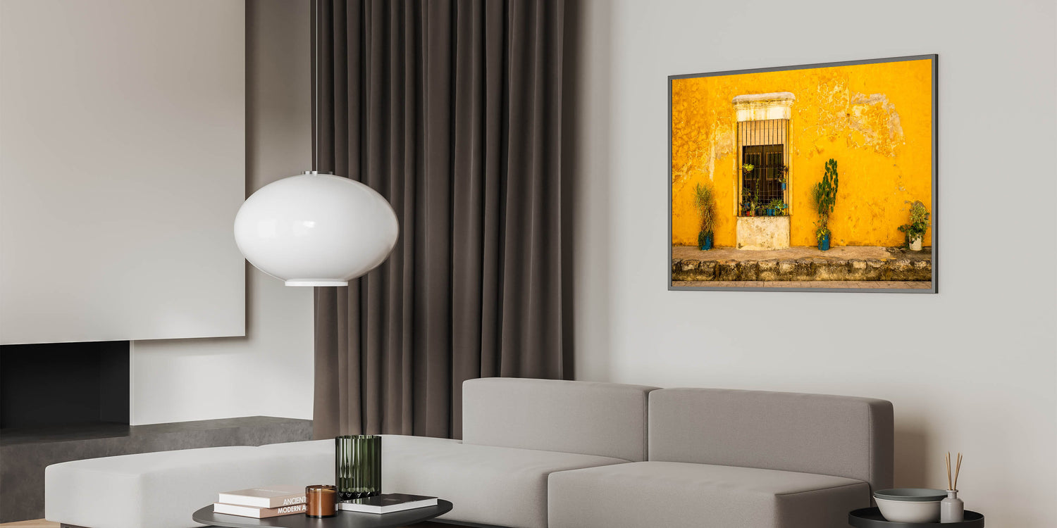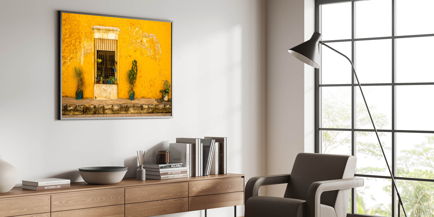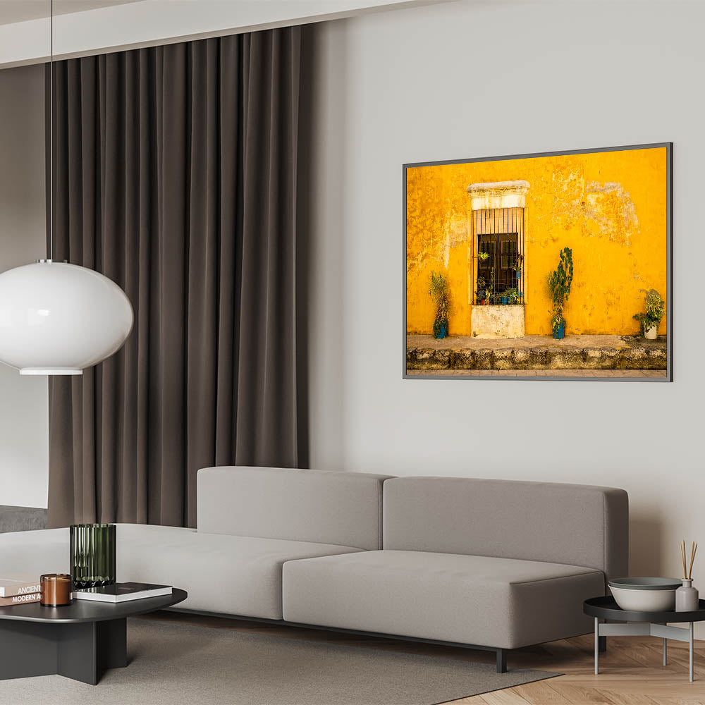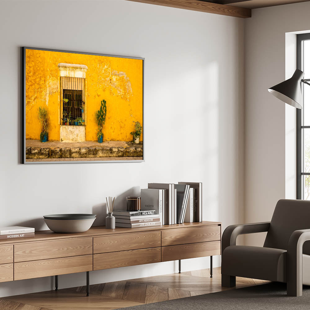 Add a splash of vibrant color to your space with this stunning wall art featuring a bright yellow building façade in Mexico City, accented with green potted plants. The contrast between the vivid yellow walls and the greenery creates a captivating visual experience, highlighting the rustic charm of Mexican architecture. This artwork beautifully captures the essence of Mexico’s cultural heritage and lively streets, making it a perfect piece for any home or office.