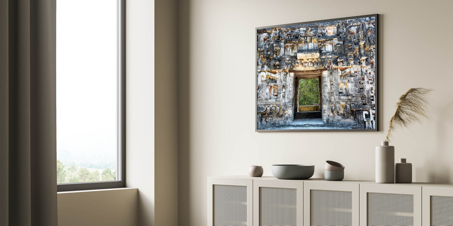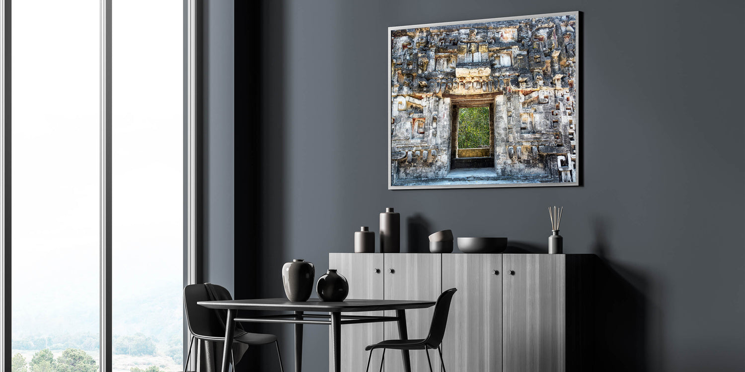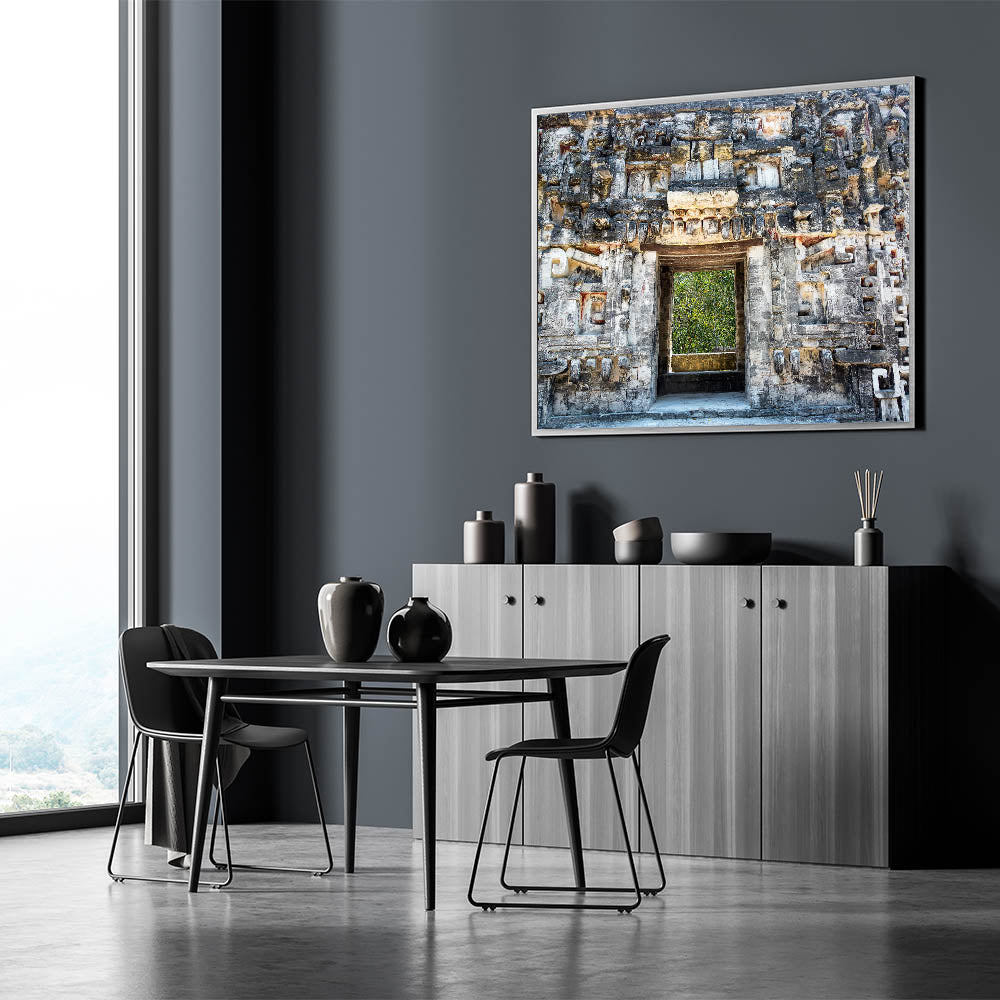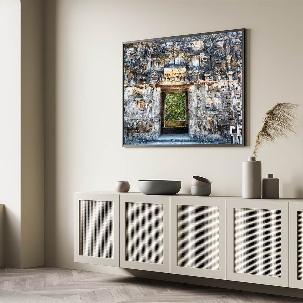 Step into the history of the ancient Mayan civilization with this stunning Mayan Ruins art. This Mexico Yucatan print captures the intricate stonework of a majestic Mayan structure, showcasing the architectural brilliance of the ancient Yucatan Peninsula. The fine details of the stone carvings tell the story of a rich cultural heritage, making this artwork an ideal choice for history lovers and admirers of Mexican cultural art. Whether you're decorating your living room, office, or study, this Yucatan canvas art adds a touch of historic beauty to any space.