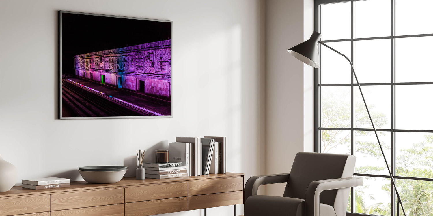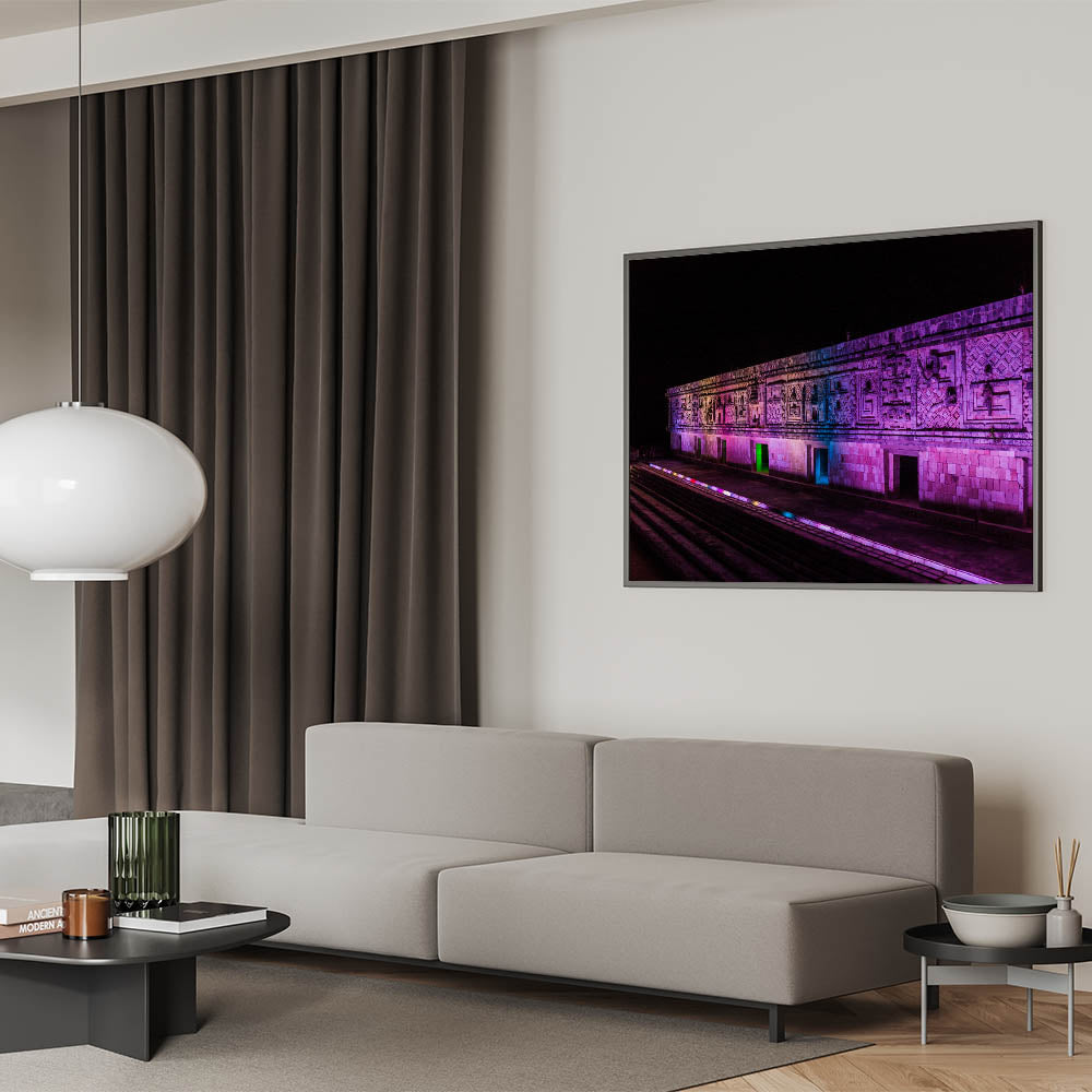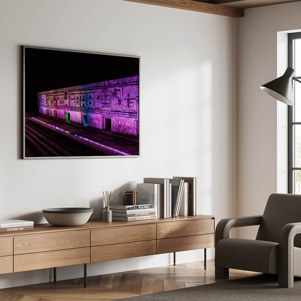 Experience the awe-inspiring beauty of ancient Mayan architecture with this stunning illuminated Mayan ruins art. This Yucatan print captures the intricate details of the stone carvings, enhanced by a vibrant play of colored lights that breathe life into the structure at night. The dramatic lighting adds a modern twist to the ancient design, making this Mexico Yucatan print a striking piece for those who appreciate cultural heritage and architectural beauty. Ideal for living spaces, offices, or galleries, this Yucatan canvas art brings a fusion of history and modern aesthetics into your home.