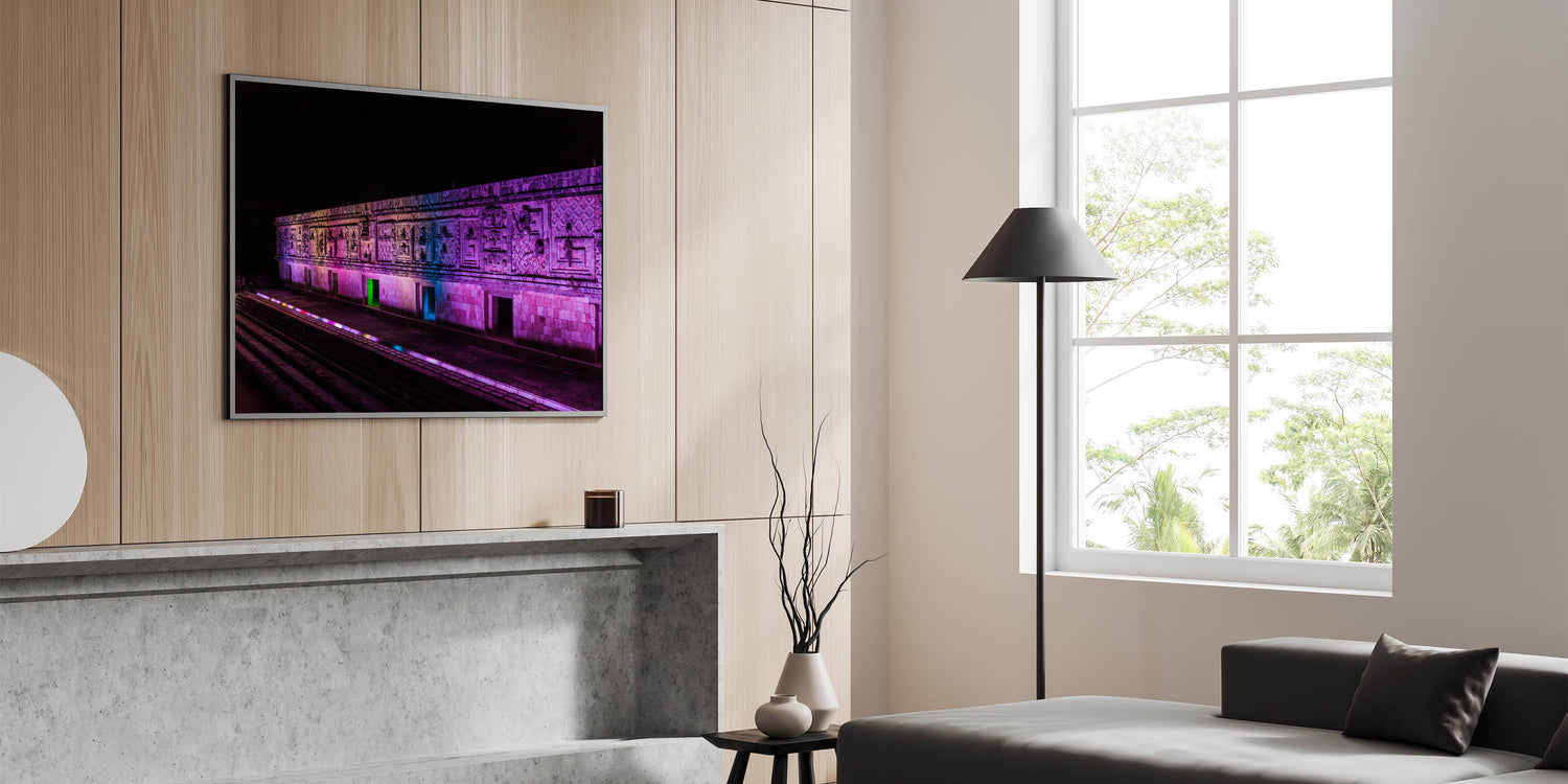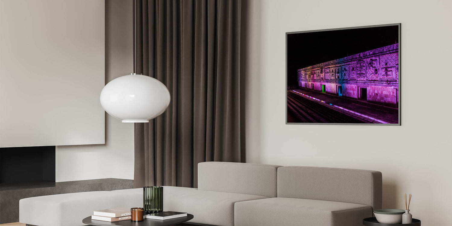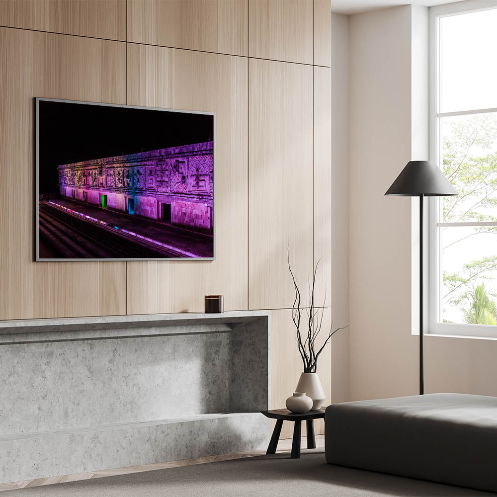 Experience the awe-inspiring beauty of ancient Mayan architecture with this stunning illuminated Mayan ruins art. This Yucatan print captures the intricate details of the stone carvings, enhanced by a vibrant play of colored lights that breathe life into the structure at night. The dramatic lighting adds a modern twist to the ancient design, making this Mexico Yucatan print a striking piece for those who appreciate cultural heritage and architectural beauty. Ideal for living spaces, offices, or galleries, this Yucatan canvas art brings a fusion of history and modern aesthetics into your home.