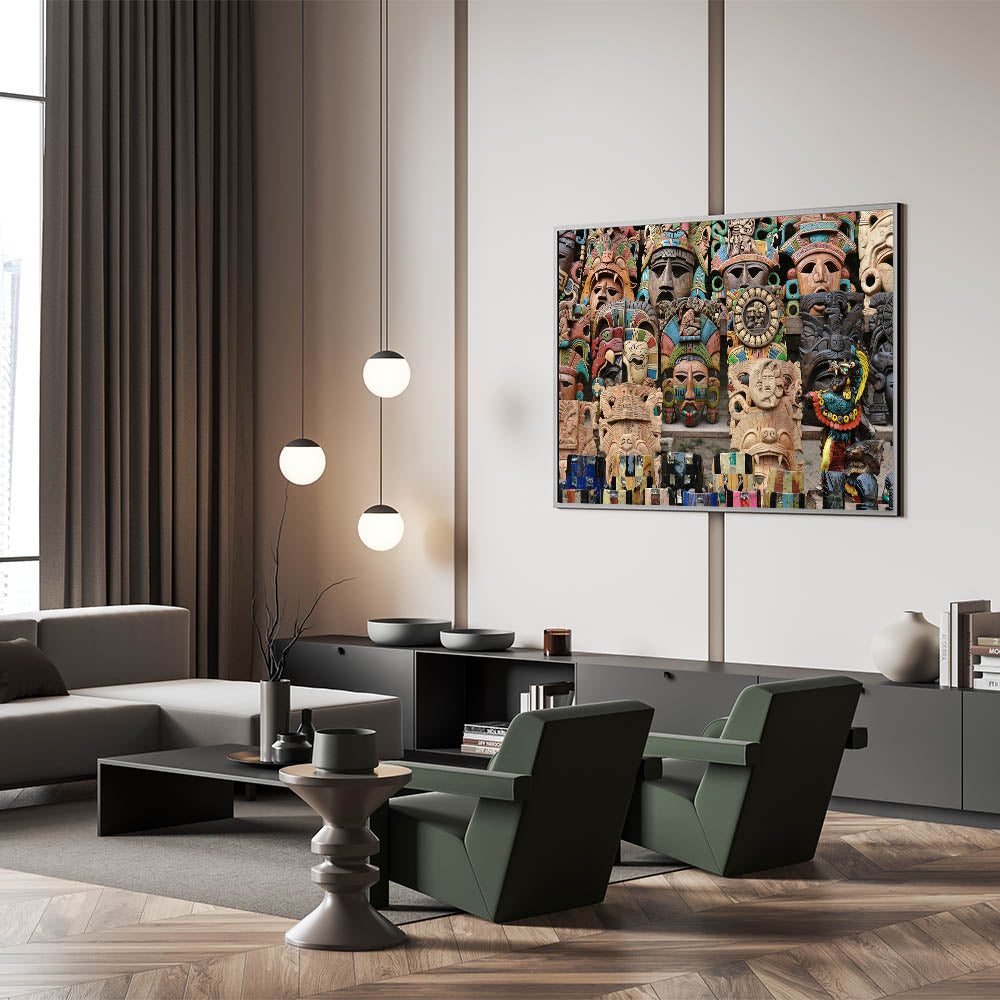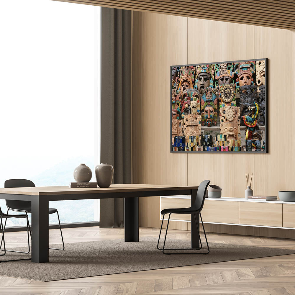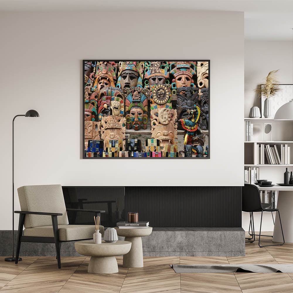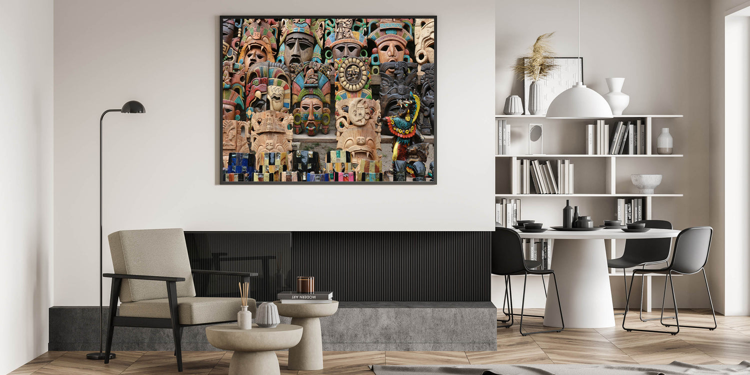Celebrate the rich and vibrant heritage of Mexico with this Yucatan Wall Art featuring traditional Mayan masks. This stunning Mexican cultural art piece captures the intricate craftsmanship and vivid colors that represent the essence of Yucatan’s ancient traditions. Each mask tells a story of Mayan history, making this Yucatan canvas art not only a decorative piece but also a cultural statement. Perfect for adding a bold, artistic touch to any room, this artwork brings the rich textures and vibrant hues of Mexican art into your home.