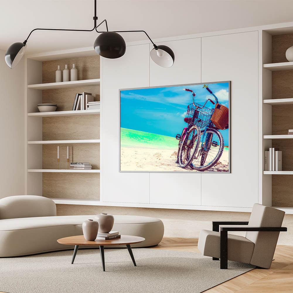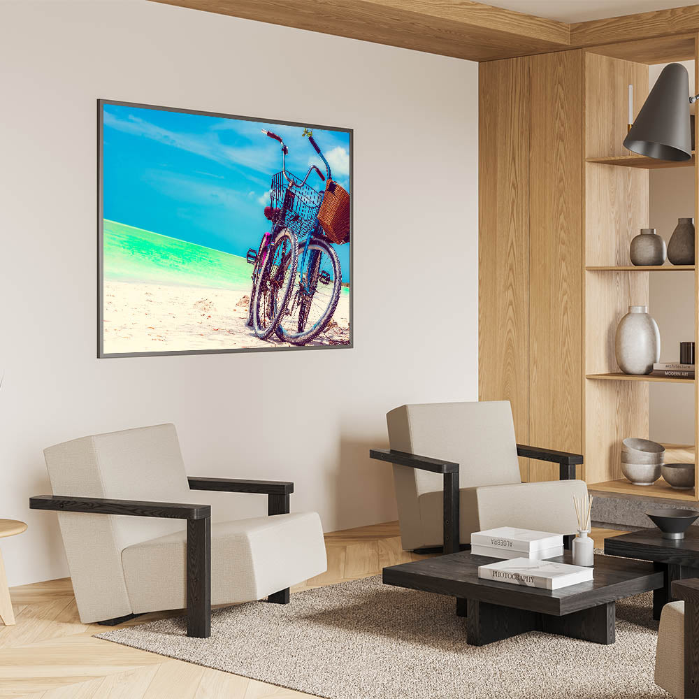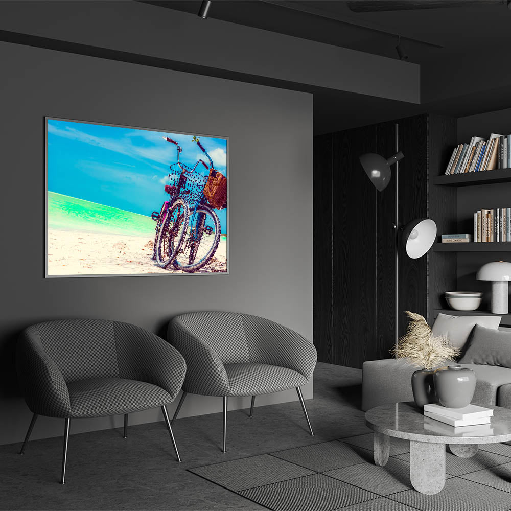 Capture the serene beauty of the Yucatan Peninsula with this vibrant wall art, showcasing a pair of vintage bicycles against the backdrop of a stunning tropical beach. The bright turquoise waters and clear blue sky evoke a sense of calm and adventure, making this Yucatan travel photography a perfect addition to any home or office decor.