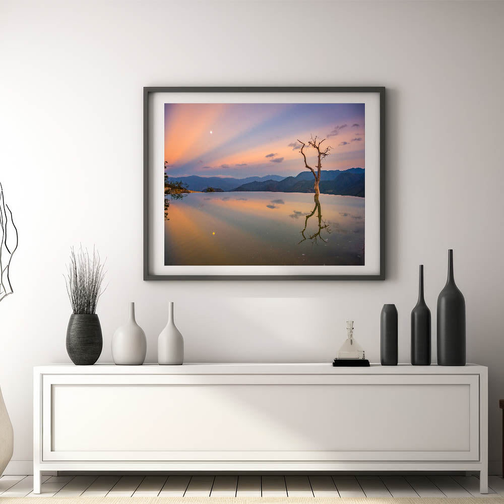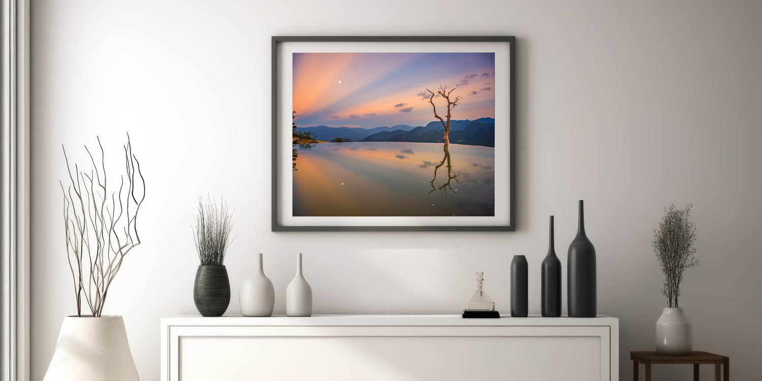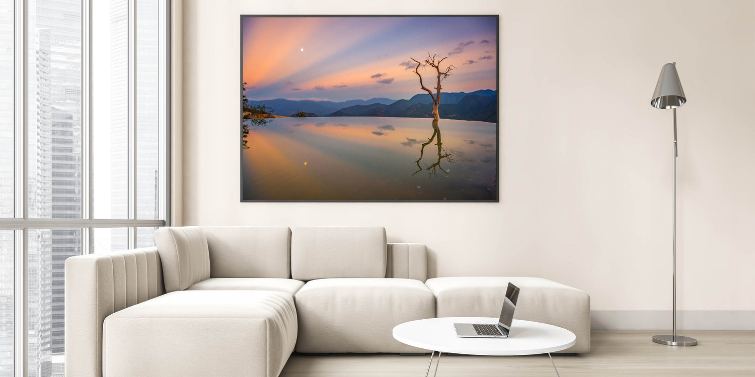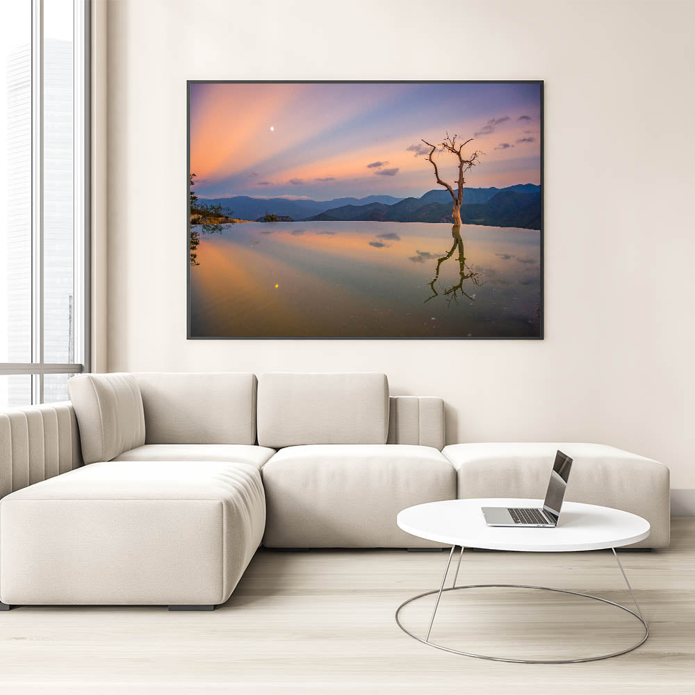 Capture the enchanting beauty of Oaxaca with this breathtaking wall art, showcasing a tranquil sunset over the serene waters of Hierve el Agua. The vivid hues of the sunset reflect perfectly in the still waters, with the silhouette of a lone tree creating a powerful focal point. The peaceful scene blends the natural beauty of Oaxaca’s landscape with the soft glow of dusk, making this artwork a stunning addition to any home or office.