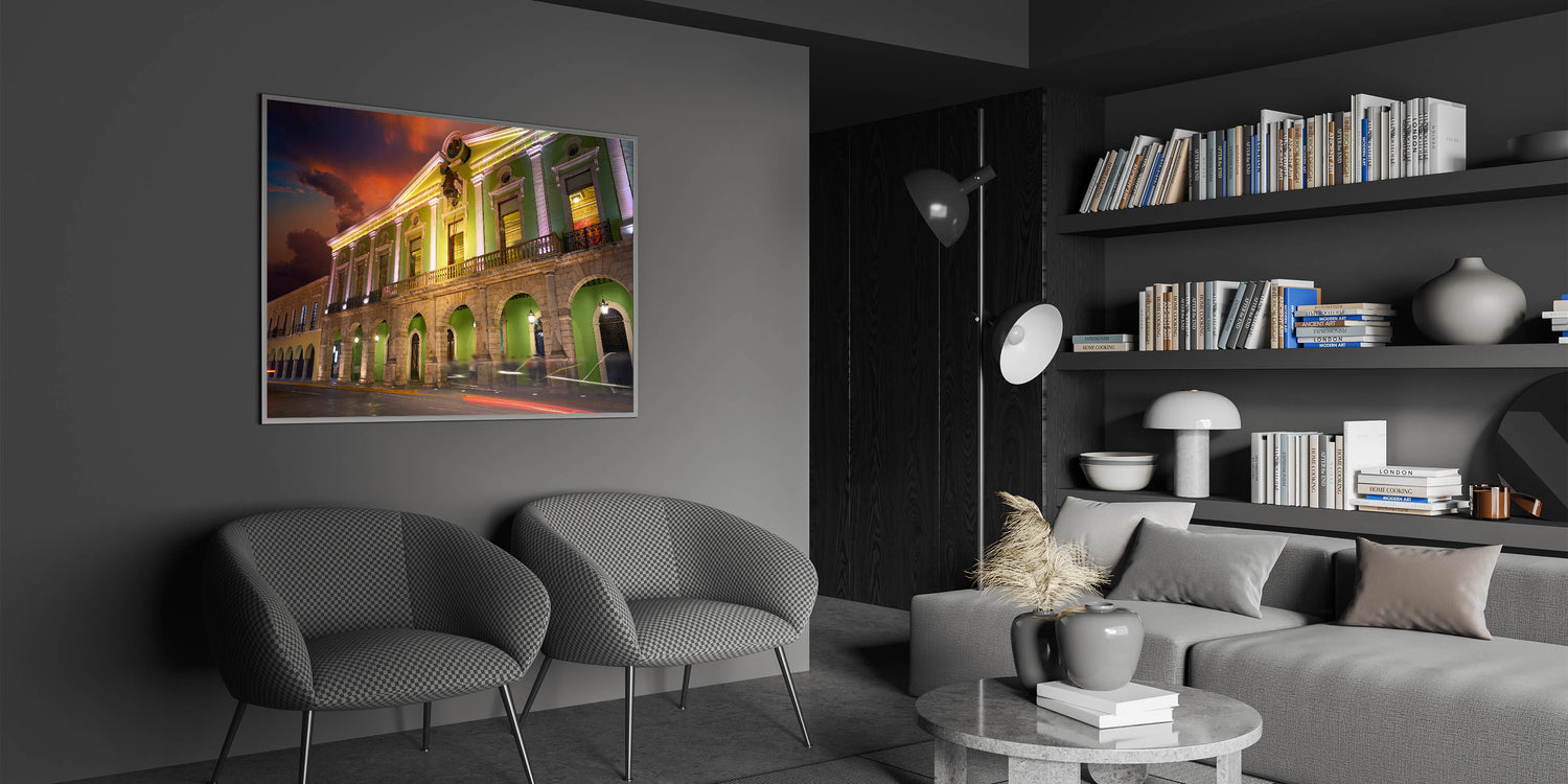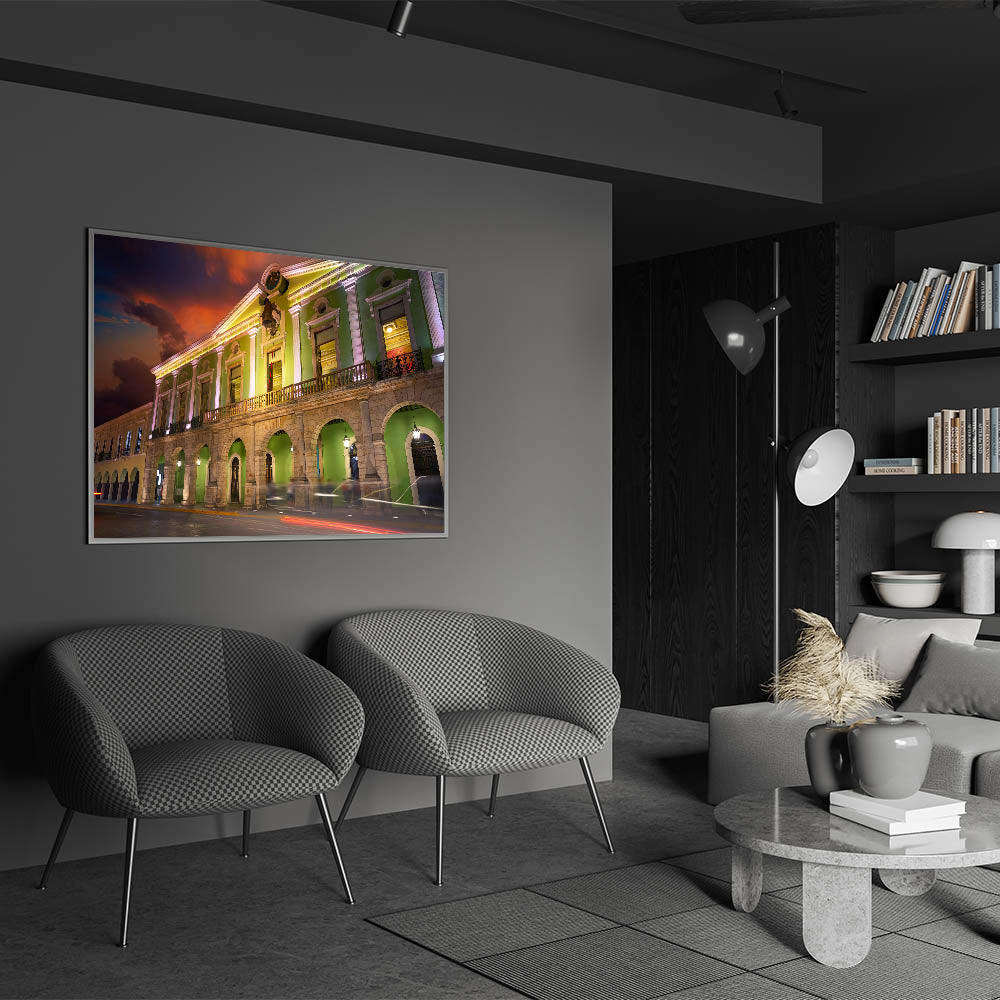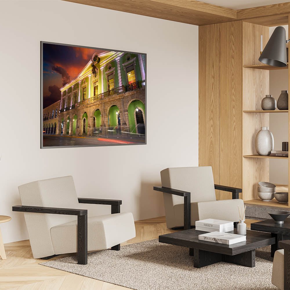 Celebrate the vibrant history and colonial architecture of Yucatan with this stunning Mexico Yucatan print. Featuring a beautifully illuminated building with vivid green tones, this Yucatan Peninsula decor captures the charm and elegance of the region’s historical structures. The contrast between the illuminated building and the dramatic sunset sky adds depth and a sense of grandeur to this artwork, making it perfect for lovers of Mexican culture and architecture. Whether you're decorating your living room, office, or hallway, this Yucatan canvas art will bring a touch of sophistication and cultural heritage to your space.
