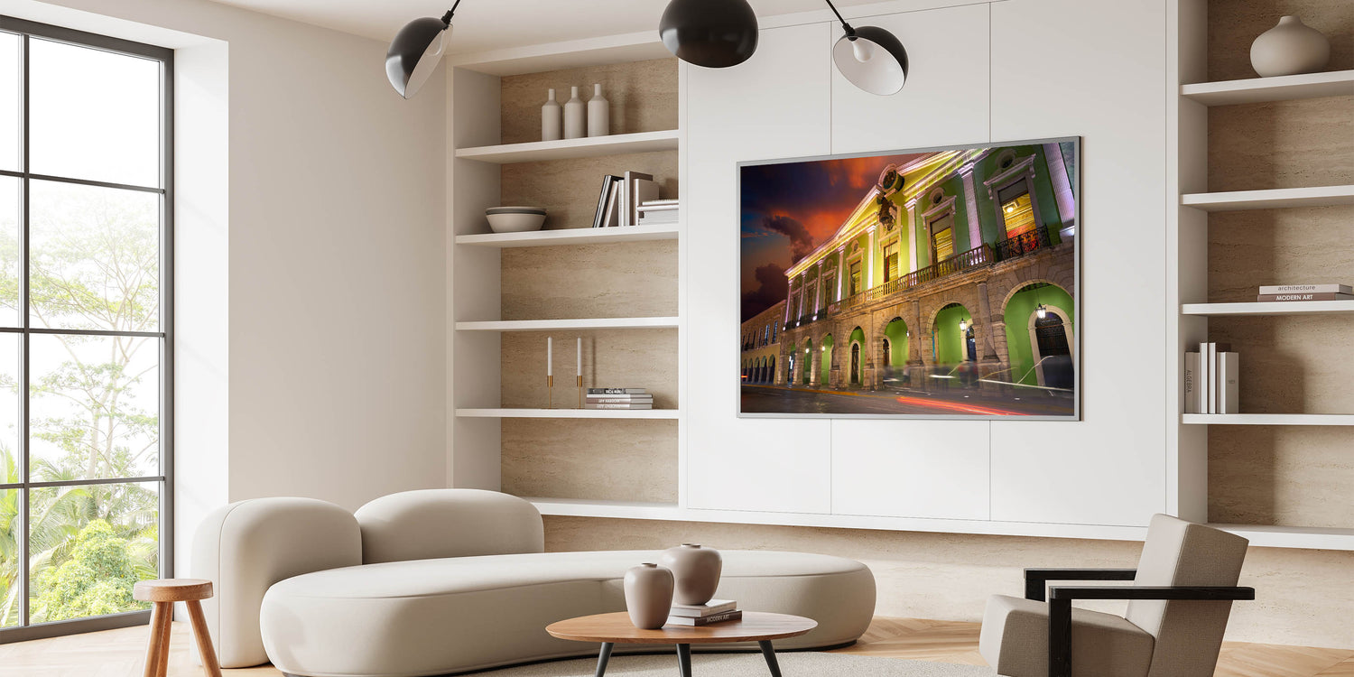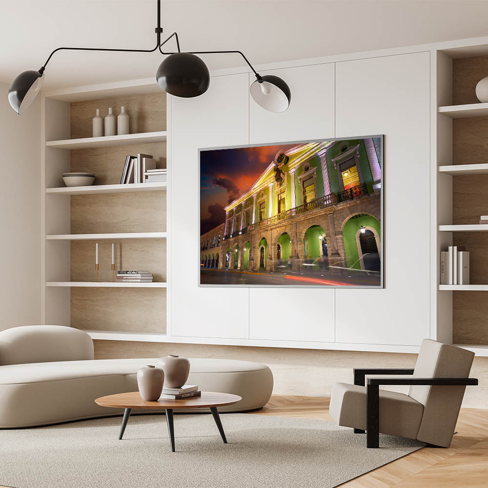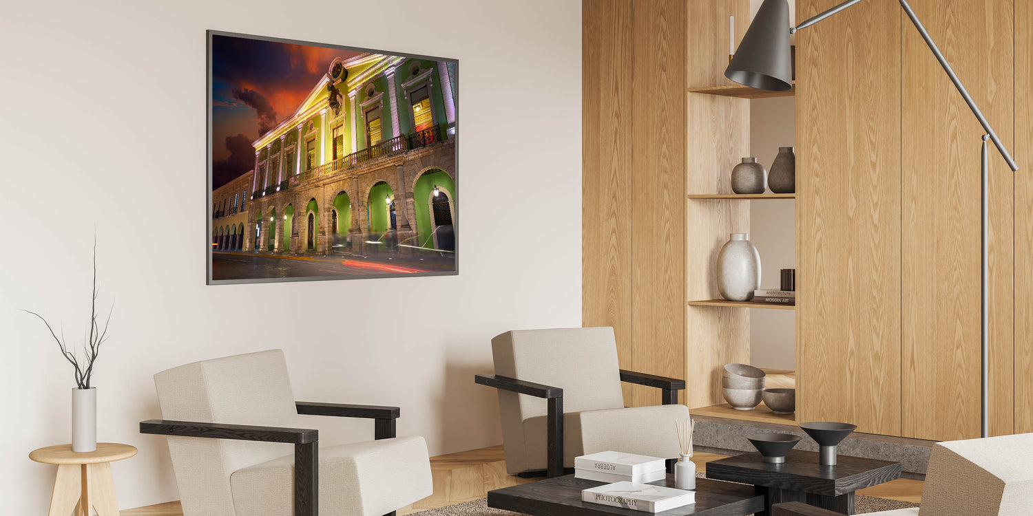 Celebrate the vibrant history and colonial architecture of Yucatan with this stunning Mexico Yucatan print. Featuring a beautifully illuminated building with vivid green tones, this Yucatan Peninsula decor captures the charm and elegance of the region’s historical structures. The contrast between the illuminated building and the dramatic sunset sky adds depth and a sense of grandeur to this artwork, making it perfect for lovers of Mexican culture and architecture. Whether you're decorating your living room, office, or hallway, this Yucatan canvas art will bring a touch of sophistication and cultural heritage to your space.
