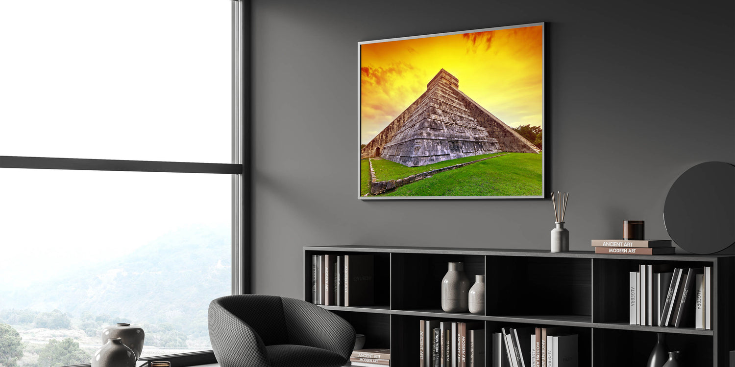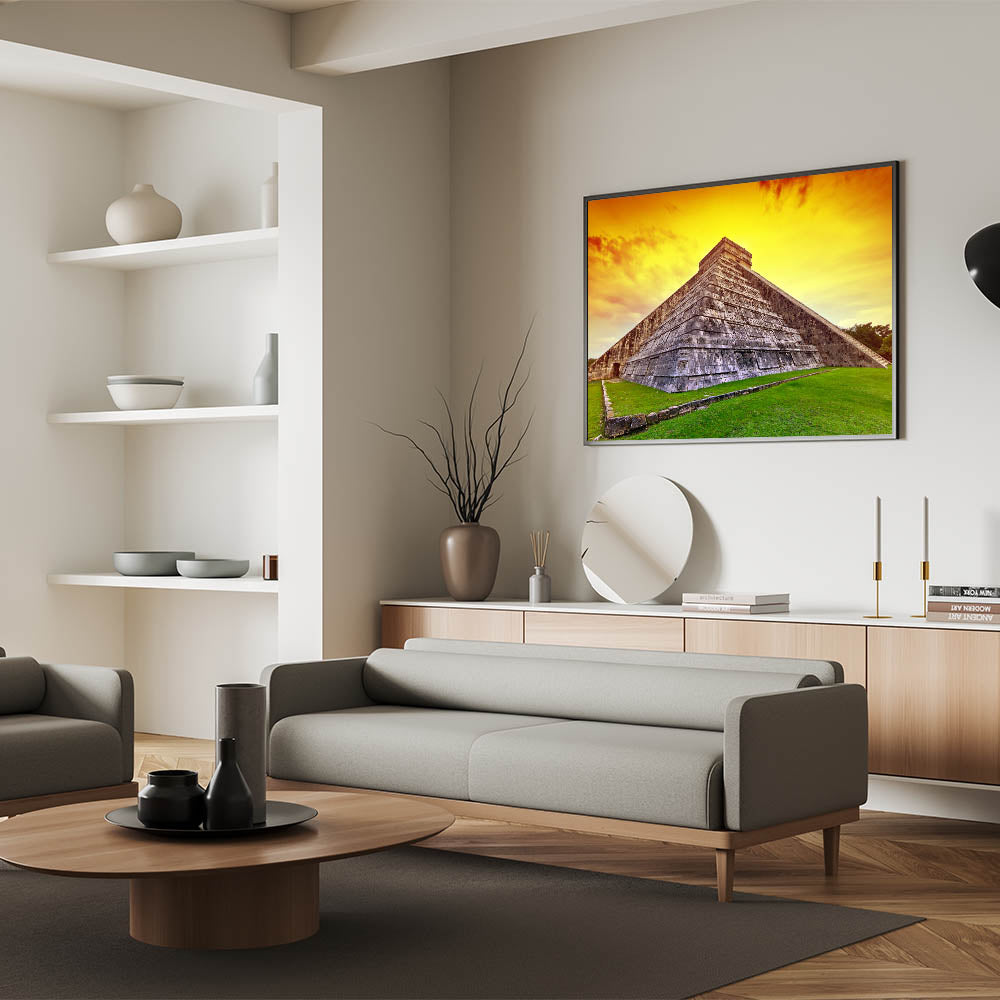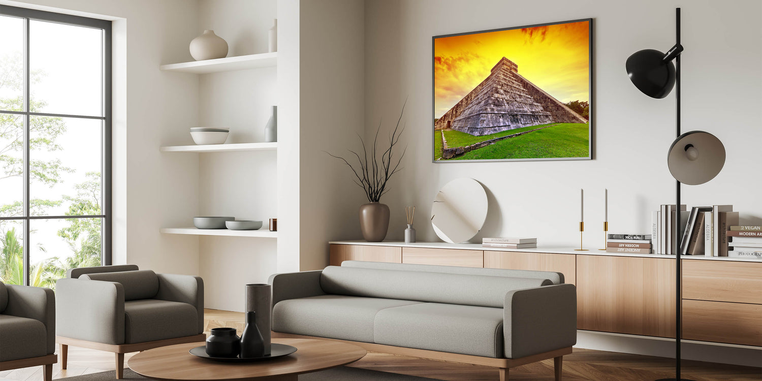 Whether you are a fan of Yucatan travel photography or simply want to add an extraordinary touch of history to your home or office, this Mayan Ruins Art will elevate your interior decor. The bold sunset hues and striking stone architecture make this Yucatan Peninsula Decor an unforgettable statement piece
