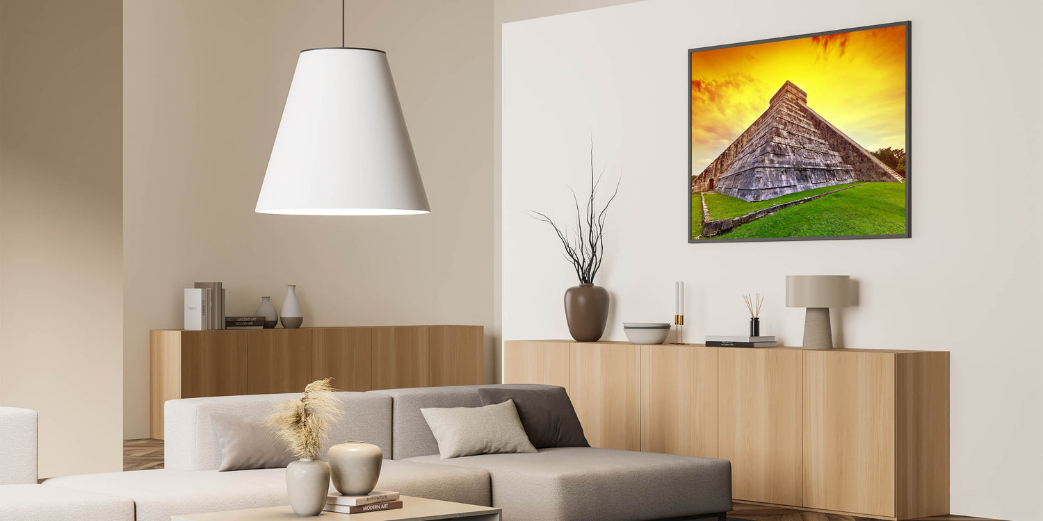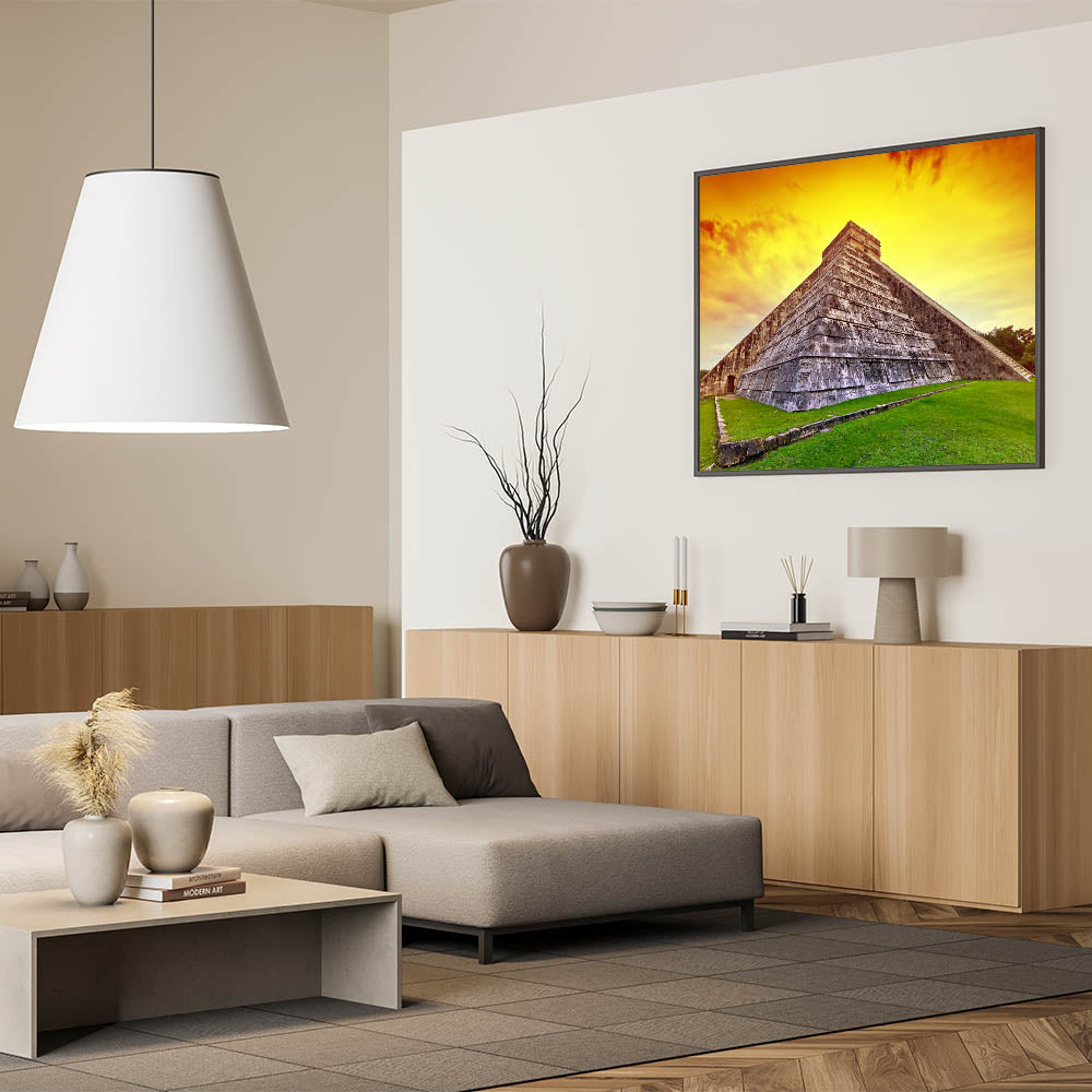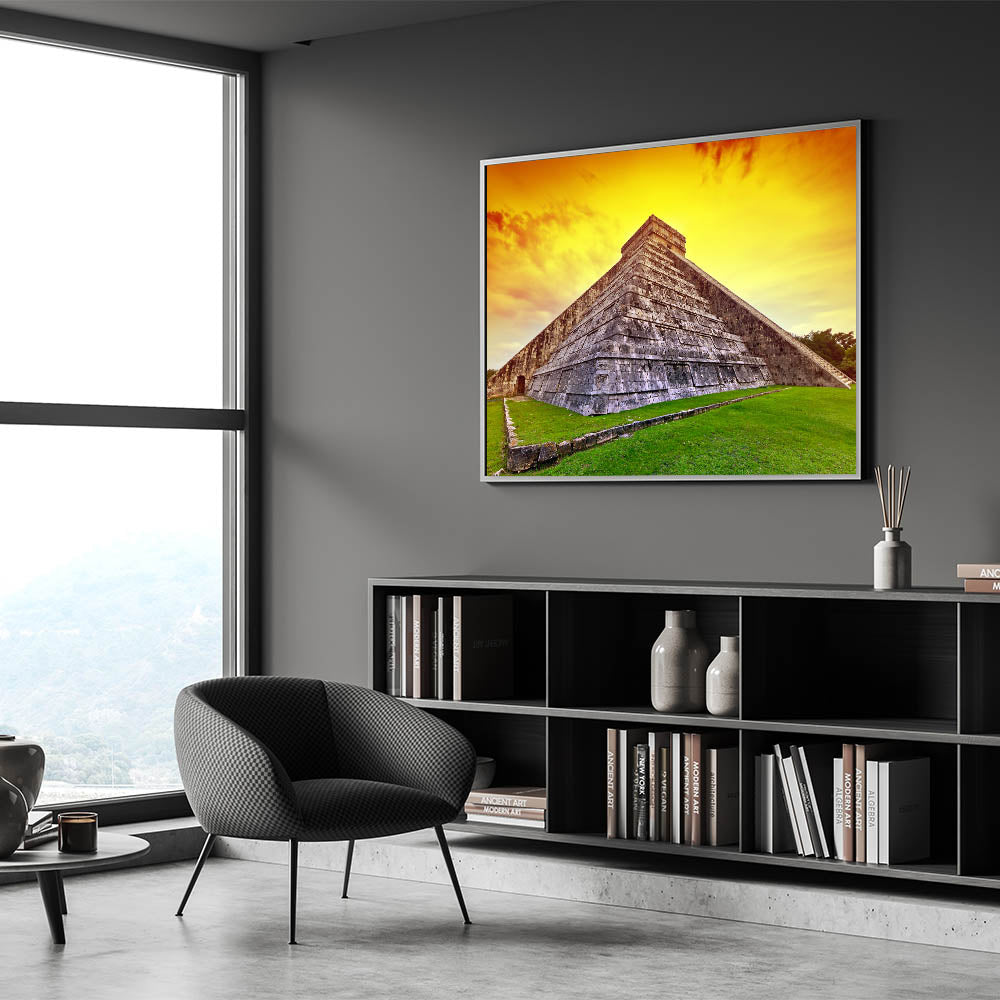 Whether you are a fan of Yucatan travel photography or simply want to add an extraordinary touch of history to your home or office, this Mayan Ruins Art will elevate your interior decor. The bold sunset hues and striking stone architecture make this Yucatan Peninsula Decor an unforgettable statement piece