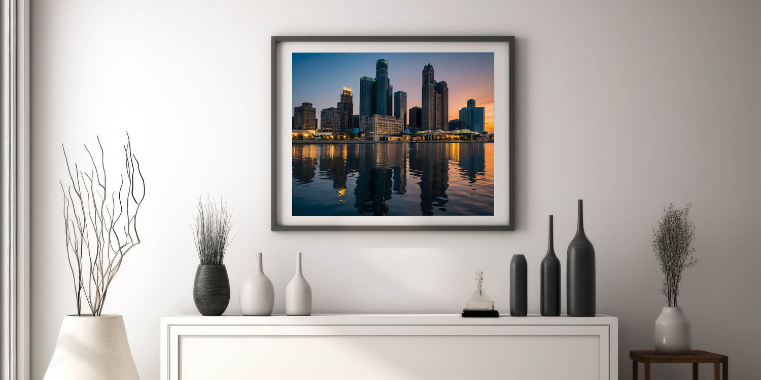 This Detroit cityscape photo brings the charm of the city's architecture to your space. Ideal for creating a relaxing, stylish atmosphere, this sunset skyline print is a must-have for any Detroit lover.