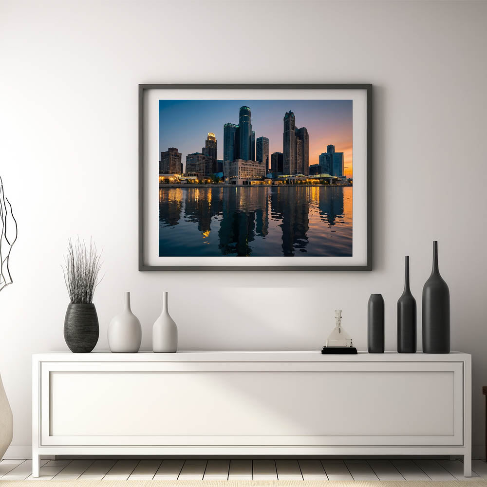 Capture the beauty of Detroit with this stunning sunset reflection cityscape print. The vibrant colors of the sky and the glowing city lights reflect off the calm waters, creating a mesmerizing scene. This Detroit skyline art is perfect for anyone who appreciates urban photography and the beauty of the Motor City at dusk. Whether you’re decorating your living room, office, or hallway, this piece will add a sense of serenity and elegance to any space.