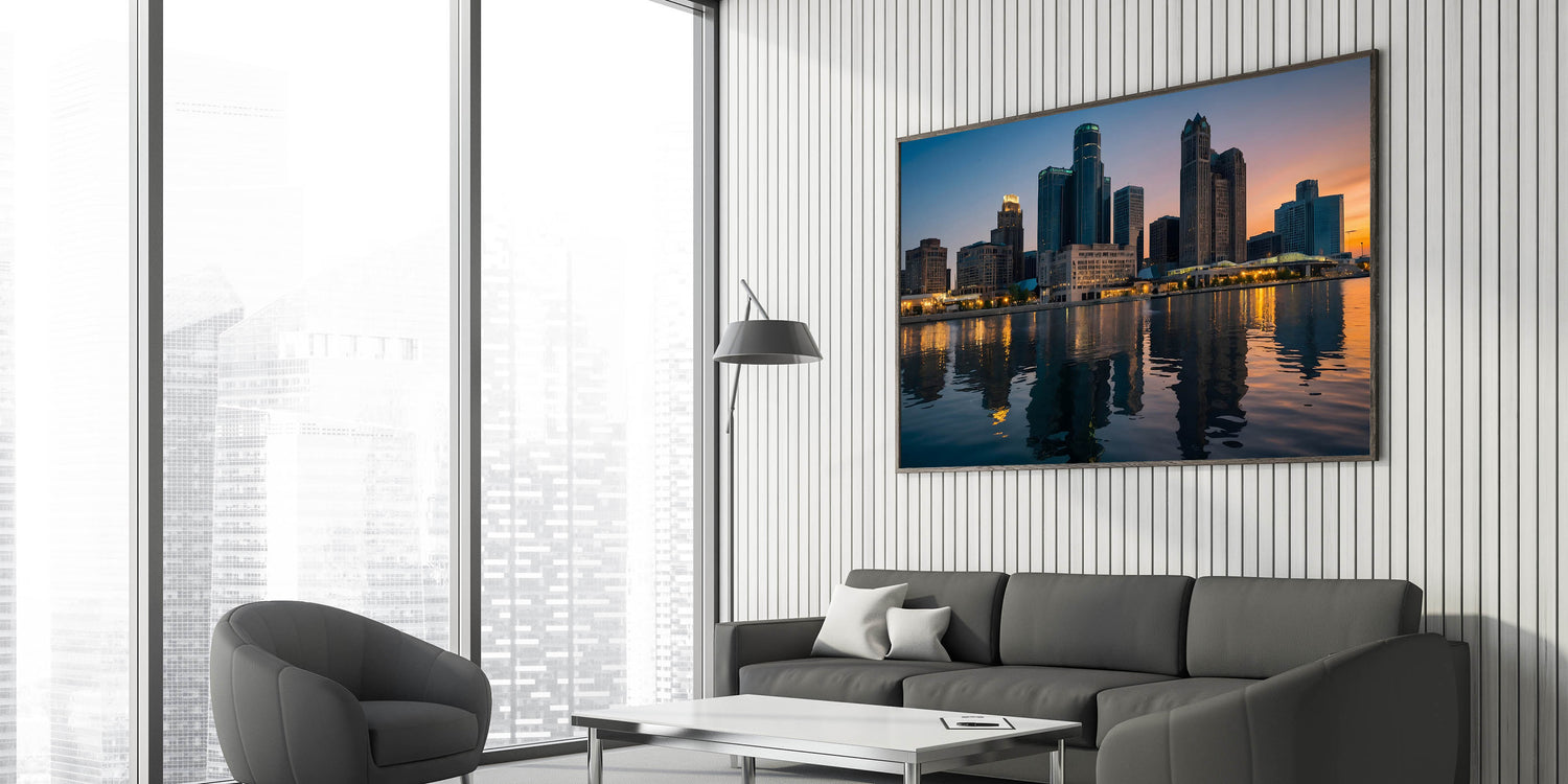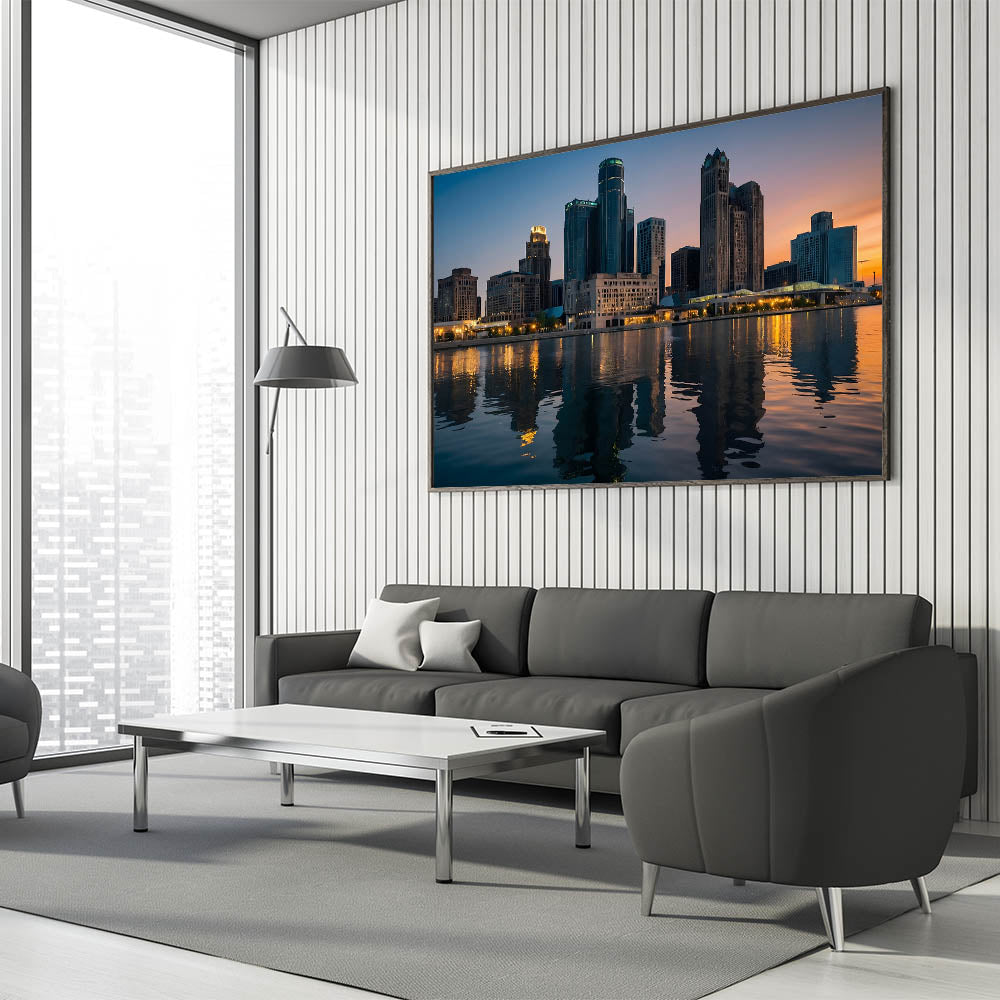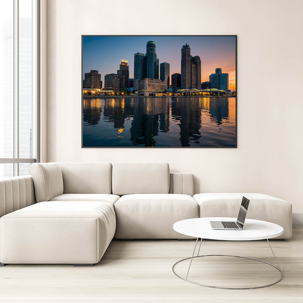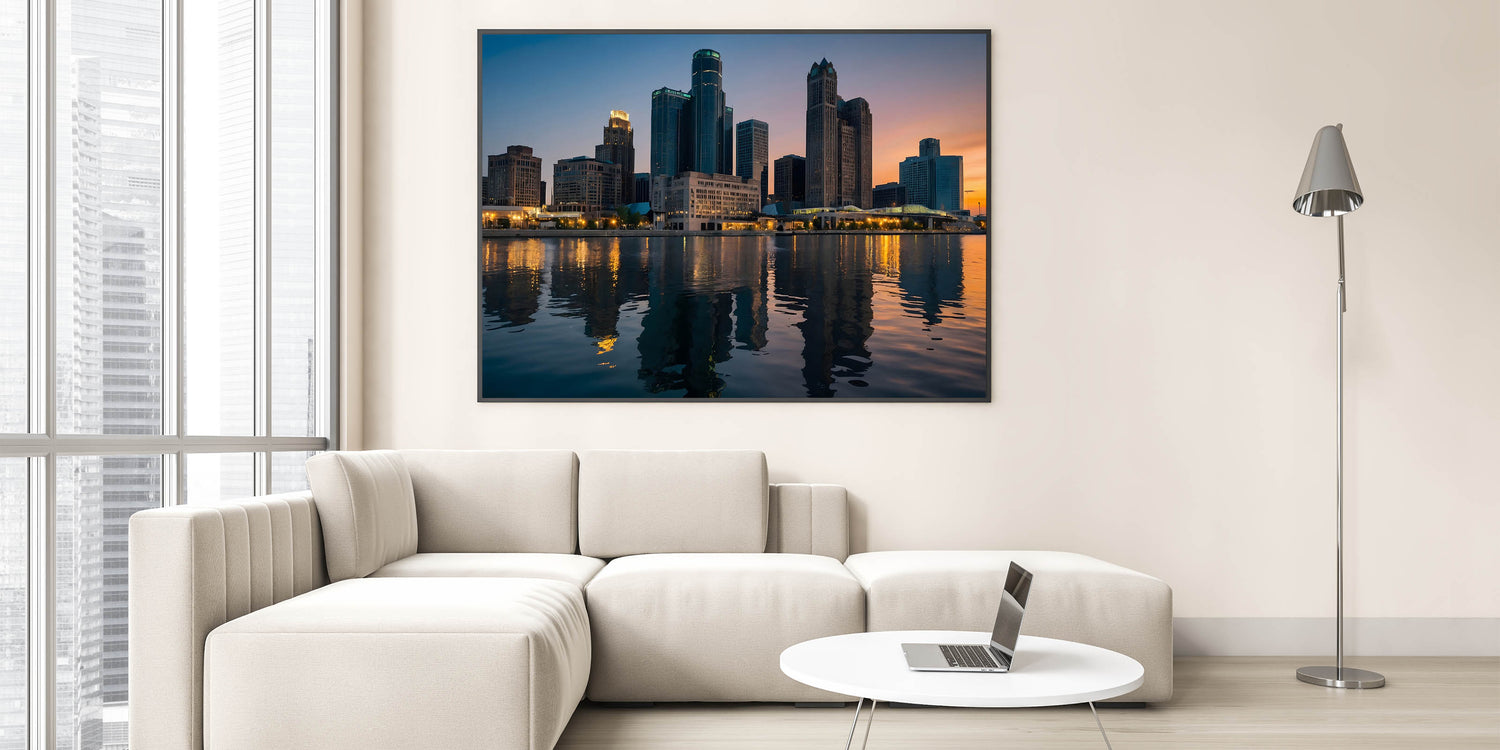 - High-resolution Detroit skyline photography print available on Stretched Canvas, Framed Canvas, Acrylic Glass, and Rolled Print