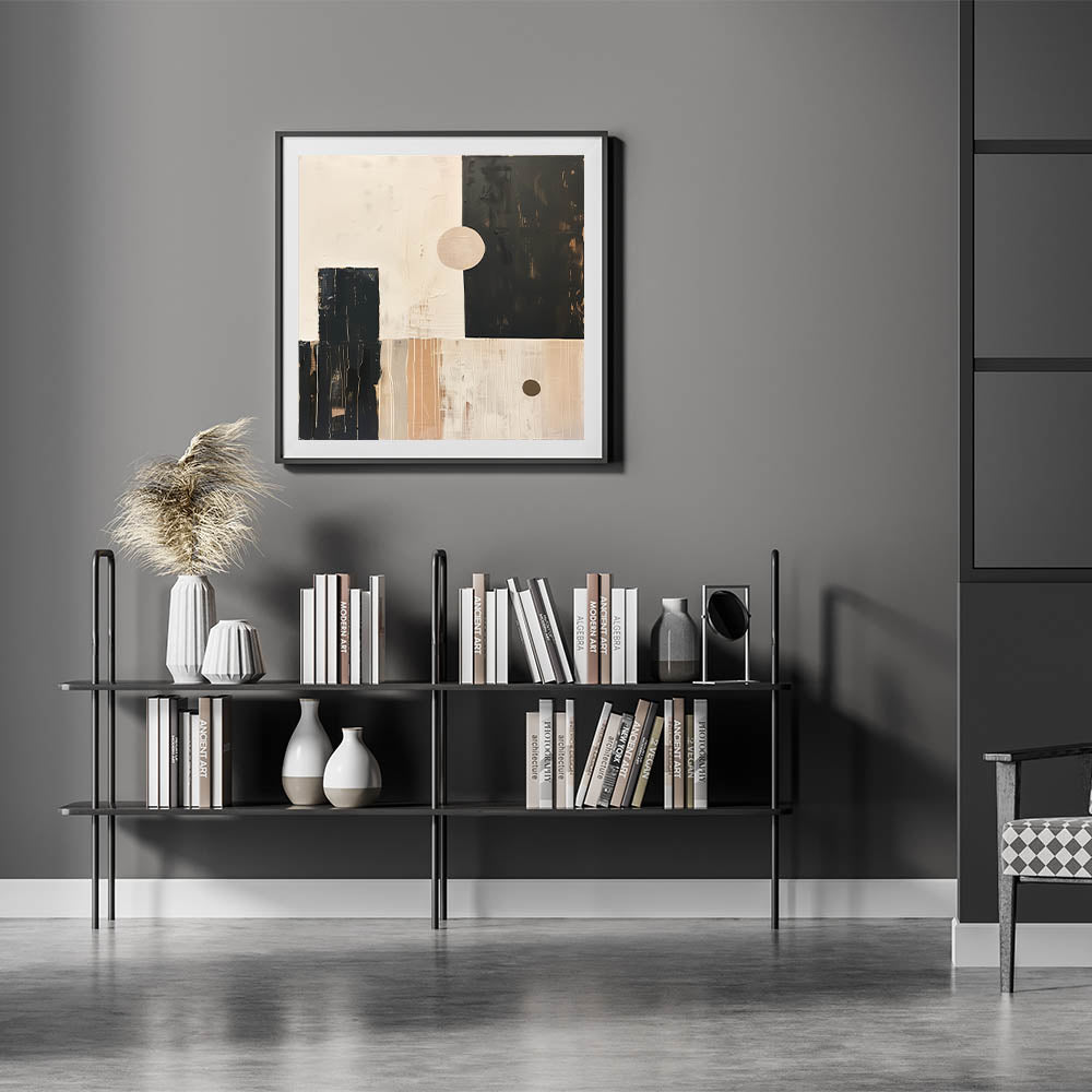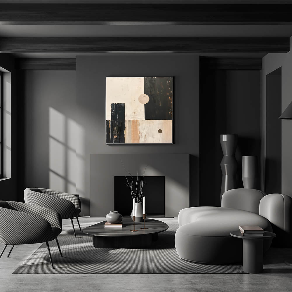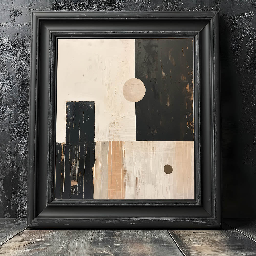 Bring a sense of retro-modern style into your home with this Mid-Century Modern abstract artwork. Featuring geometric shapes in a harmonious palette of beige, black, and soft tan tones, this minimalist design is perfect for creating a bold, modern statement while maintaining a clean, balanced aesthetic. The subtle brushstrokes and texture add depth, making this piece versatile enough for living rooms, offices, or bedrooms.