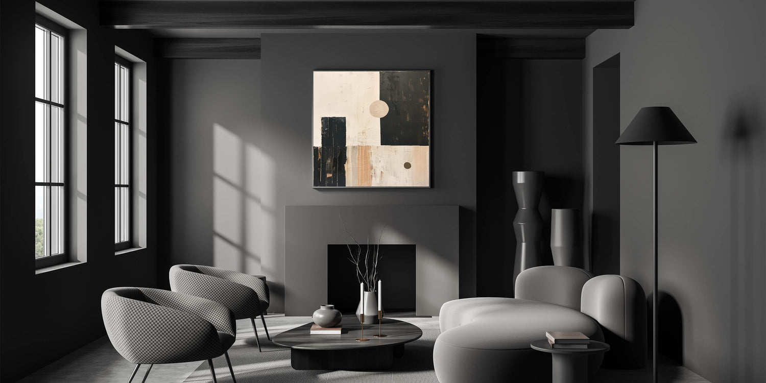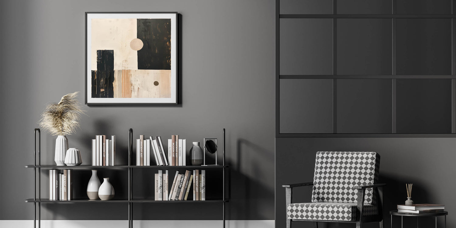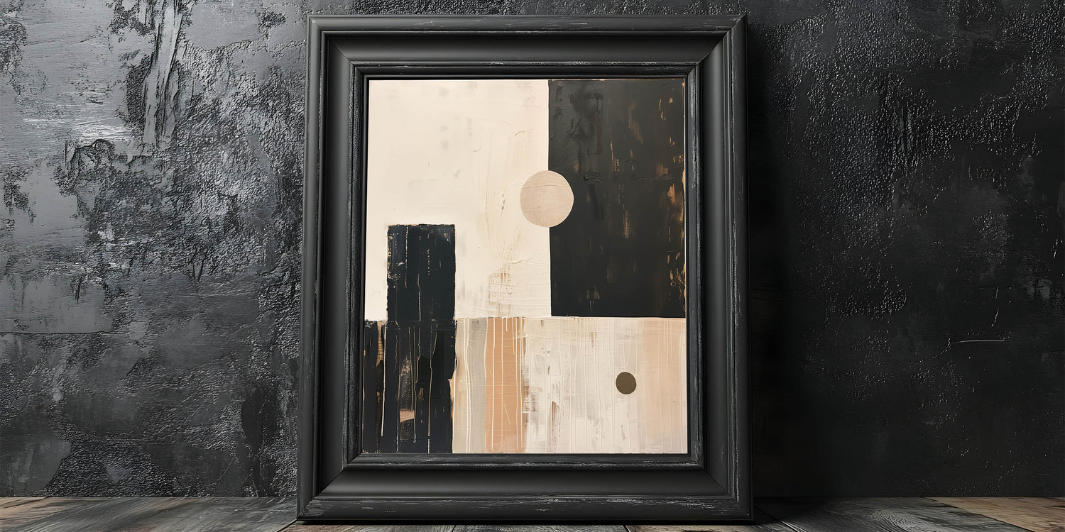 Bring a sense of retro-modern style into your home with this Mid-Century Modern abstract artwork. Featuring geometric shapes in a harmonious palette of beige, black, and soft tan tones, this minimalist design is perfect for creating a bold, modern statement while maintaining a clean, balanced aesthetic. The subtle brushstrokes and texture add depth, making this piece versatile enough for living rooms, offices, or bedrooms.