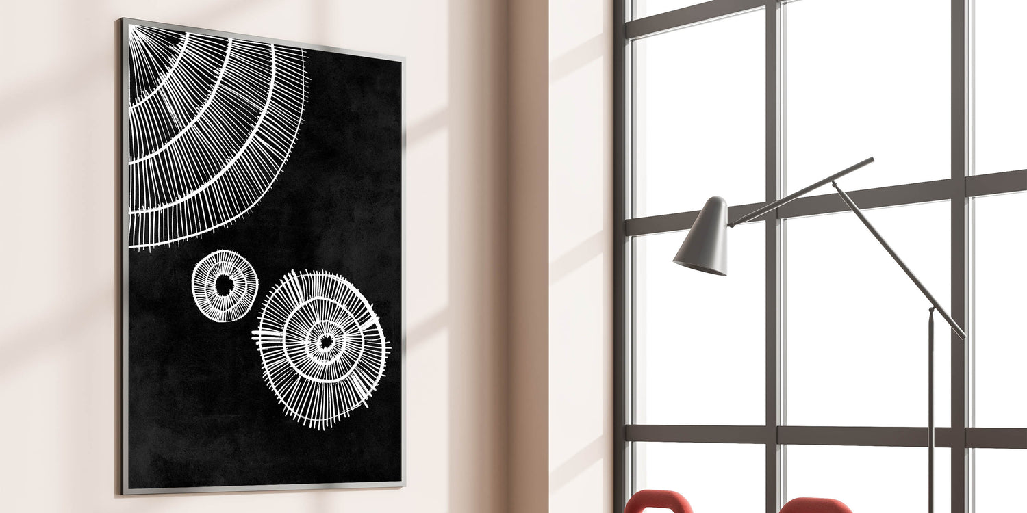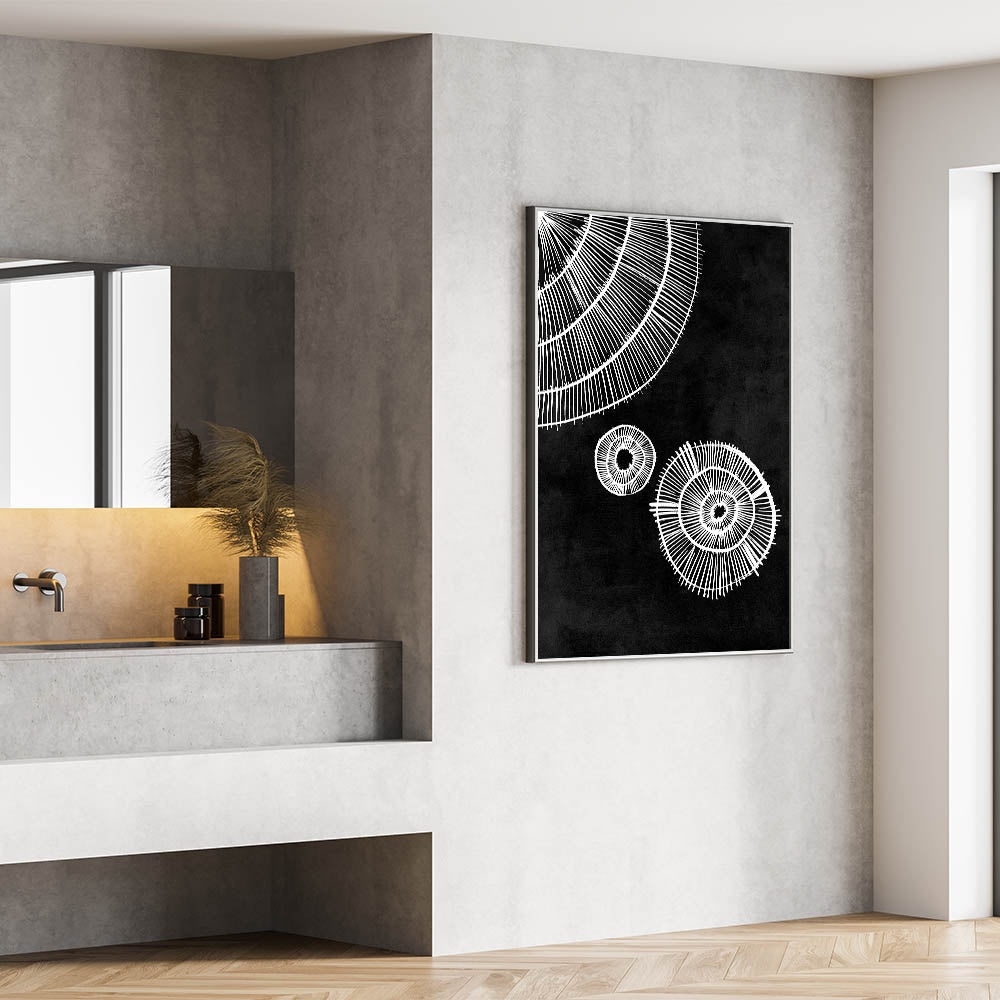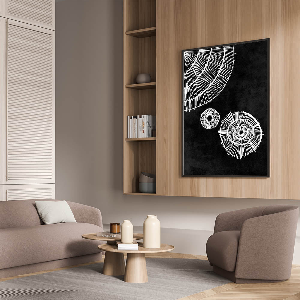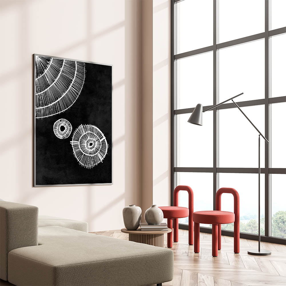 This bold Mid Century Modern art piece features striking geometric patterns in black and white, creating a dynamic visual experience. The concentric circular lines, meticulously arranged against a dark background, offer a minimalist yet sophisticated design perfect for modern and retro-inspired interiors. The clean, intricate line work evokes movement and depth, making it an ideal statement piece for any room. Whether you're aiming to complement a contemporary living space or enhance a retro-inspired room, this black and white wall art fits seamlessly into various design themes.