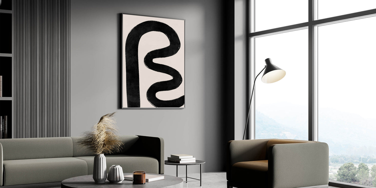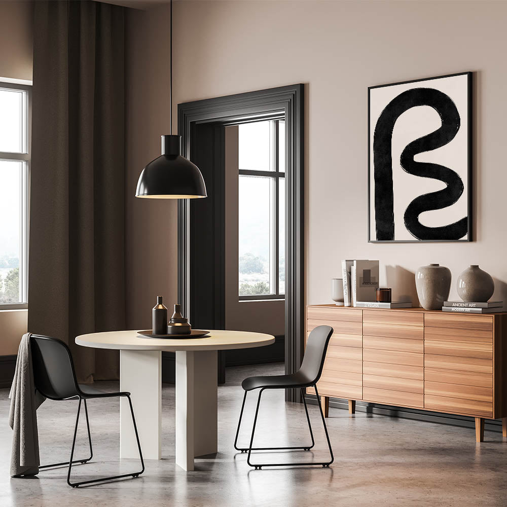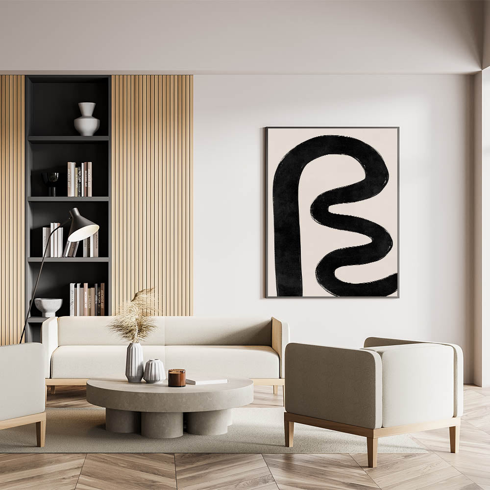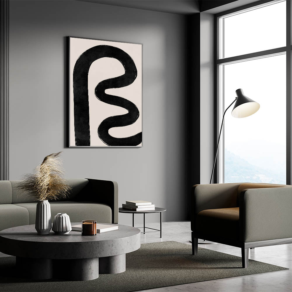 This retro-inspired design adds a unique and sophisticated focal point to any room. The thick, abstract black line brings a sense of movement and modern flair, making it a versatile and eye-catching piece for any space.