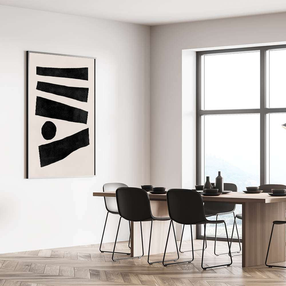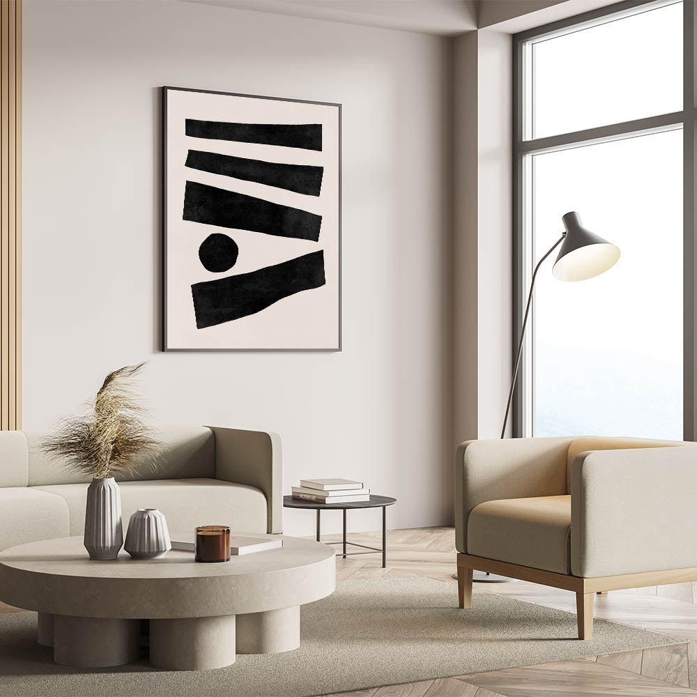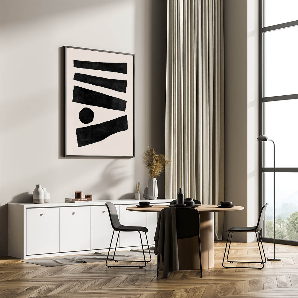 Elevate your home decor with this bold and minimalist Mid Century Modern Art piece. Featuring dynamic black stripes with a circular accent, this artwork embodies the clean and sleek lines of vintage modern style. Its simplicity and geometric shapes create a striking visual contrast against the neutral background, making it the perfect statement piece for lovers of retro abstract prints and minimalist wall art.