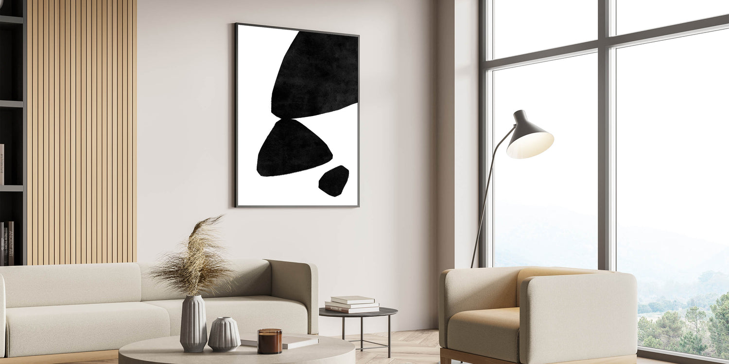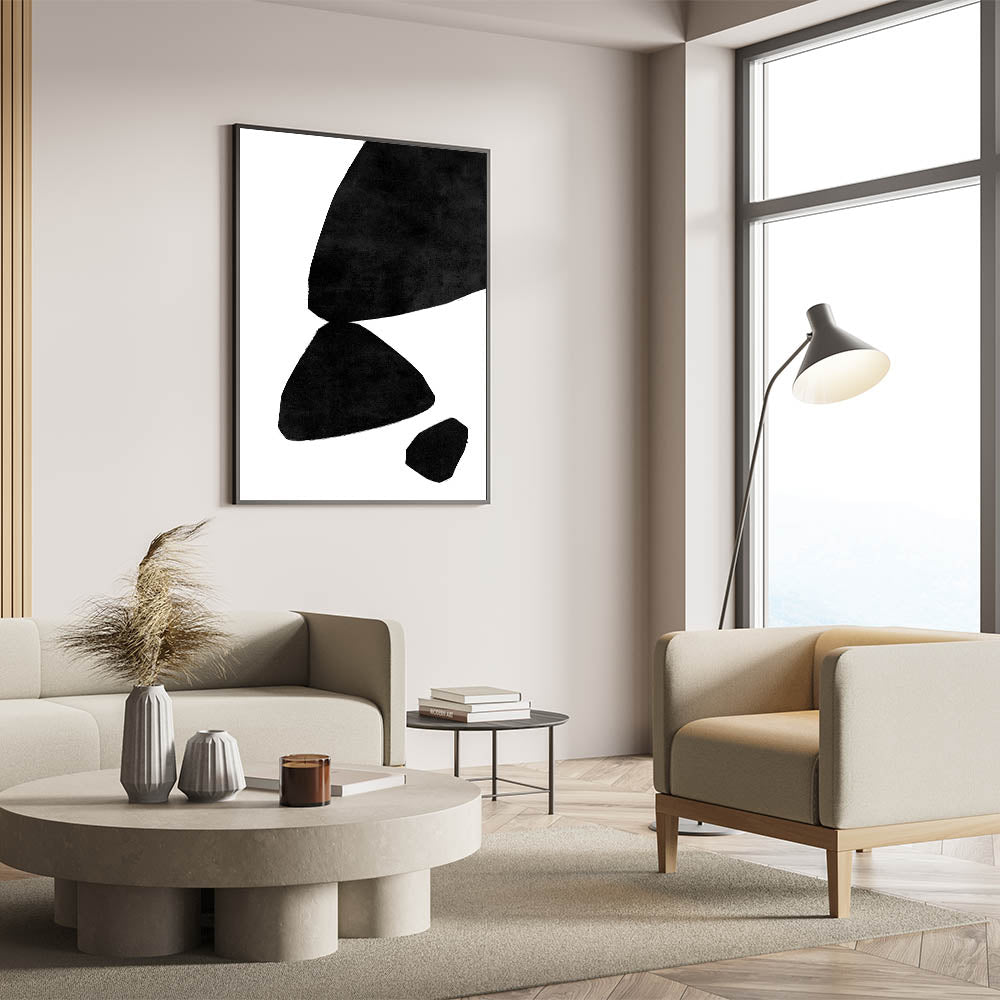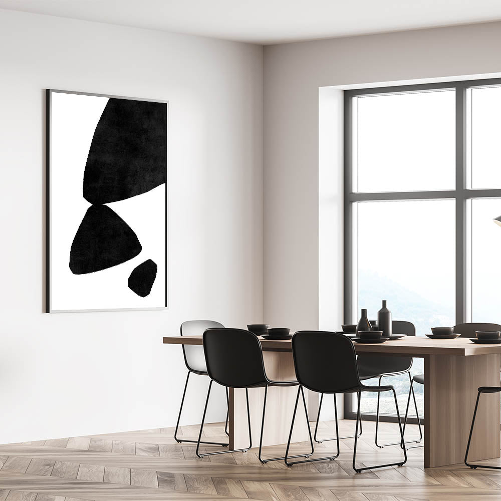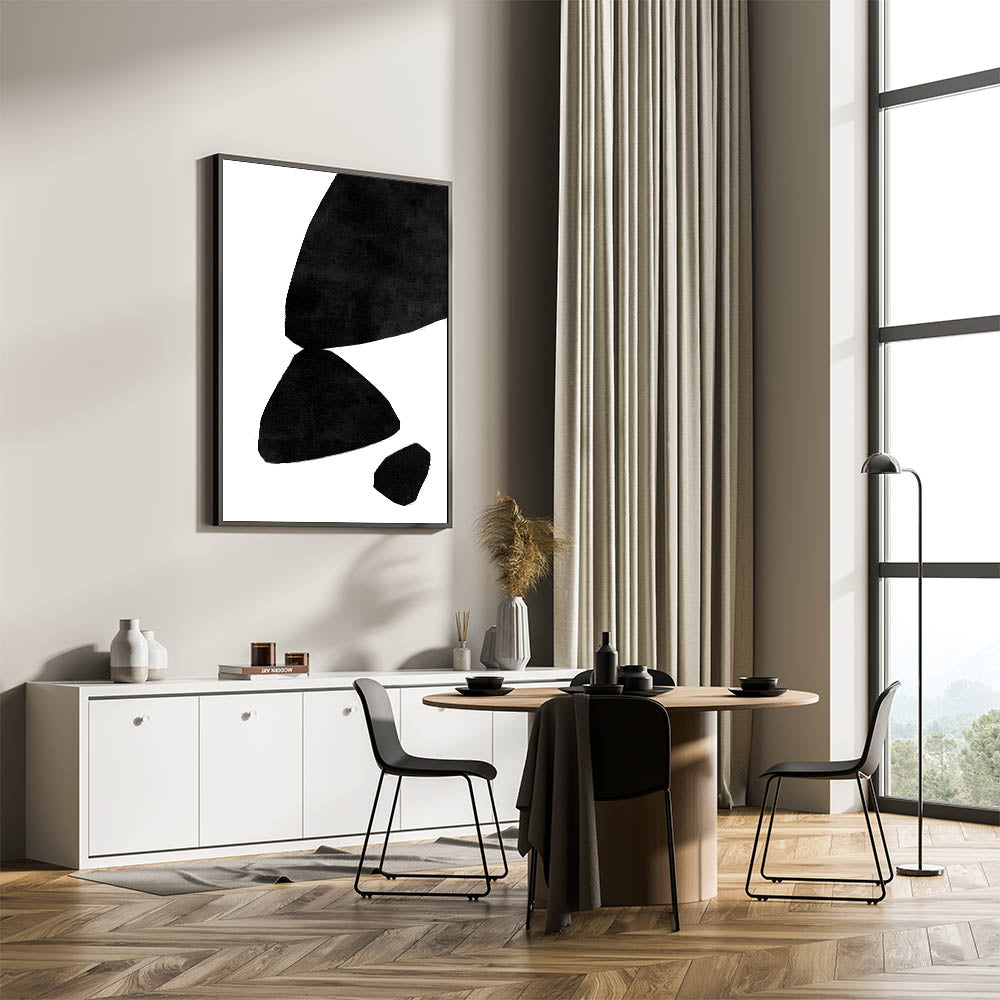 Enhance your decor with this striking mid-century modern art piece, featuring minimalist abstract shapes in bold black set against a crisp white background. The simple yet impactful design focuses on geometric forms and the interplay of positive and negative space, creating a sense of balance and harmony. This artwork embodies the elegance of retro-inspired decor while maintaining a timeless, modern appeal that fits seamlessly into a variety of interior styles.