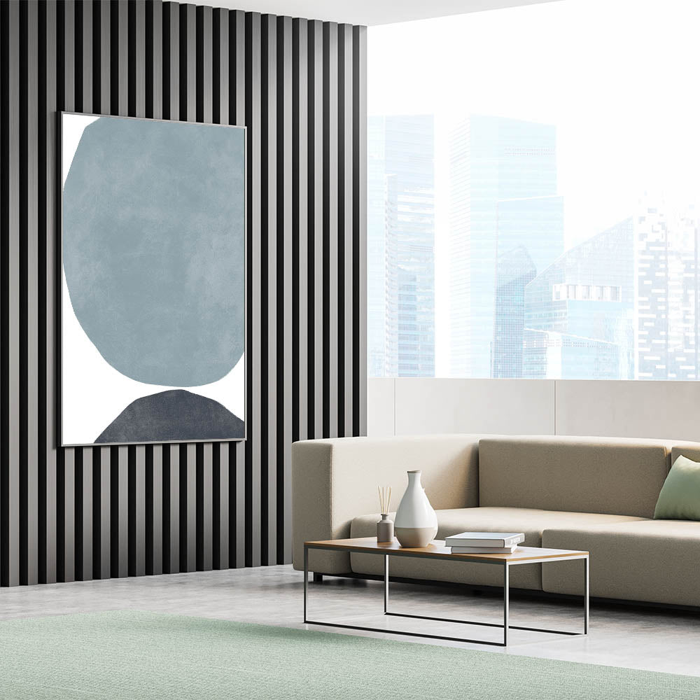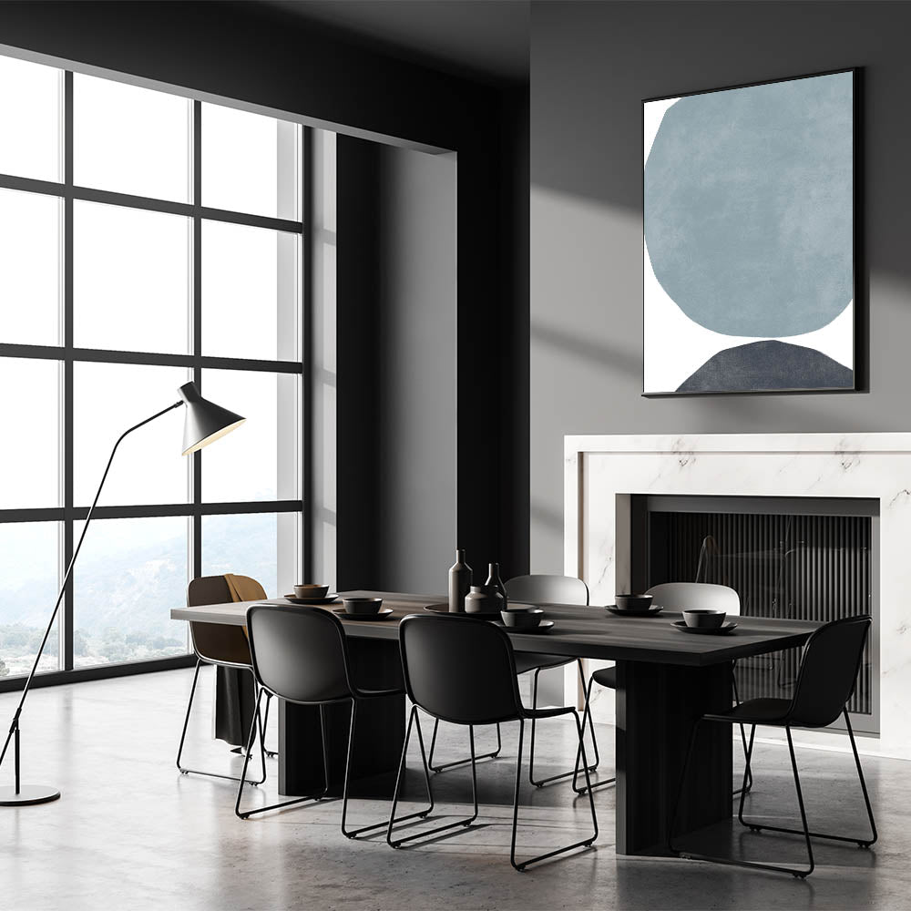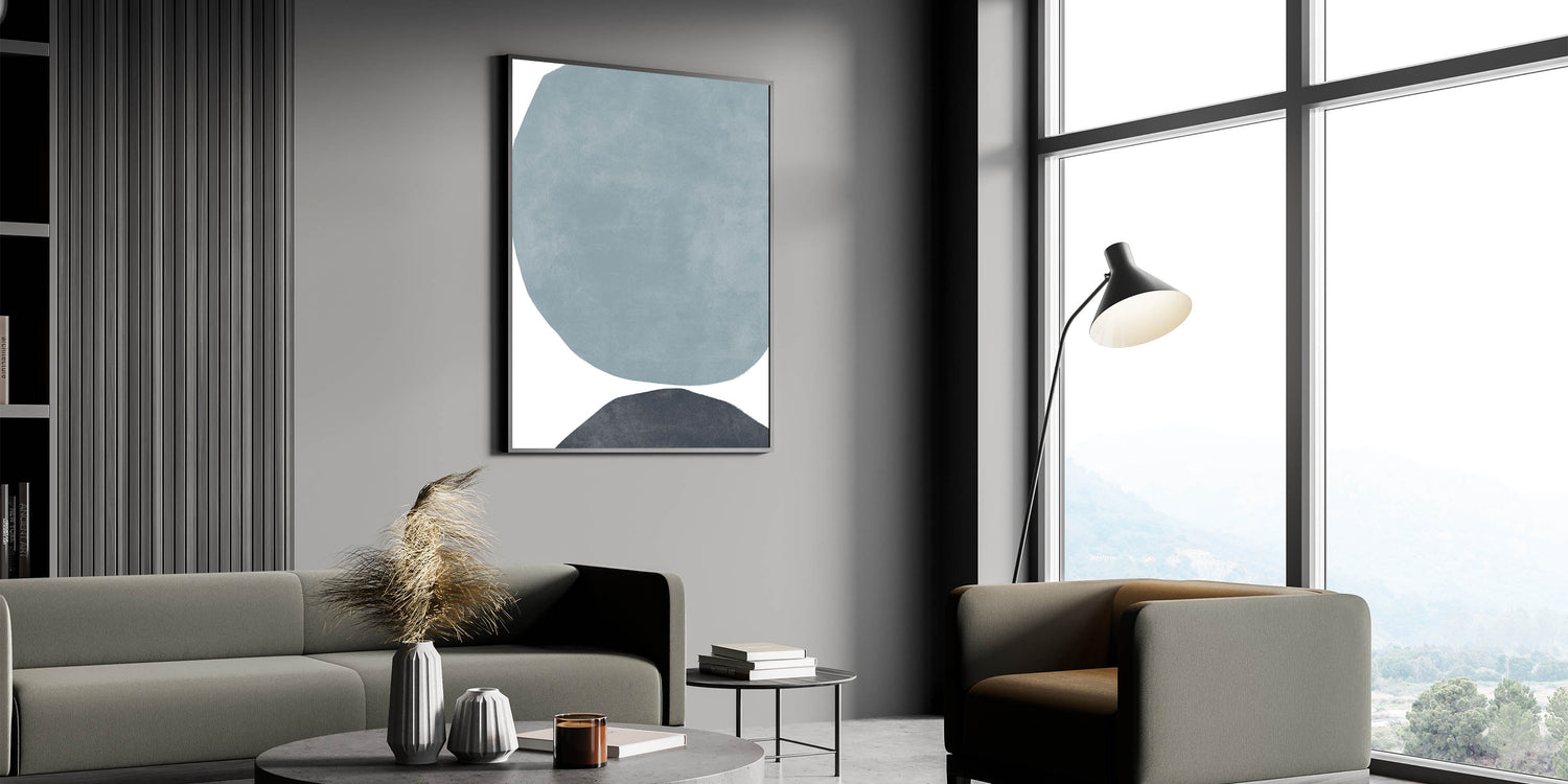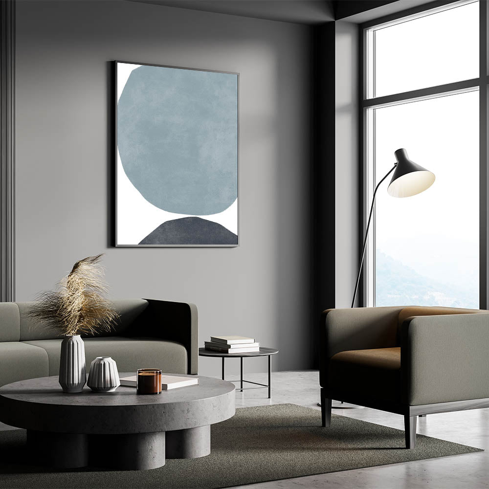 Transform your living space with this elegant Mid Century Modern art piece, featuring a minimalist design of geometric shapes in muted blue and charcoal tones. This abstract composition exudes simplicity and modernity, making it the perfect addition to any contemporary or retro-inspired interior. Its subtle colors and soft lines are ideal for creating a calm and sophisticated atmosphere in your home.