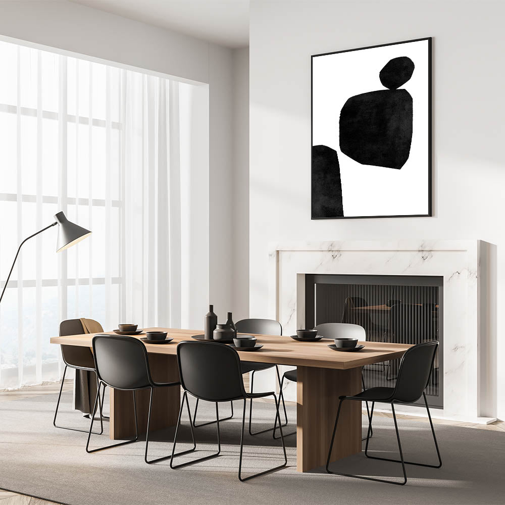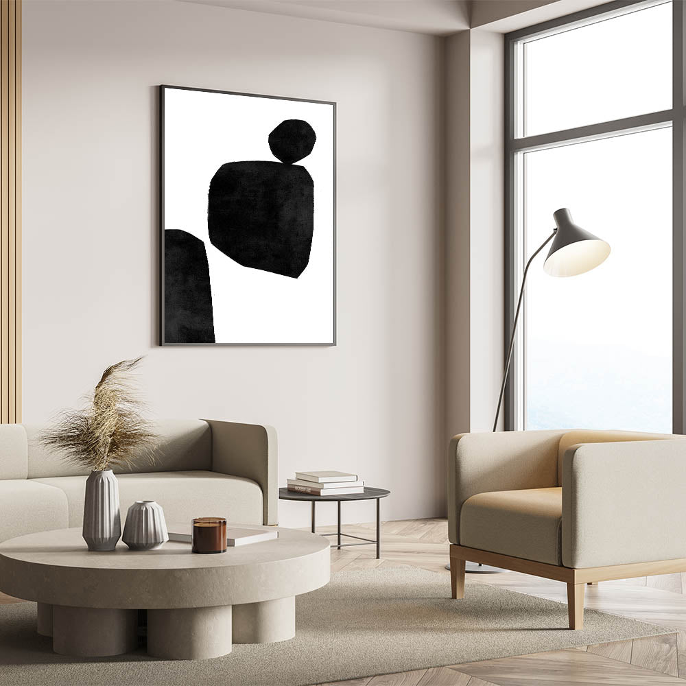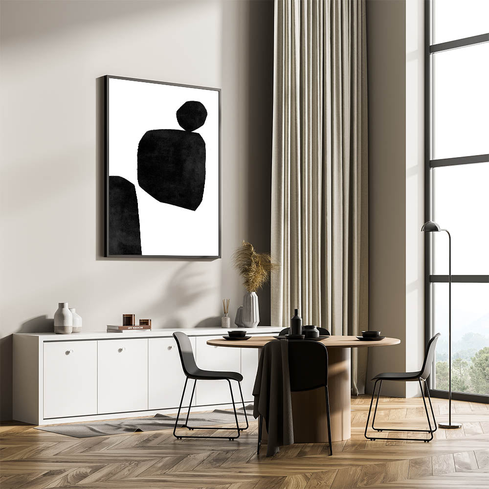 Add a touch of modern minimalism to your space with this striking mid-century modern art piece. The bold black geometric shapes stand out against the clean white background, creating a sense of balance and harmony. This abstract design embodies the best of mid-century modern style while remaining versatile enough to fit into a variety of interior themes. The simplicity of the design makes it a perfect choice for those who appreciate minimalist decor with a retro twist.