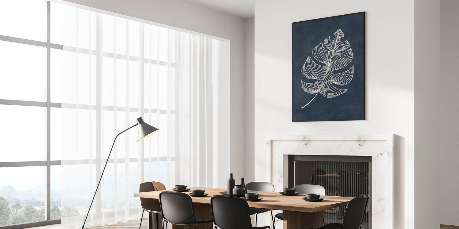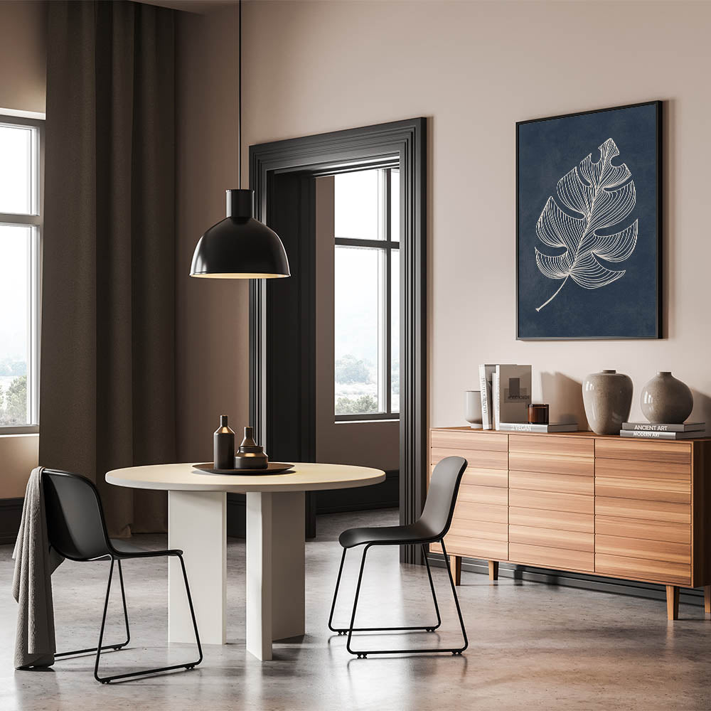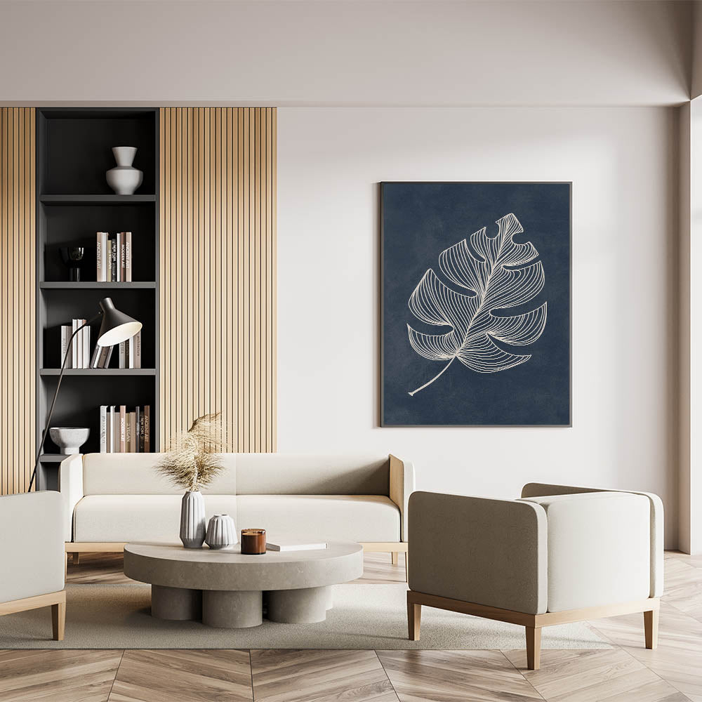 Add a touch of elegance to your space with this Mid-Century Modern Art featuring a minimalist geometric leaf design. The intricate white lines against a deep blue background create a stunning contrast, making it an ideal piece for those who appreciate retro-inspired designs with a minimalist aesthetic. This wall art serves as a beautiful focal point in any living room, bedroom, or office.