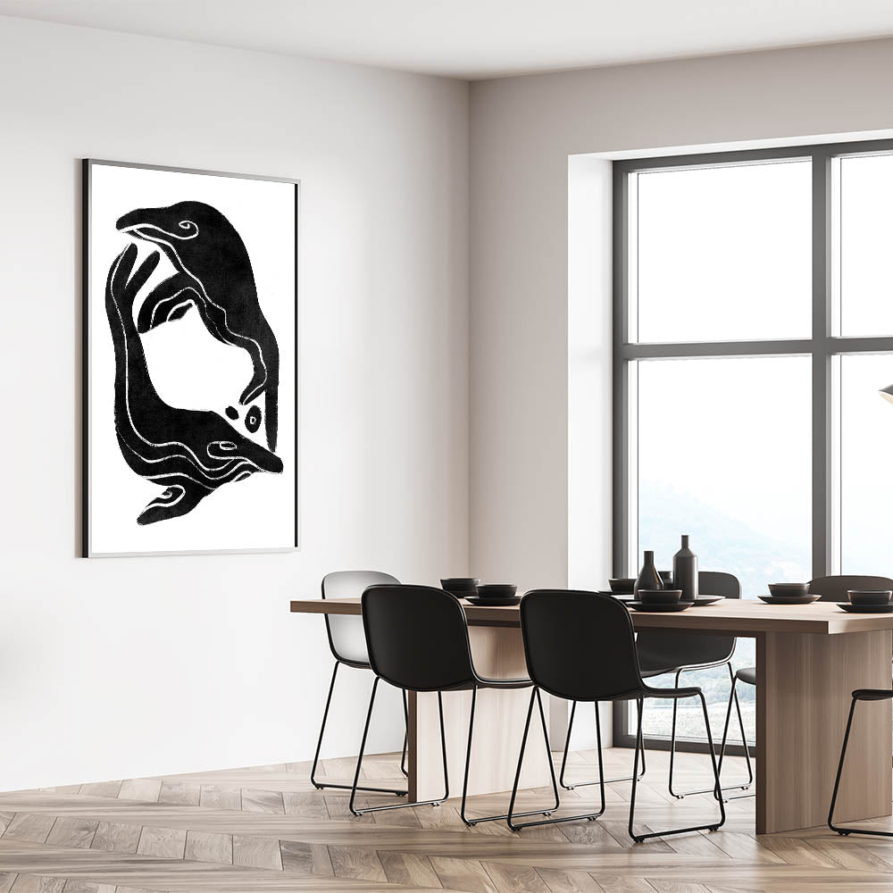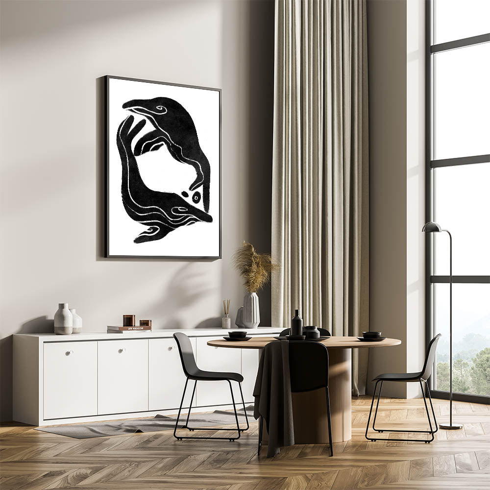 Add a bold, vintage touch to your home decor with this mid-century modern art piece featuring a minimalist abstract fish design. The fluid lines and smooth shapes of the fish, rendered in striking black and white, evoke a sense of motion and harmony. This retro-inspired geometric artwork is ideal for adding visual interest to any room, from living spaces to offices. With its minimalist aesthetic, the design seamlessly blends modern and vintage elements, making it a versatile addition to any decor style.