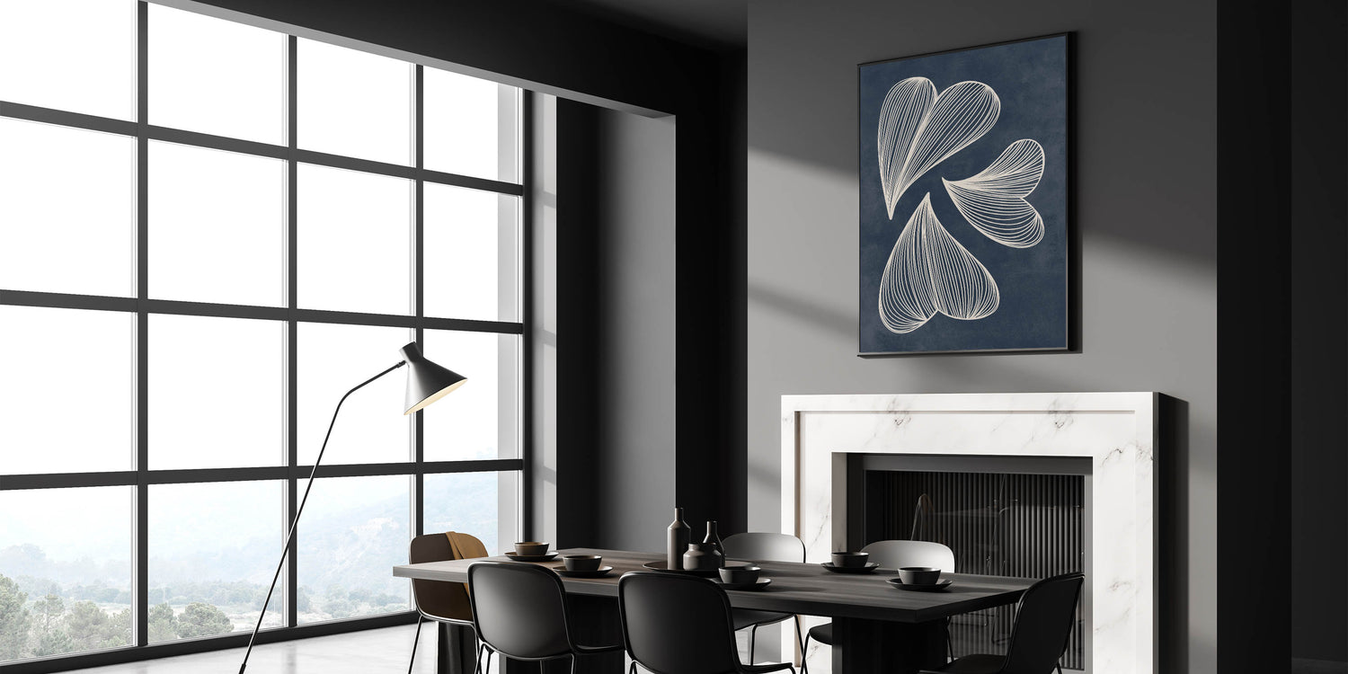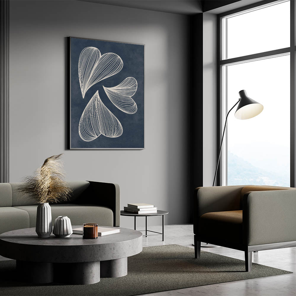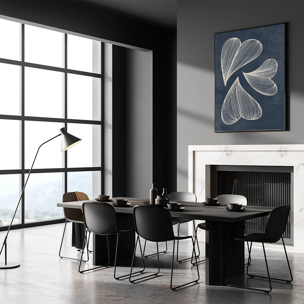 Enhance your home with this exquisite Mid-Century Modern Art piece featuring a retro abstract leaf design. The flowing white lines set against a deep navy blue background create a captivating geometric pattern that embodies both elegance and a minimalist aesthetic. This artwork is perfect for those who appreciate the timeless appeal of mid-century modern decor with a contemporary twist.