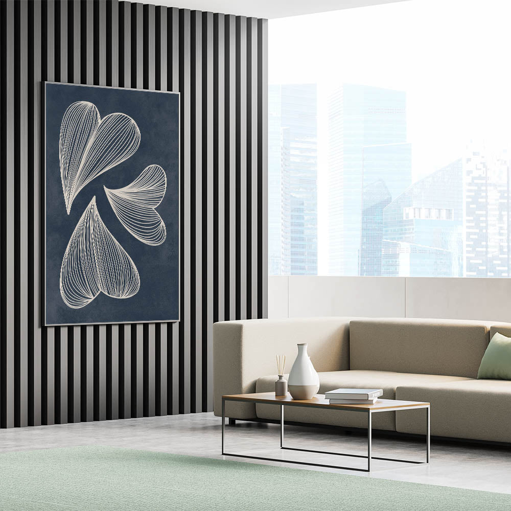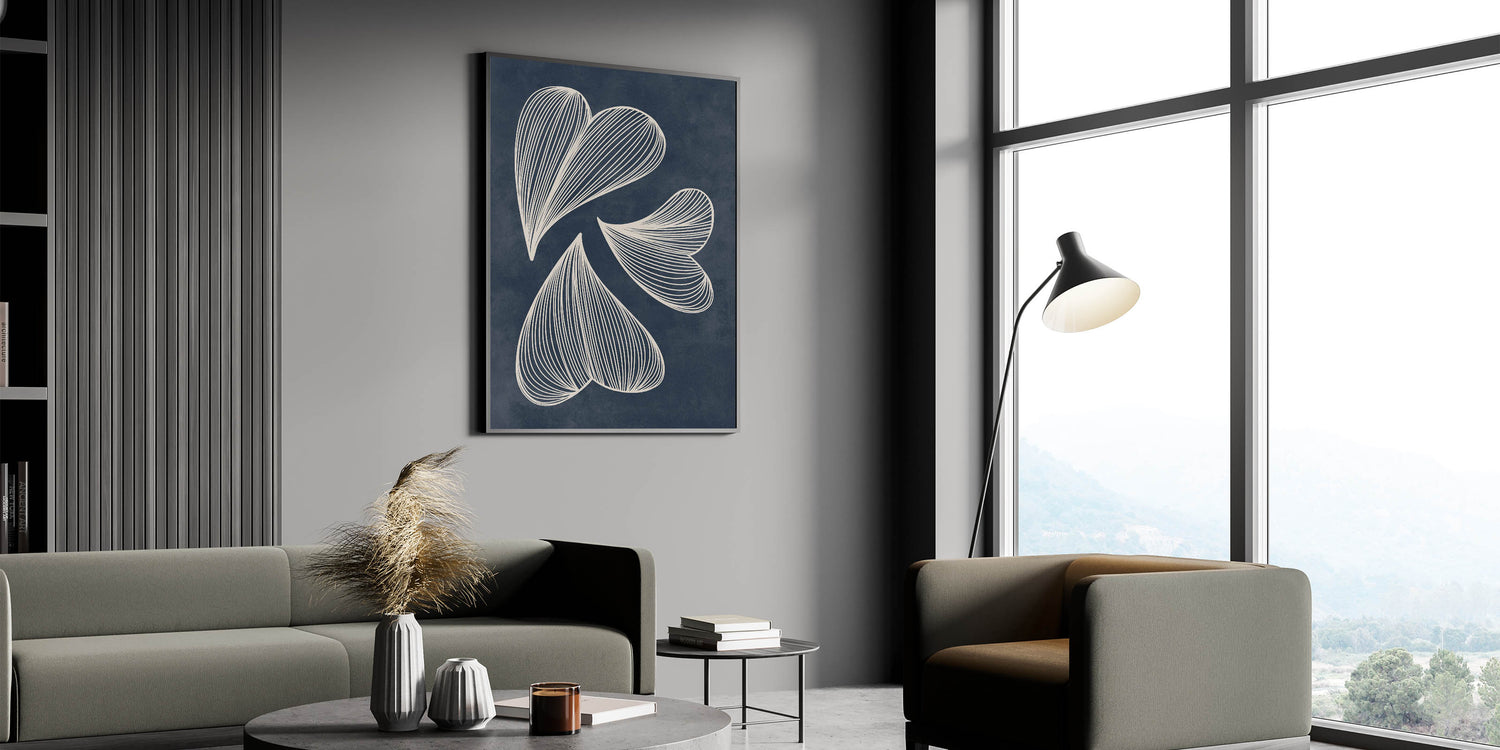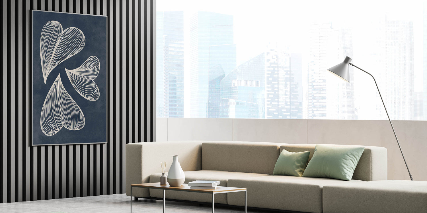 Enhance your home with this exquisite Mid-Century Modern Art piece featuring a retro abstract leaf design. The flowing white lines set against a deep navy blue background create a captivating geometric pattern that embodies both elegance and a minimalist aesthetic. This artwork is perfect for those who appreciate the timeless appeal of mid-century modern decor with a contemporary twist.