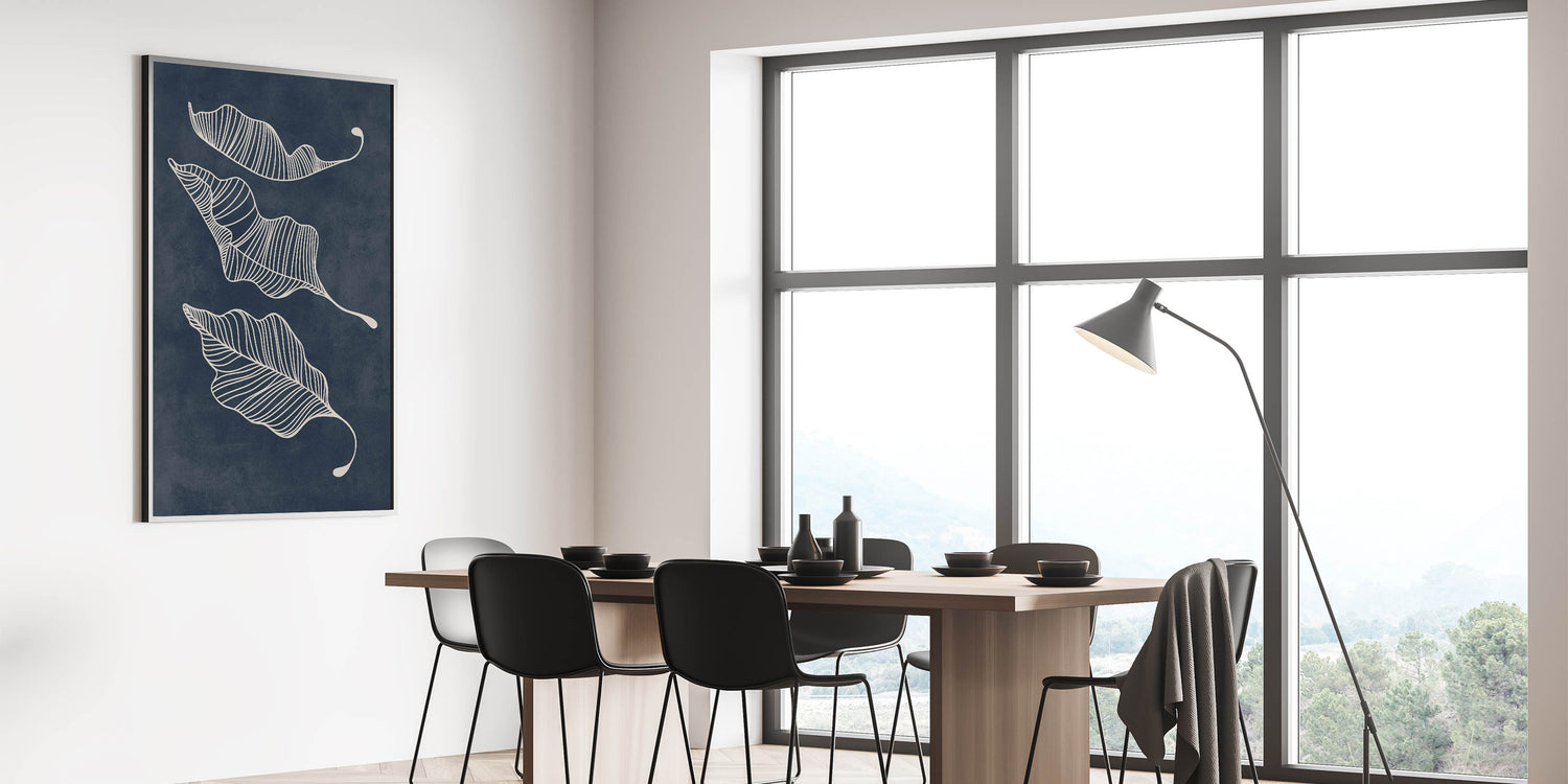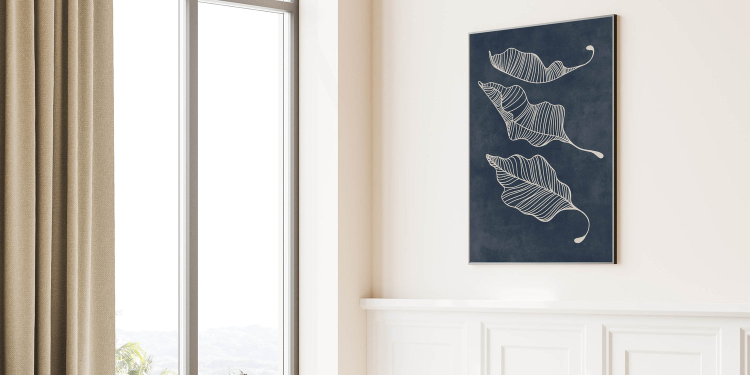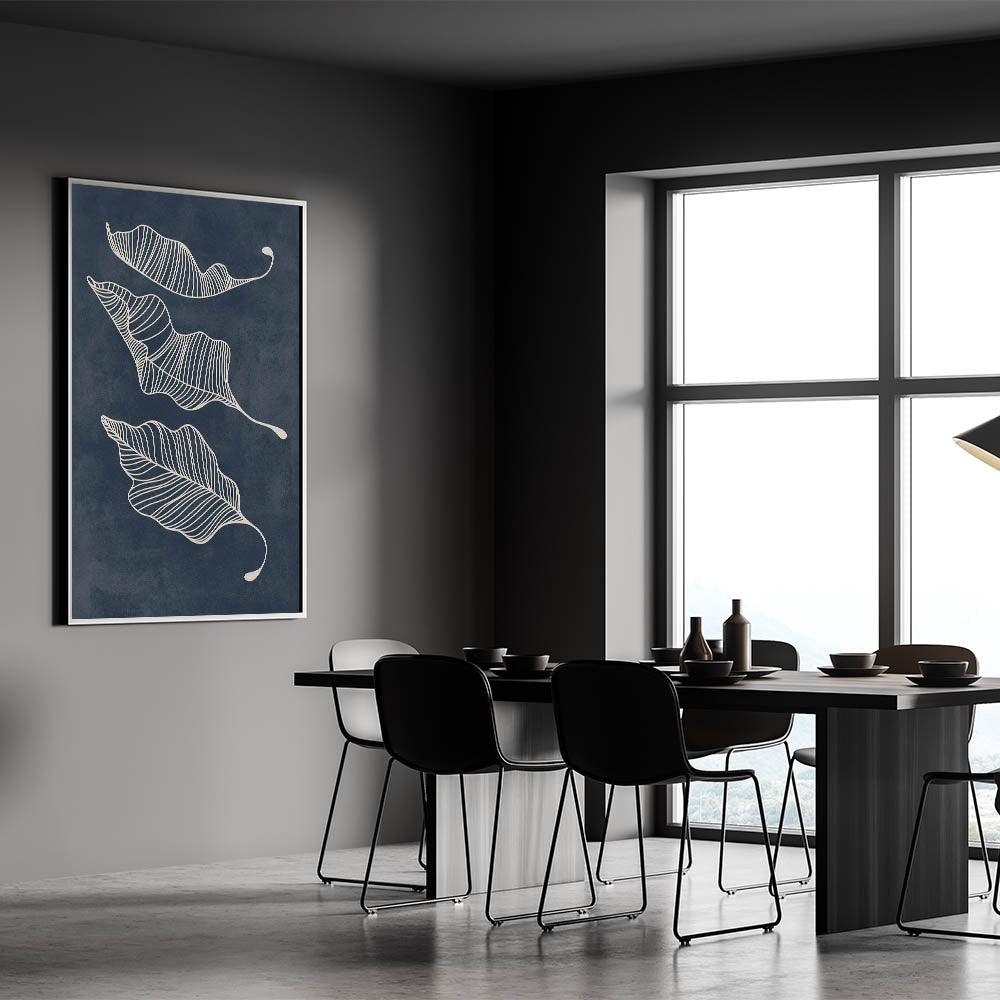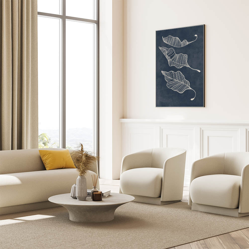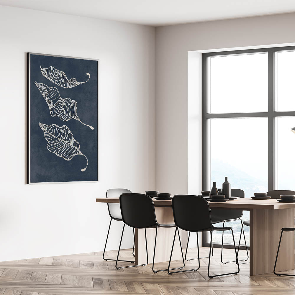 Elevate your interior with this captivating Mid-Century Modern Art piece, featuring a minimalist abstract leaf design. The intricate white linework gracefully captures the movement of the leaves, set against a deep navy background, creating a stunning contrast that embodies the essence of geometric wall decor. This artwork is perfect for those who appreciate a blend of retro-inspired elegance and mid-century modern decor.