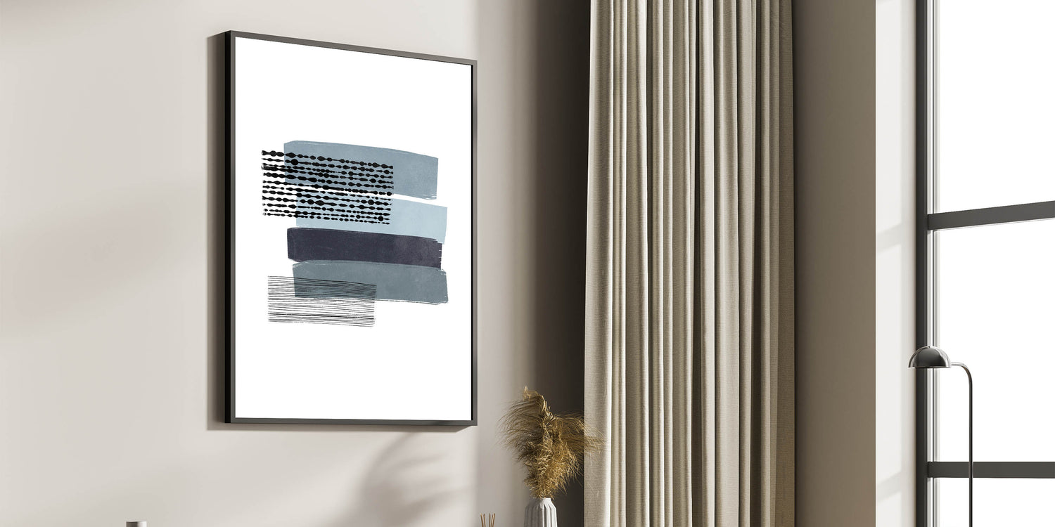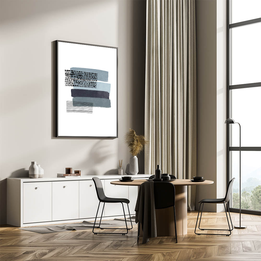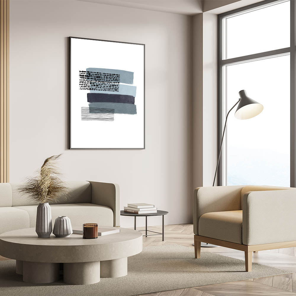 Introduce a captivating piece of Mid Century Modern art to your living space with this retro abstract design. Featuring horizontal bands of muted blue, navy, and black, combined with unique geometric patterns, this artwork perfectly embodies a minimalist aesthetic while maintaining vintage appeal. The subtle contrasts in color and pattern make this piece a versatile addition to any room, effortlessly complementing mid-century modern decor.