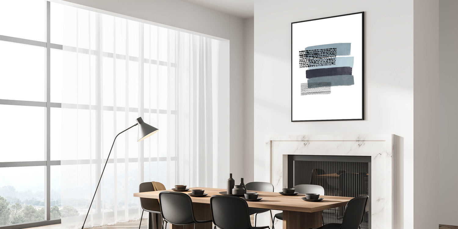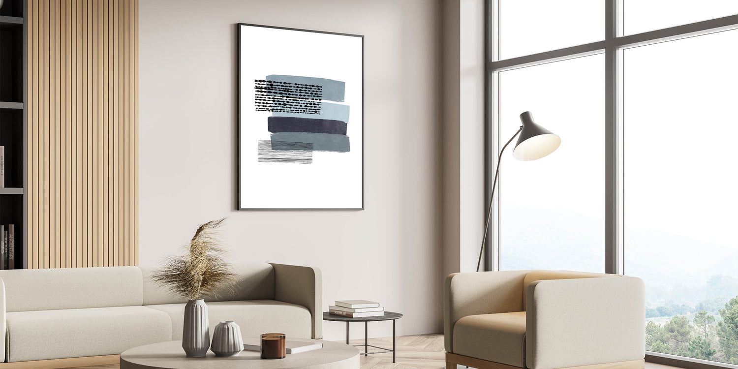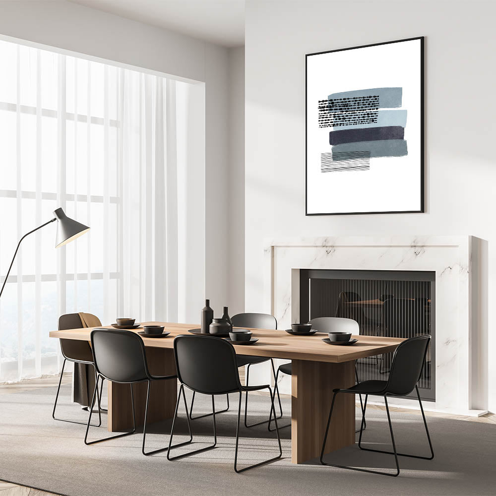 Introduce a captivating piece of Mid Century Modern art to your living space with this retro abstract design. Featuring horizontal bands of muted blue, navy, and black, combined with unique geometric patterns, this artwork perfectly embodies a minimalist aesthetic while maintaining vintage appeal. The subtle contrasts in color and pattern make this piece a versatile addition to any room, effortlessly complementing mid-century modern decor.