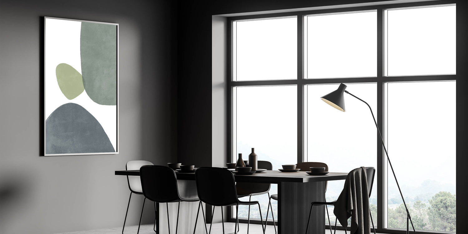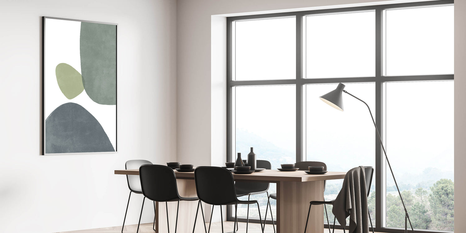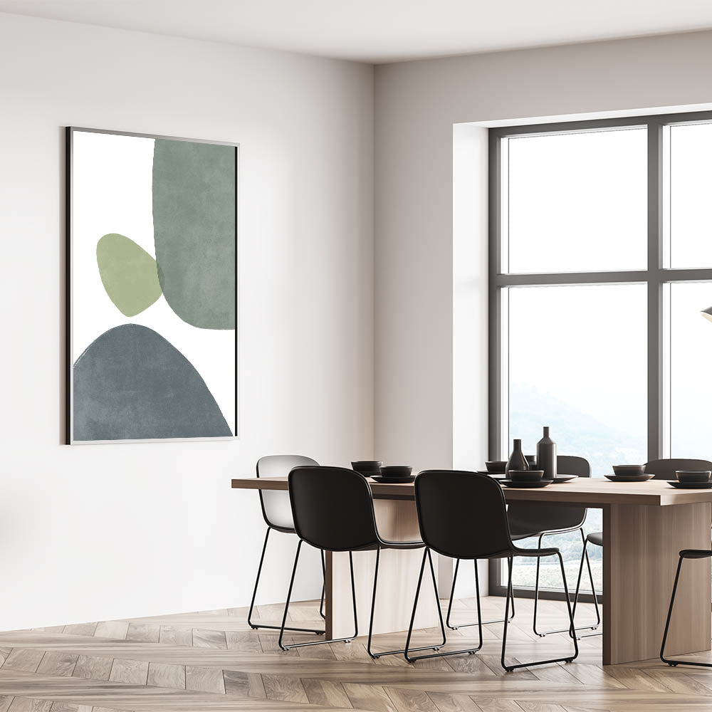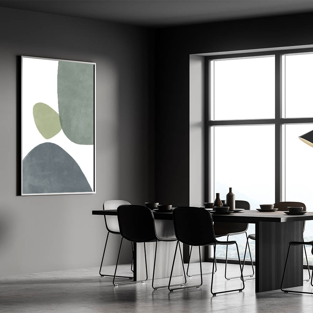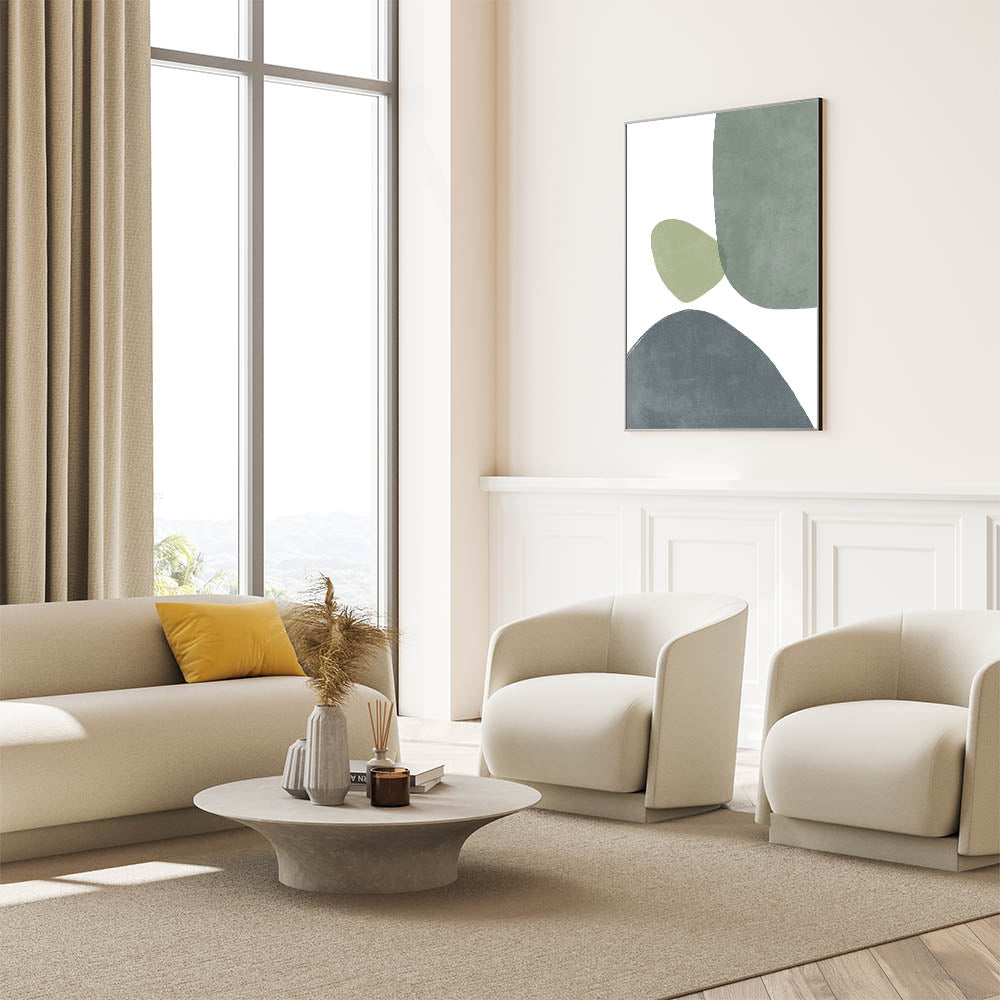 Bring a touch of mid-century modern style to your space with this stunning geometric art piece. Featuring soft, overlapping shapes in calming shades of green and gray, this minimalist wall art perfectly blends retro-inspired design with modern aesthetics. The abstract patterns evoke the essence of vintage modern style, creating a balanced and harmonious composition that enhances any room’s decor. Whether you're looking to add subtle sophistication to your living room, bedroom, or office, this artwork is the perfect addition for those who appreciate minimalist and mid-century decor.