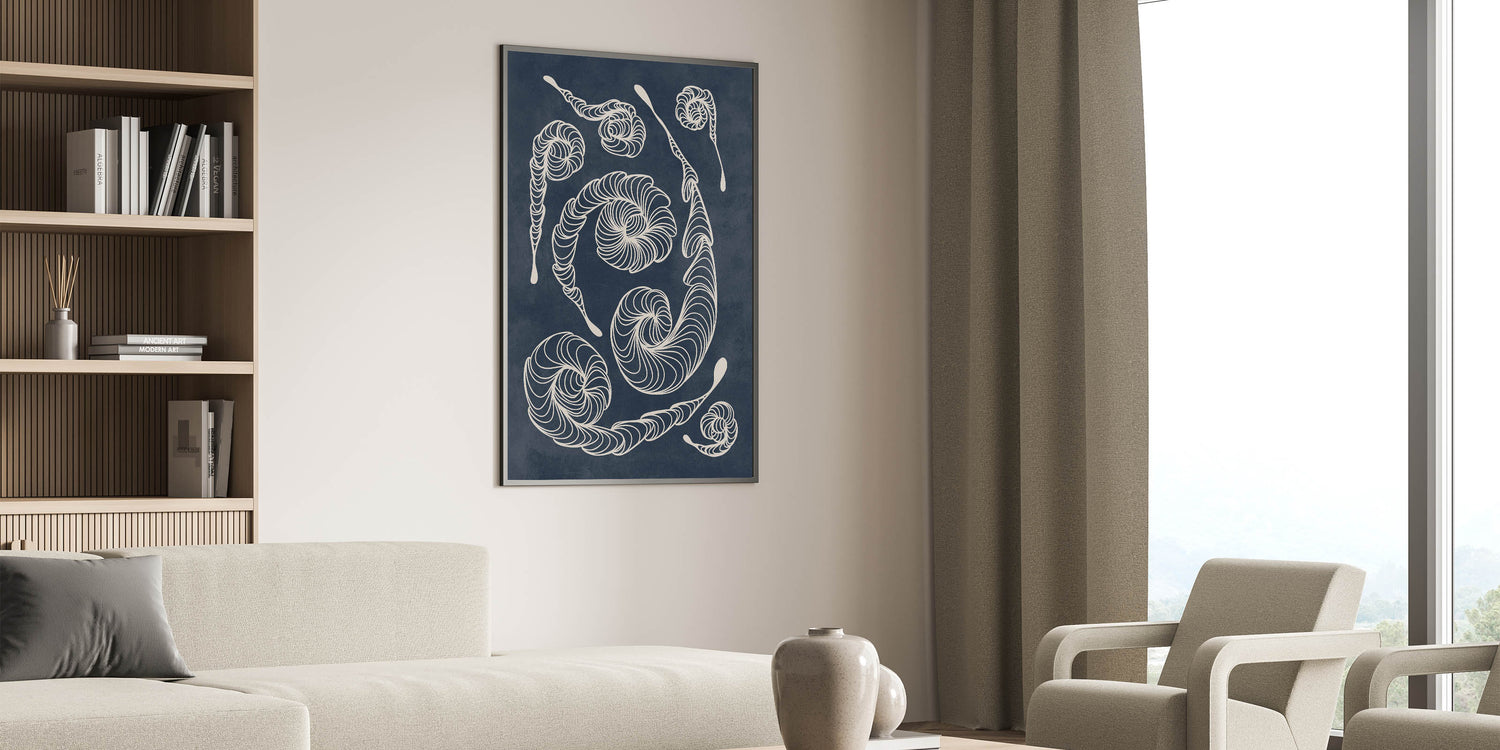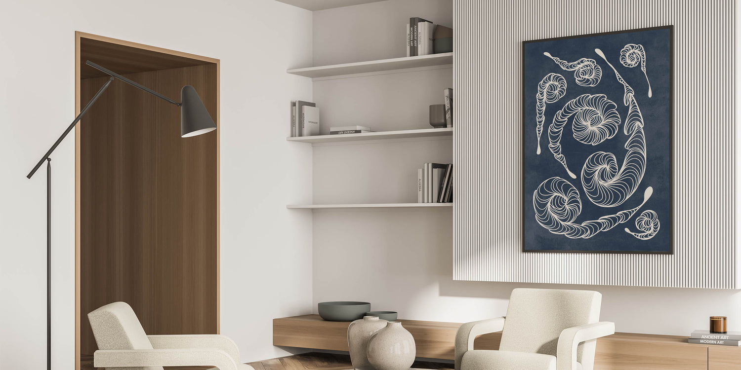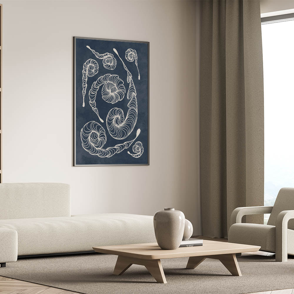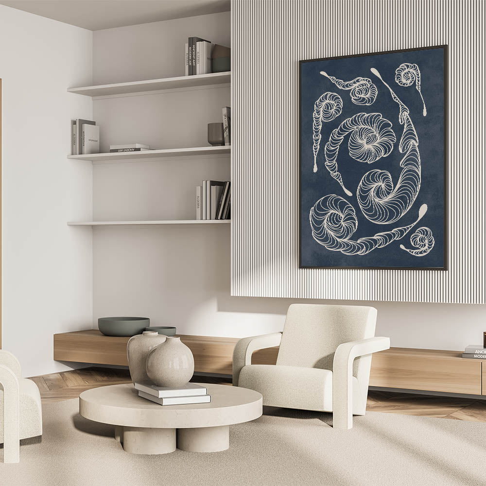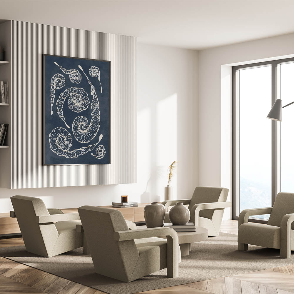 Transform your space with this captivating Mid-Century Modern Art piece, featuring an intricate retro spiral design. The white flowing patterns against a deep navy blue background bring out the elegance of geometric wall decor, making it perfect for those who appreciate both minimalist aesthetics and vintage-inspired styles. This artwork can effortlessly enhance any living room, bedroom, or office with its unique charm.