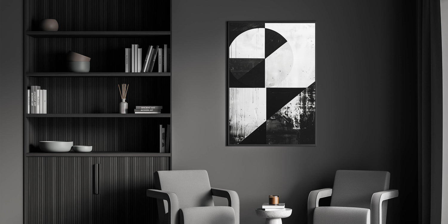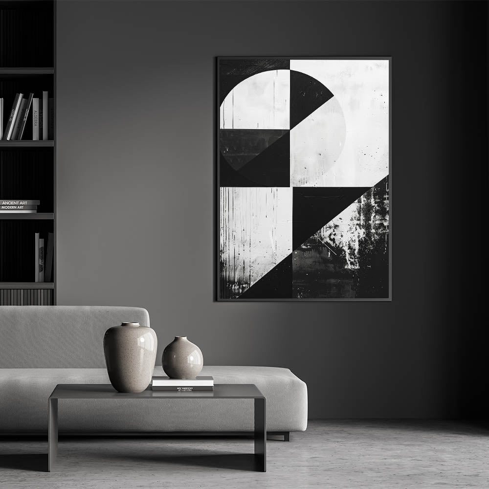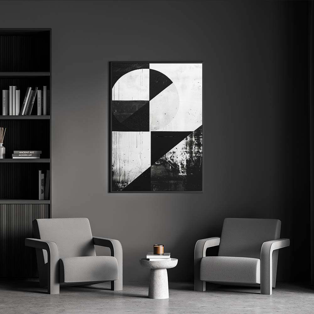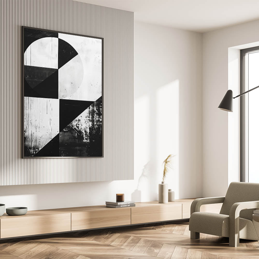 Bring a bold and contemporary statement into your home with this striking Mid-Century Modern black-and-white geometric wall art. The minimalist design features sharp lines and contrasting shapes, making it a perfect fit for modern, industrial, or minimalist spaces. The monochrome palette adds a timeless quality, allowing this piece to stand out while easily blending into a variety of decor styles.