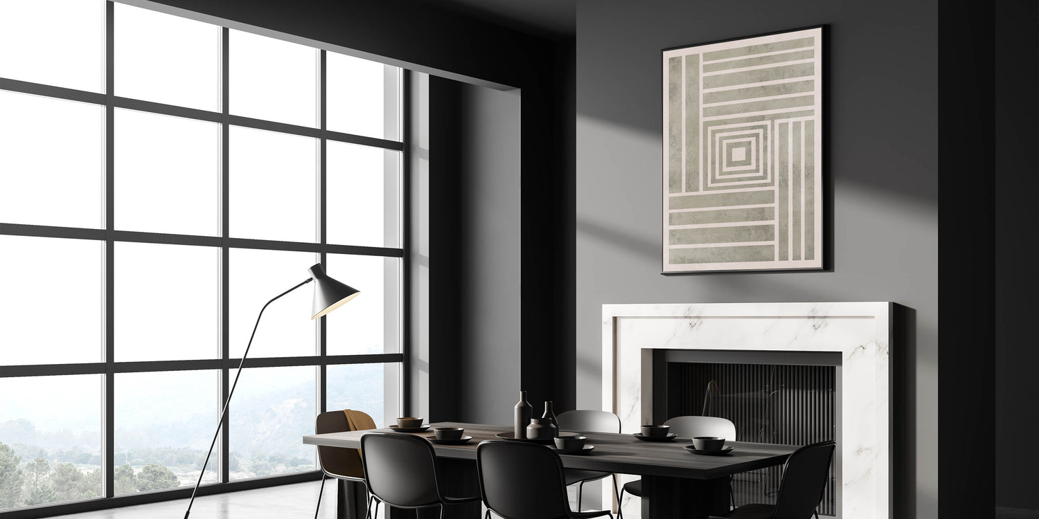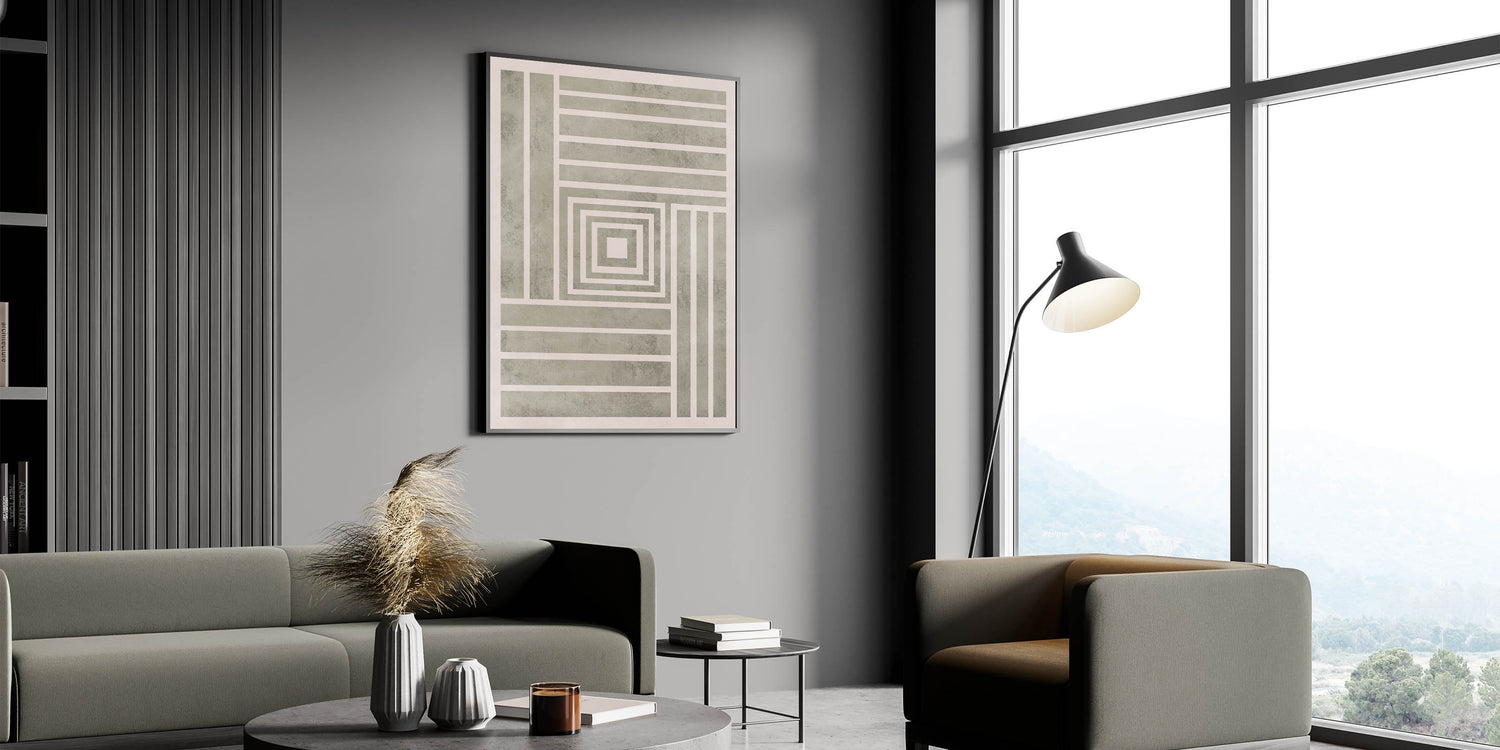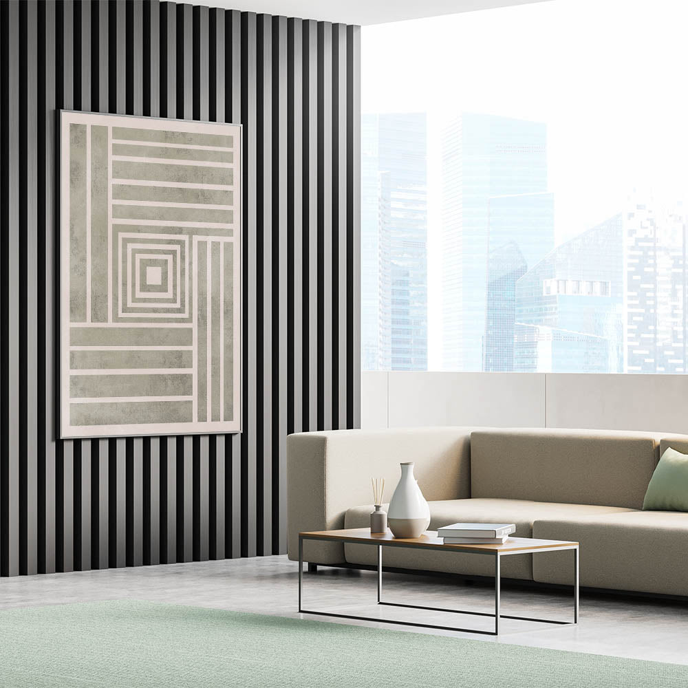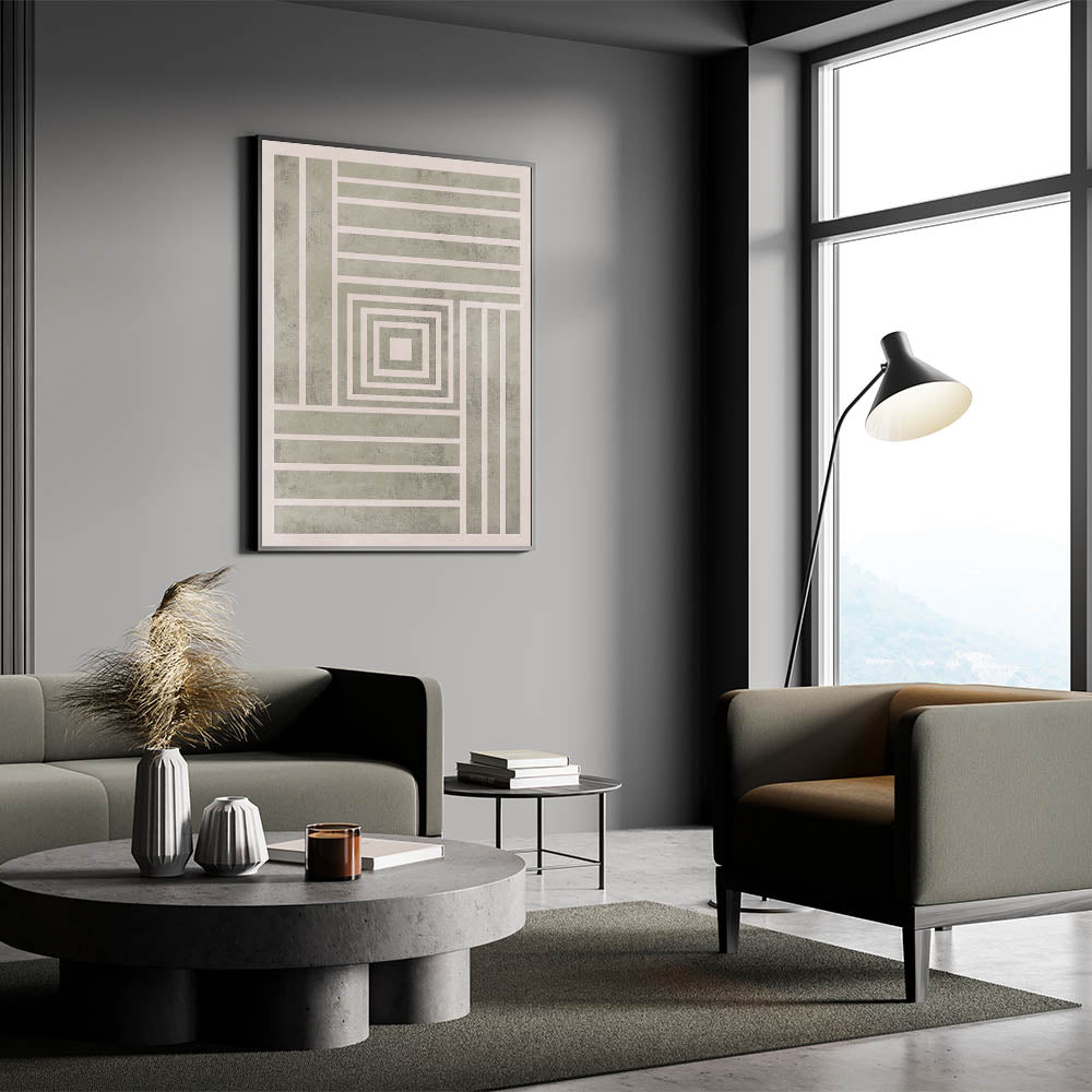 This Mid Century Modern Art piece features a striking geometric design with concentric squares and bold stripes, bringing a structured, minimalist aesthetic to your home. The clean lines and neutral tones of the piece make it ideal for modern interiors, while the retro feel of the pattern adds a touch of vintage modern style. This artwork is perfect for enhancing your space with geometric wall decor, offering both balance and sophistication.