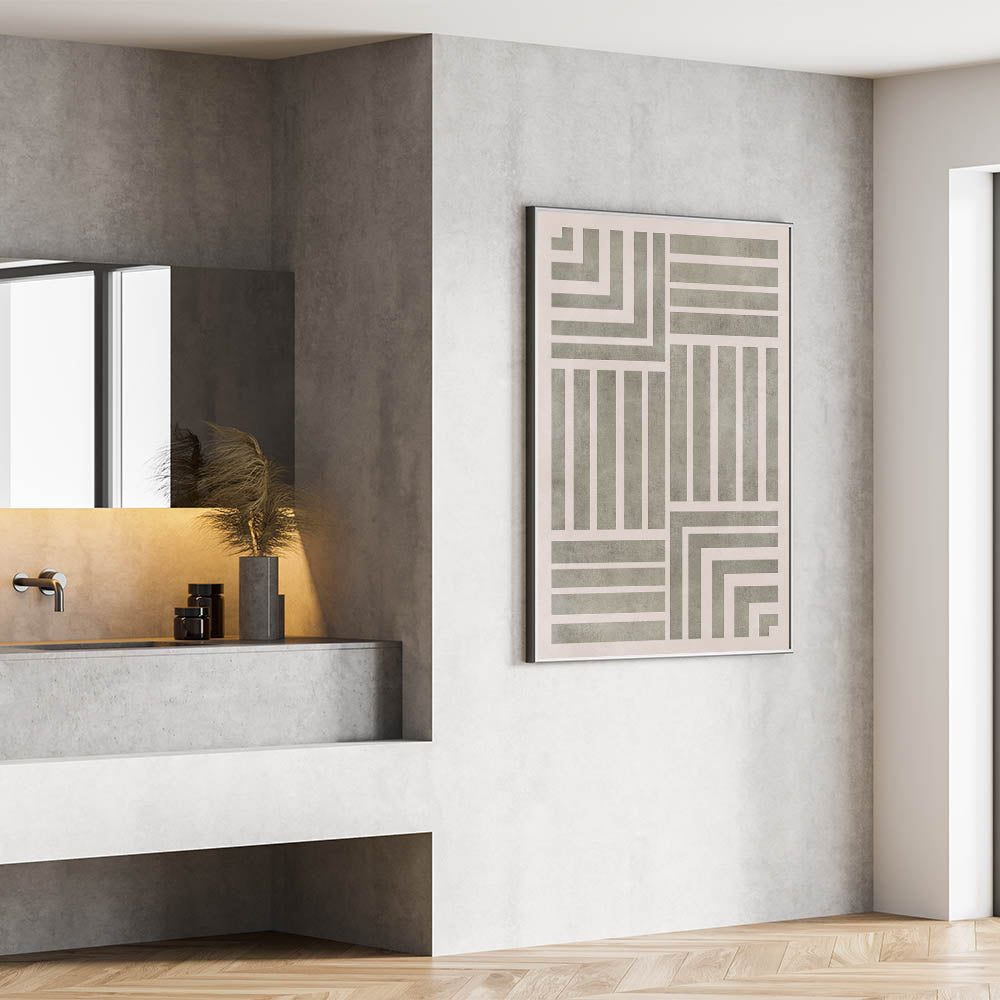This Mid Century Modern Art piece is a bold representation of geometric design, featuring a striking combination of vertical, horizontal, and angular stripes. Its minimalistic and structured layout is perfect for those looking to add a touch of retro-inspired decor to their space. The muted, earthy tones of the artwork allow it to seamlessly blend into both modern and vintage interiors, making it a versatile piece of vintage modern style art.