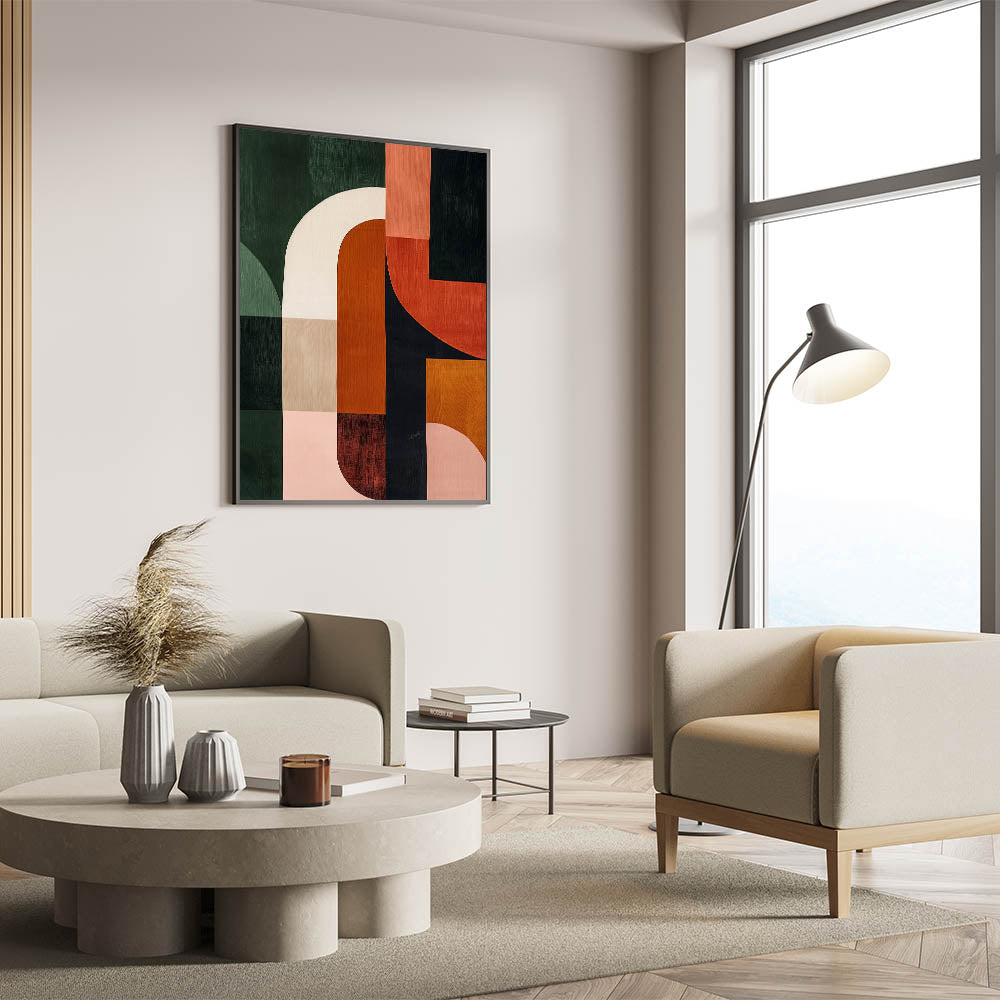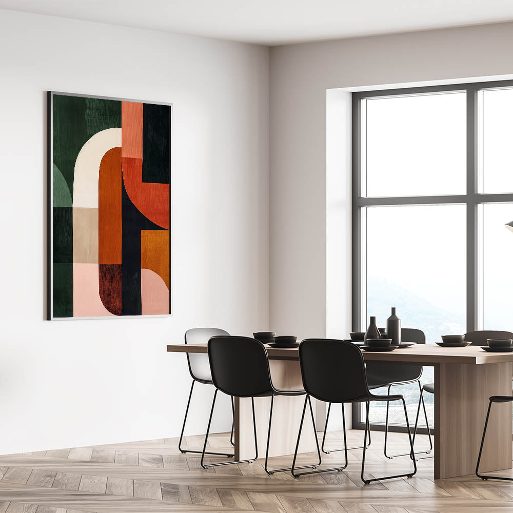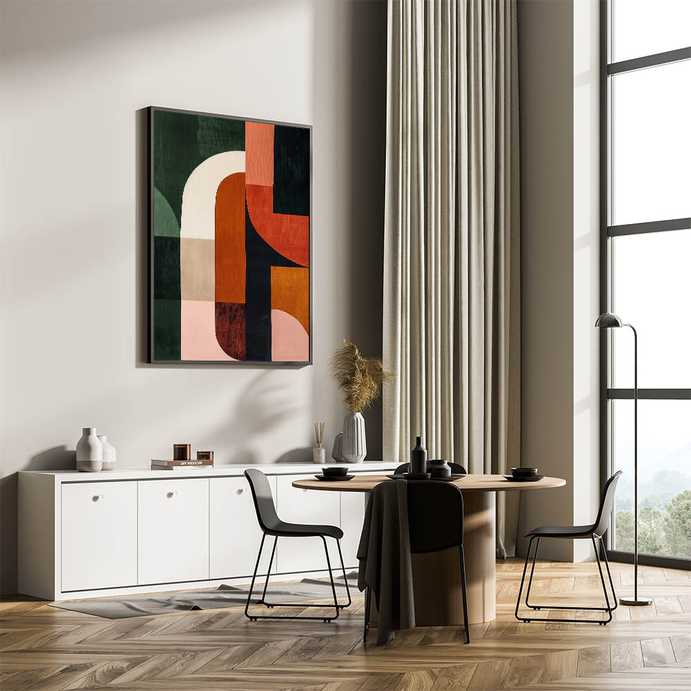 Elevate your home’s décor with this bold Mid-Century Modern wall art featuring striking geometric patterns. This abstract design is a stunning representation of retro-inspired art, perfect for those who appreciate a modern minimalist aesthetic. The deep, earthy tones combined with unique shapes bring a touch of vintage charm, making this artwork ideal for living rooms, offices, or bedrooms.