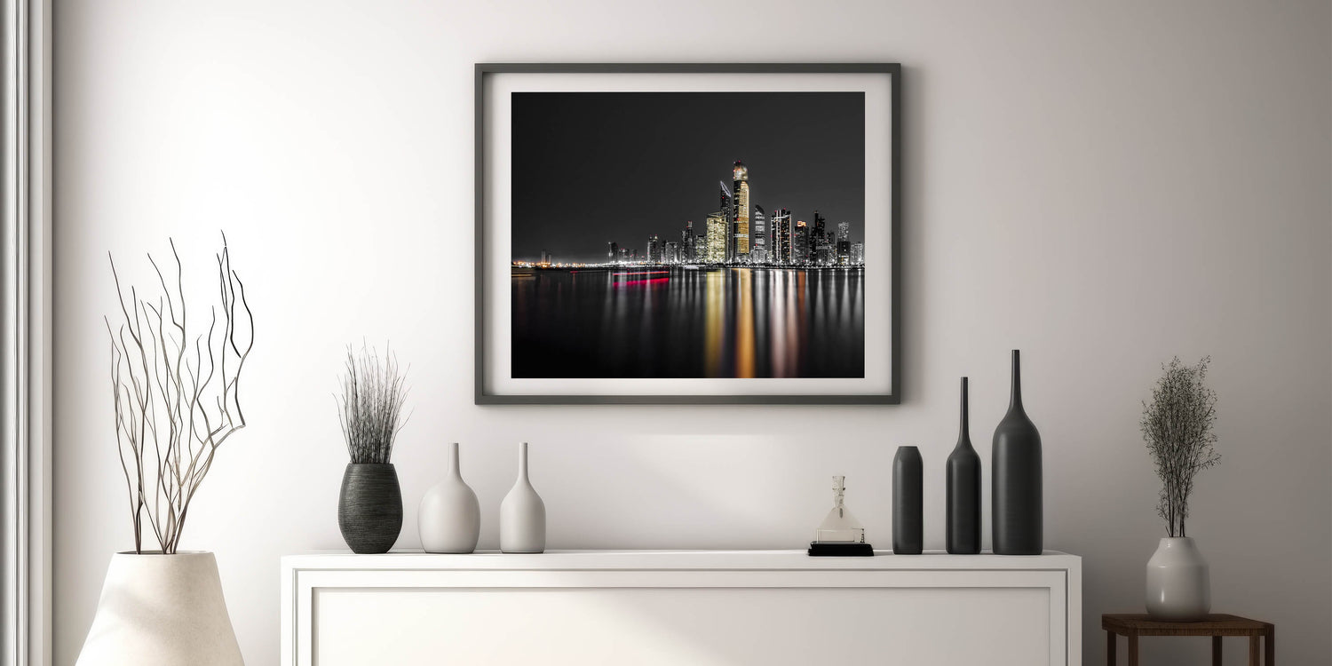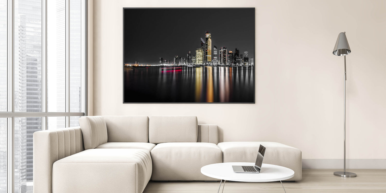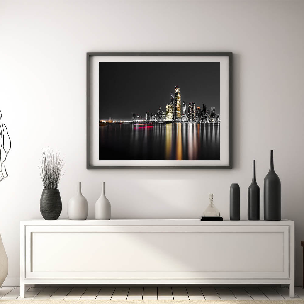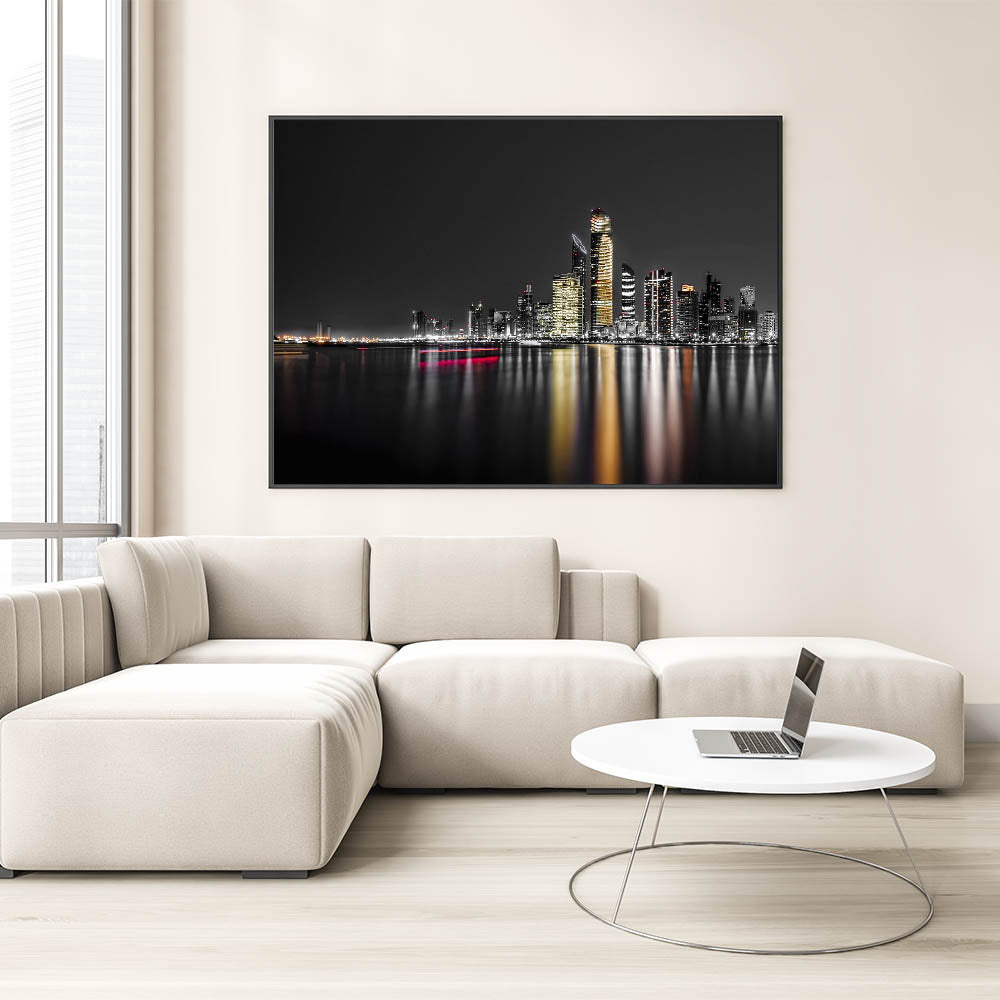 This breathtaking wall art captures Abu Dhabi's skyline at night, reflecting its towering architecture and vibrant lights on the tranquil waters. The dramatic contrast between the city’s golden hues and the black-and-white background adds a modern and striking touch to any space. Perfect for lovers of contemporary urban landscapes, this high-quality Abu Dhabi cityscape print will elevate your home or office décor with its bold, modern design.
