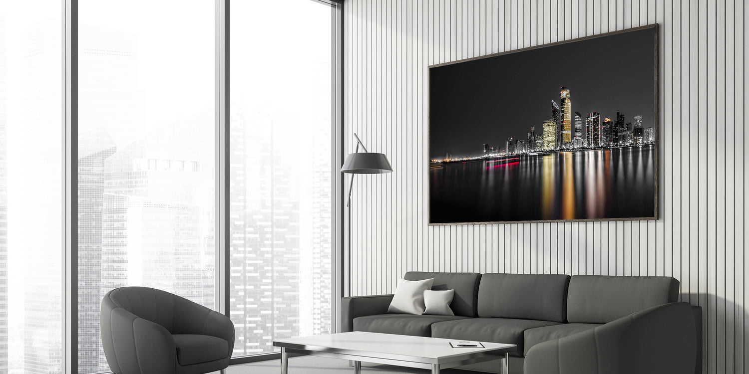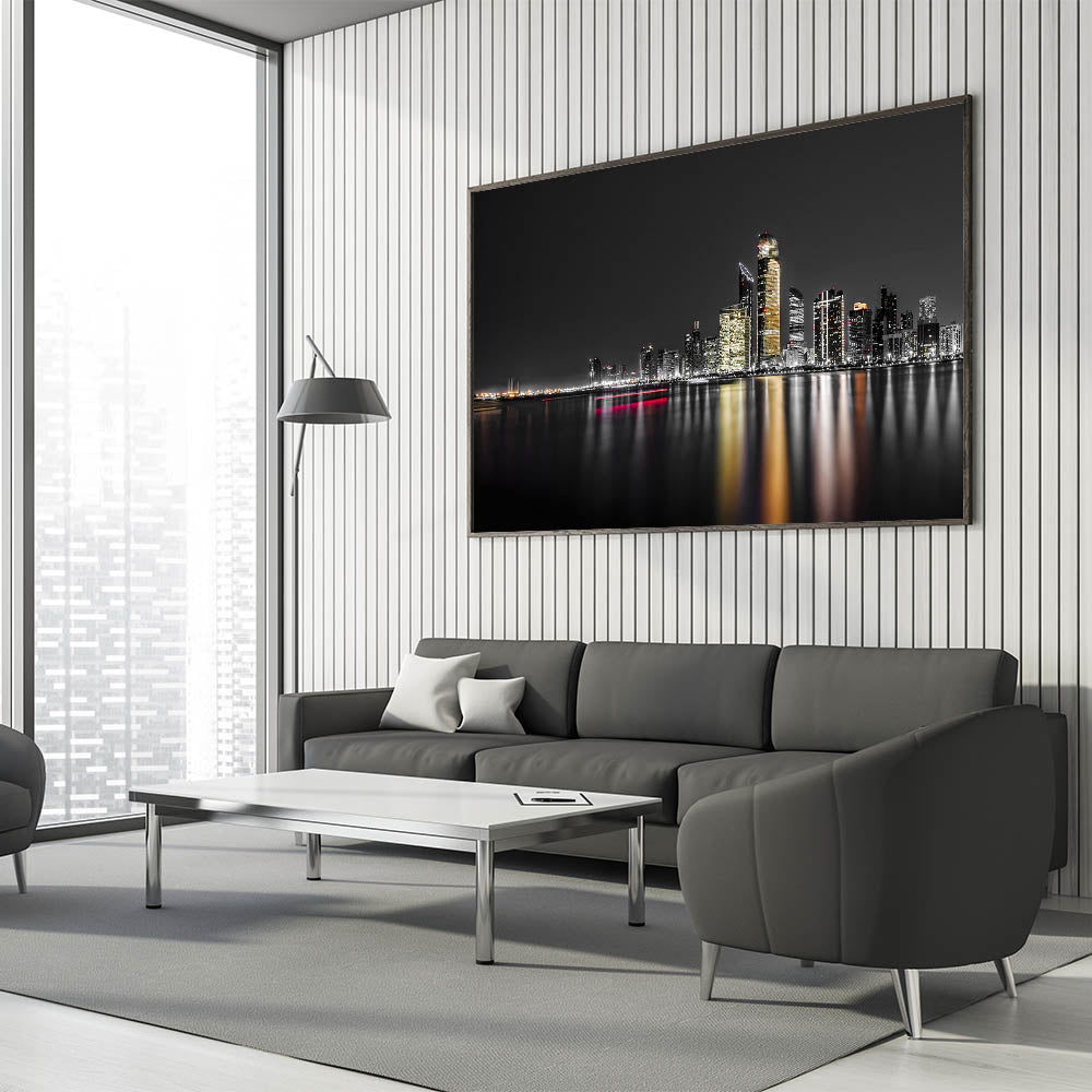 Bring the vibrancy of Abu Dhabi’s nightlife into your interior space with this striking cityscape art. Whether for your home or office, this artwork blends modern architecture with a dramatic nighttime view, making it an eye-catching statement piece.