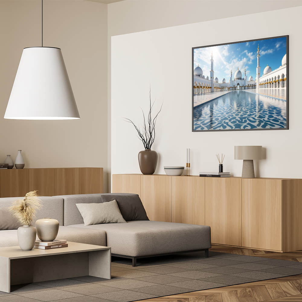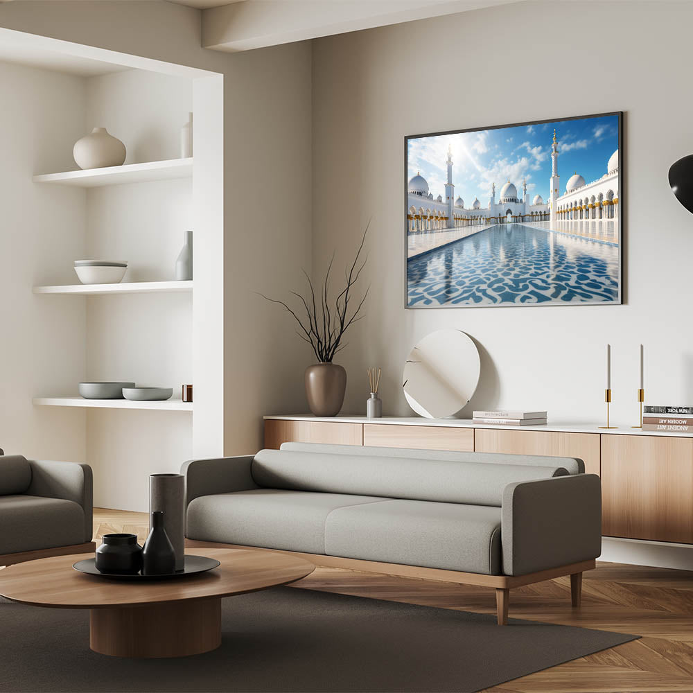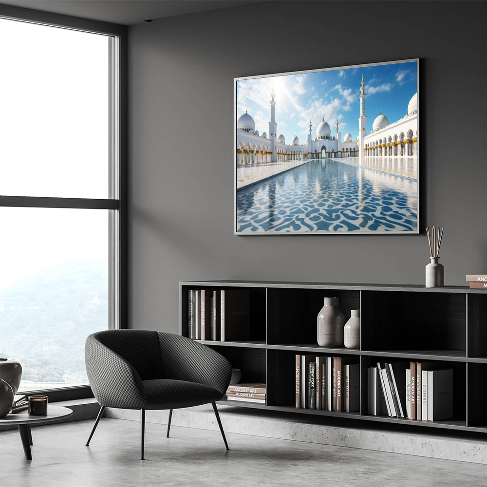 This wall art embodies the essence of peace and tranquility, showcasing the majestic Sheikh Zayed Mosque in all its glory. It's the perfect way to bring a touch of Abu Dhabi's cultural heritage into your space.