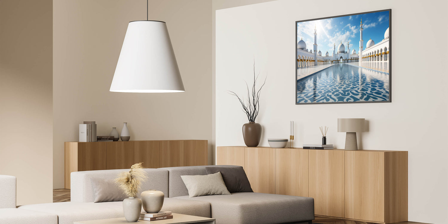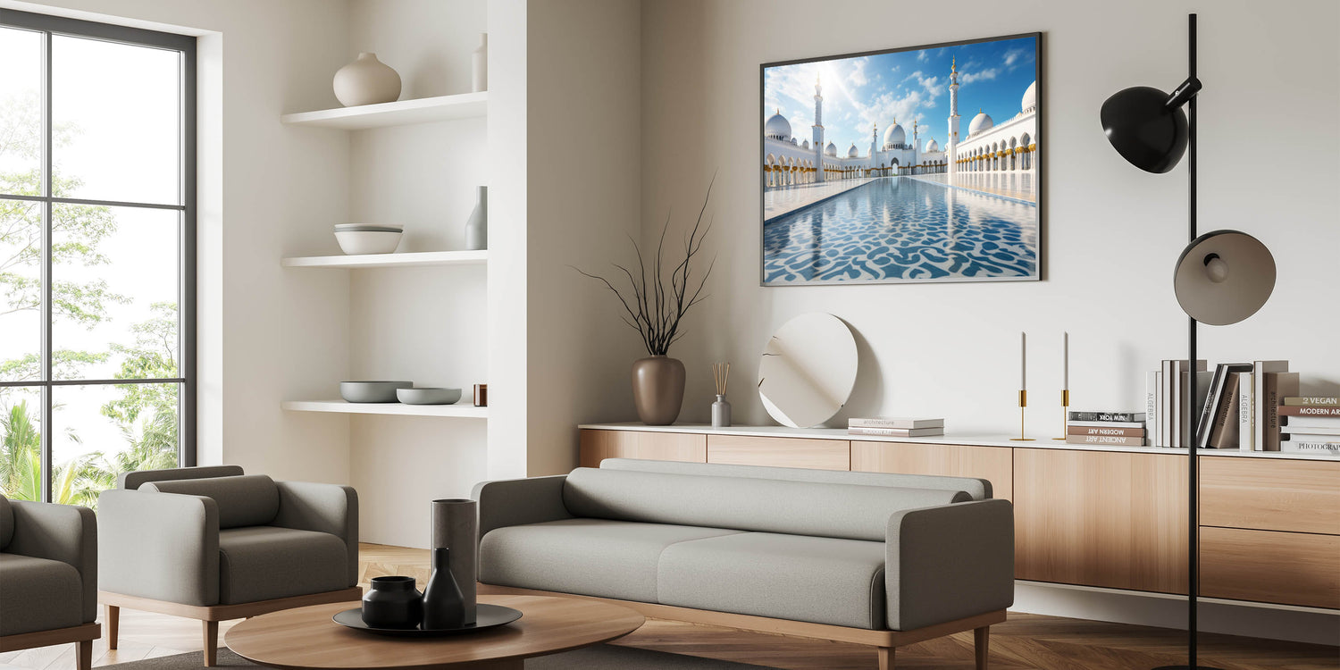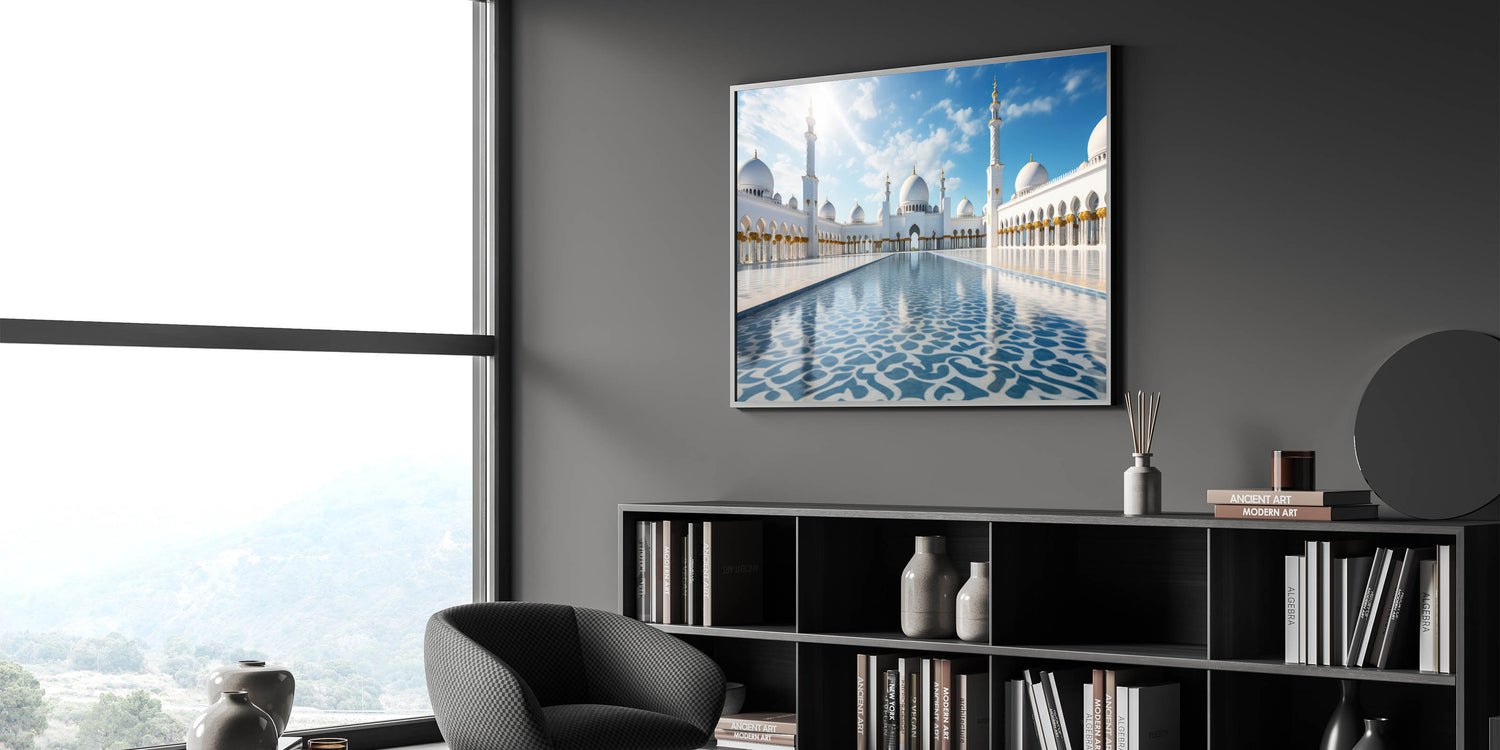 This wall art embodies the essence of peace and tranquility, showcasing the majestic Sheikh Zayed Mosque in all its glory. It's the perfect way to bring a touch of Abu Dhabi's cultural heritage into your space.
