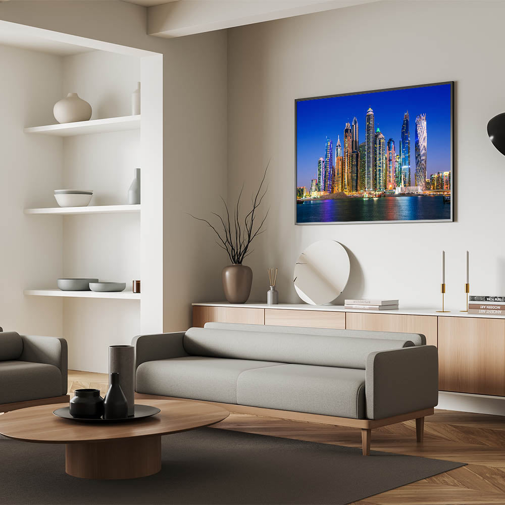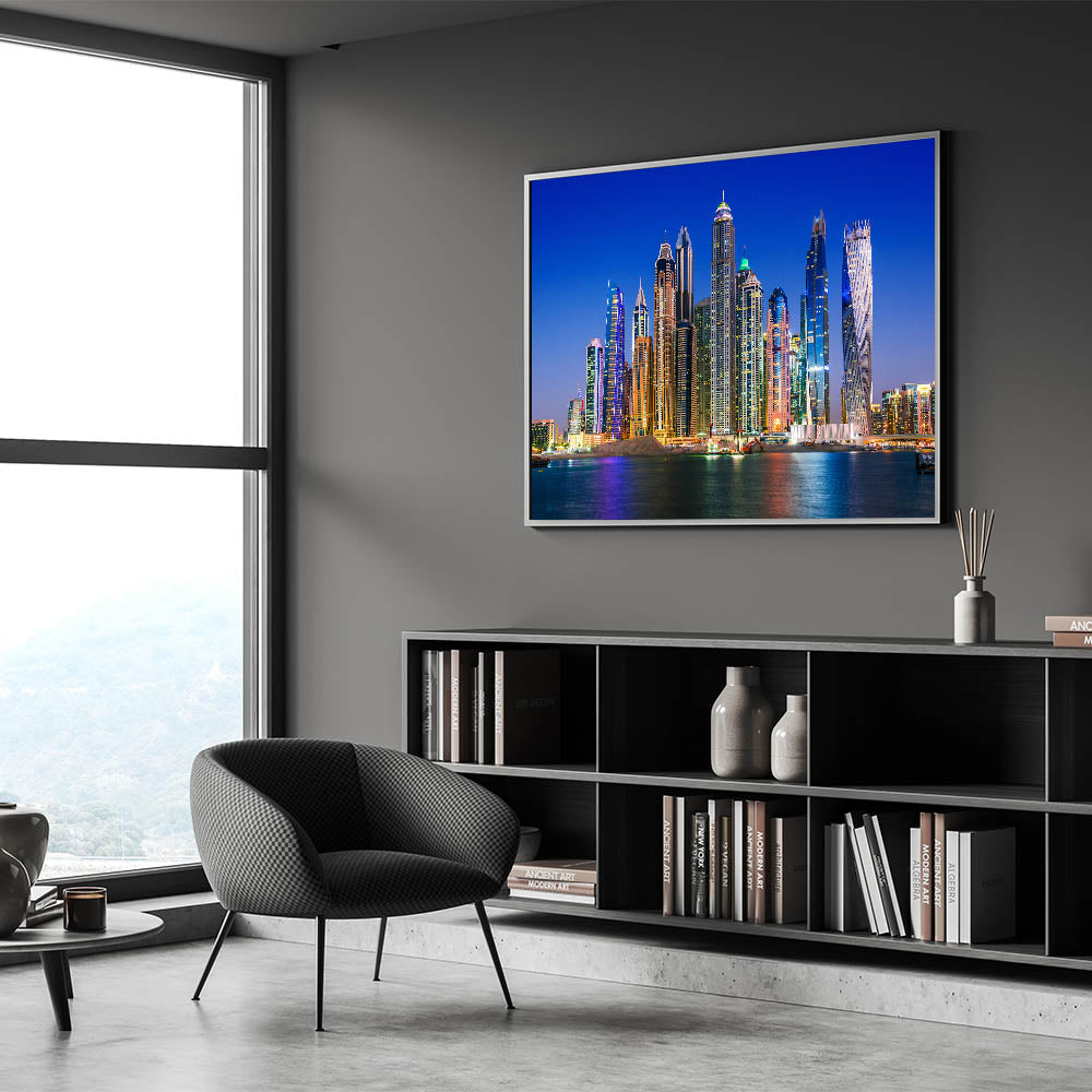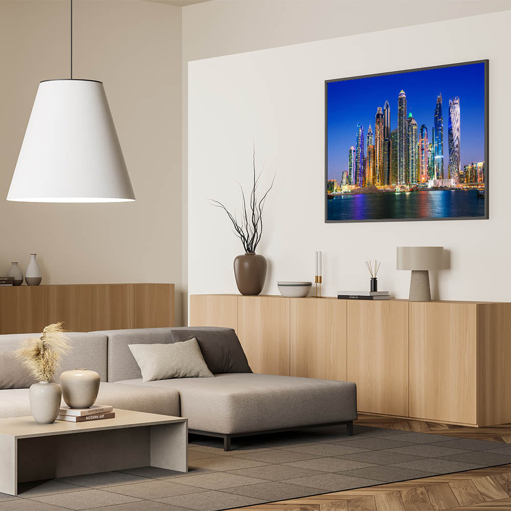 Illuminate your space with the vibrant beauty of Dubai’s skyline at night with this stunning wall art. Featuring the dazzling lights of the city’s most iconic skyscrapers, this high-quality Dubai wall art perfectly captures the essence of modern architecture and urban sophistication. The shimmering reflections on the water add depth and elegance to this piece, making it ideal for any contemporary setting. Whether you're looking for Dubai skyline photography or striking cityscape wall decor, this artwork will transform your space.