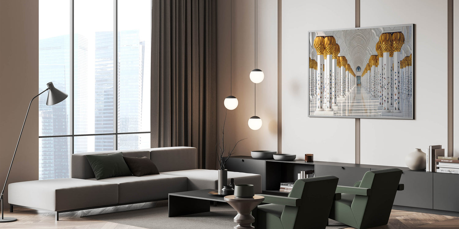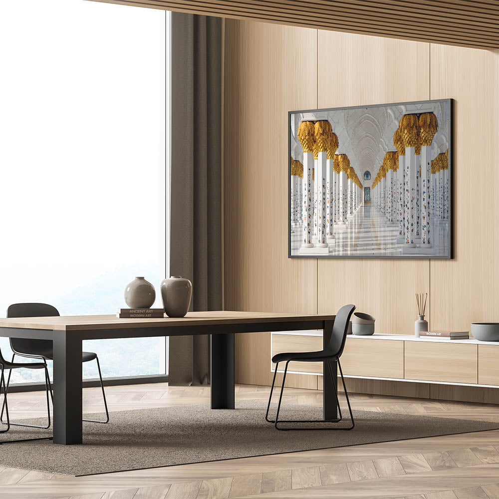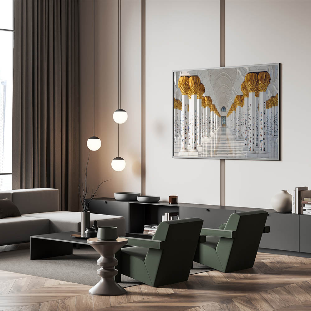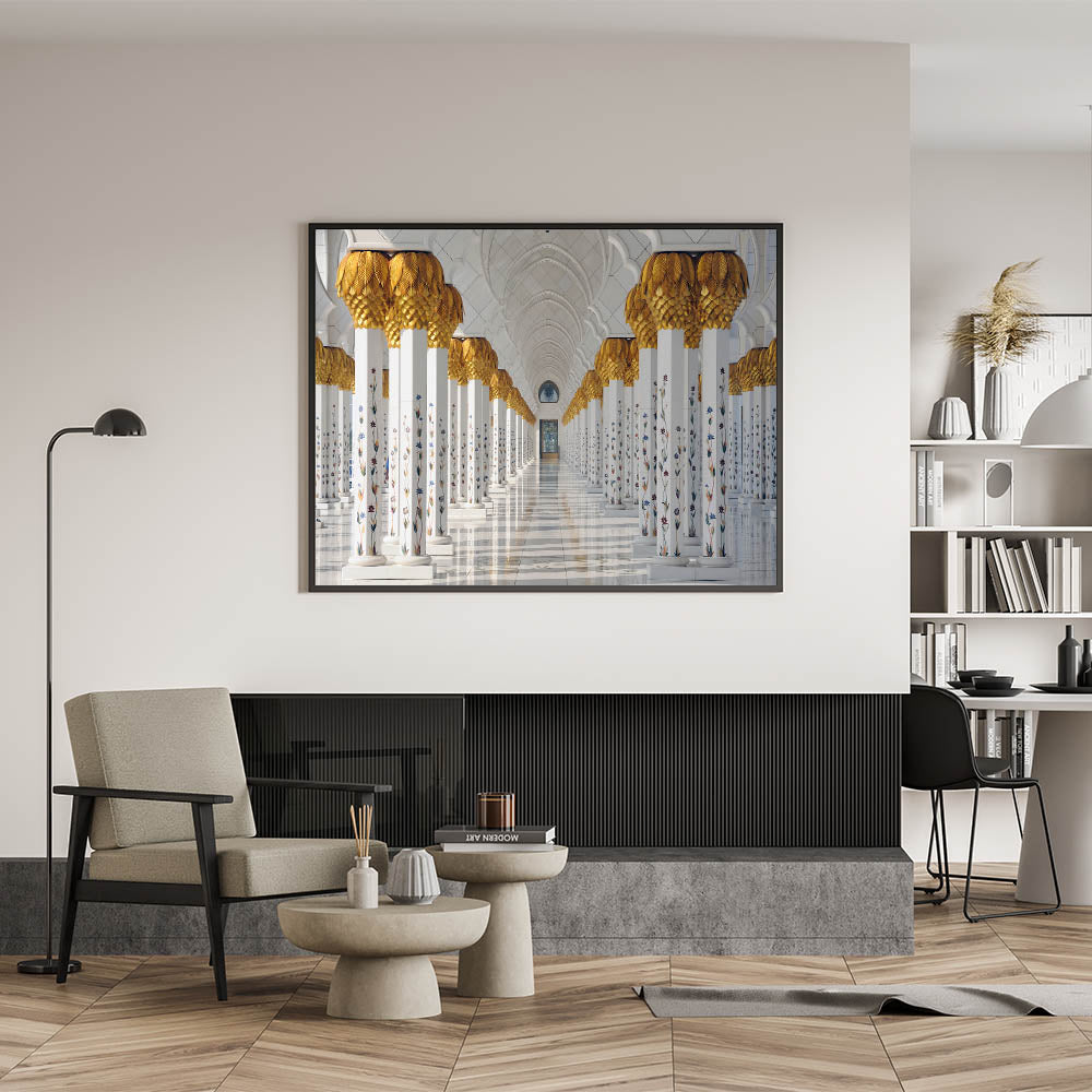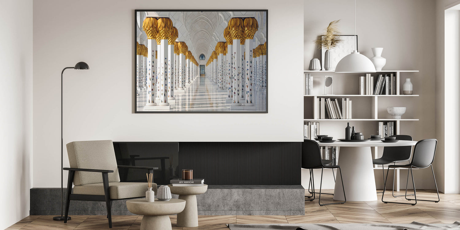 Adorn your walls with this elegant representation of Abu Dhabi’s architectural marvel, the Sheikh Zayed Mosque. This stunning art print captures the mosque's intricate columns, adorned with golden details and floral accents, creating a sense of grandeur and timeless beauty. Perfect for anyone looking to add a touch of Middle Eastern charm to their living space or office, this Abu Dhabi art print stands out as both modern and traditional.